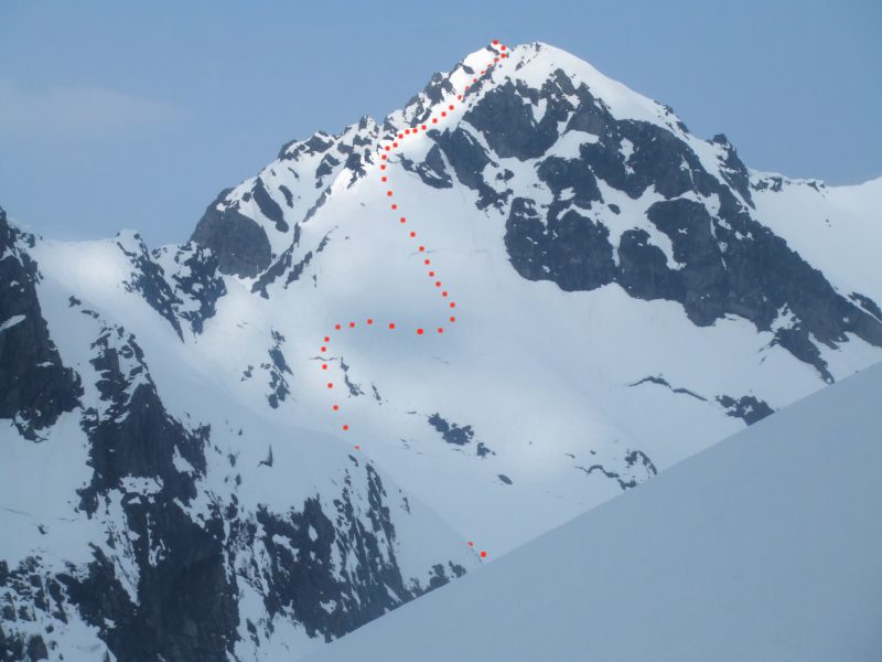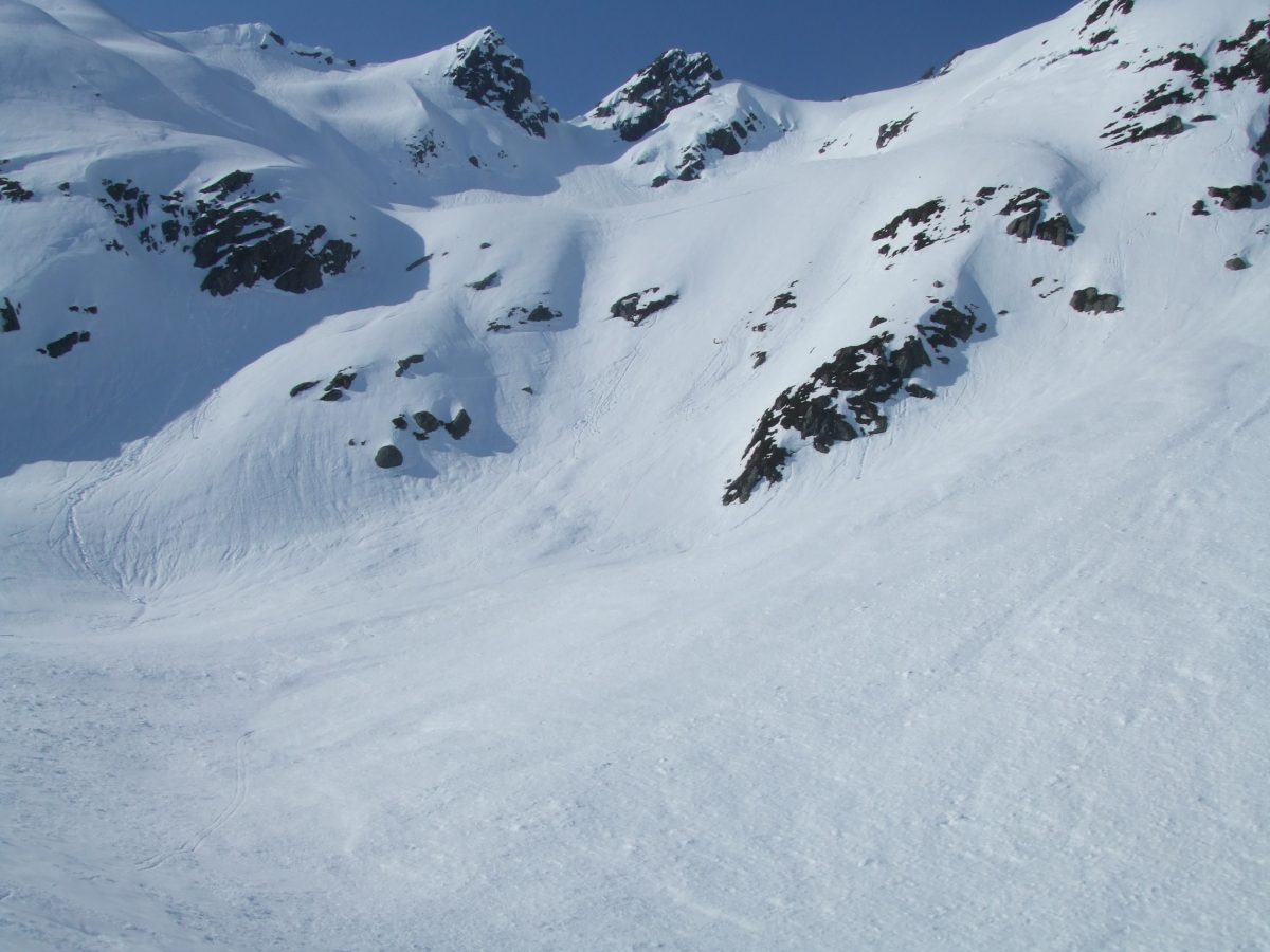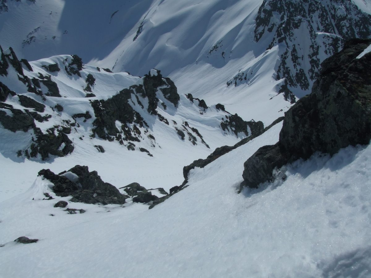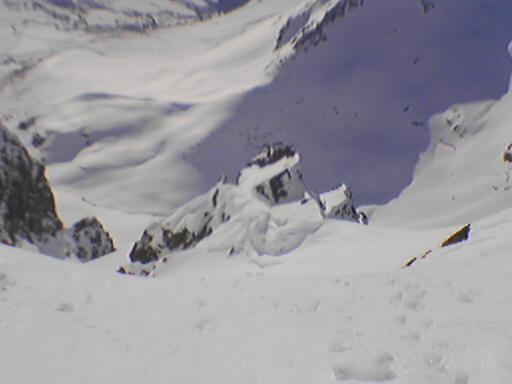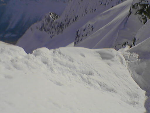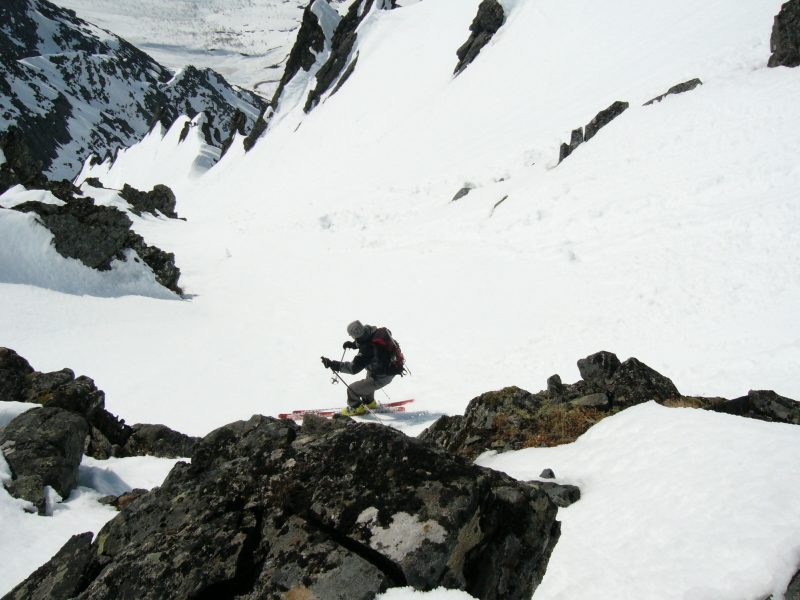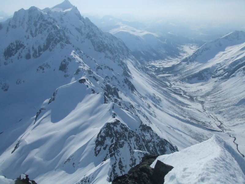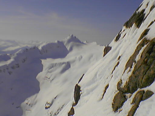 Jeg kjørte Sydcouloiren på Romedalstinden i dag. Denne har jeg ventet på siden i 2005 da jeg kjørte forbi i toppen og lurte på om det går å kjøre ned her, for det såg utrolig arti ut med pinakler og formasjoner i kantene nedover. En slik tur krever rette forhold, så det ble ikke i fjor, og det var heller knapt så det kunne gå i dag også. Det er rett og slett for varmt. Tur ble det, med Bamseski i dag, for det kan hende det er greit å ha noe man kan blåse på med hvis det trengs. Da går det jo ikke så fort oppover, og slik som snøen var oppover så var det antageligvis et blodslit uten like, for jeg konstaterte at jeg var skikkelig sliten når jeg kom på toppen. Slik som forholda var i dag, og med såpass utsatt terreng, så var det mye annet å ta seg til enn å kjenne så nøye etter hvor sliten man var. Allerede opp første henget så er det trasig varm og bløt snø, så dette lover jo ikke bra. Men det er bare å fortsette oppover, det kan jo bli bedre. Det ble det ikke. Turen opp Sydcouloiren går opp tre bratte heng før den avsluttes opp ei renne som ender opp ved toppen. Over nederste og midtre heng er det store flate partier, selve hengene er korte og bratte (faktisk ekte halvbratt og vel så det) og artie å kjøre. I bunnen av renna er det noen hamrer og en pinakkel med ei alternativ renne på innsida. Der alt dette møtes er det for trangt, slik at terrenget blir ganske trasig. Det er et par plasser der det er fatalt å reise i vei, fordi man reiser utfor ting rett nedfor. På det smaleste er det bare en smal snøegg, med for bratt på begge sider når snøen er så bløt. Det er partier i og omkring denne passasjen som bikker 45 grader og vel så det (altså halvbratt). Renna i toppen er knapt 40 grader og romslig og grei, fin og arti å kjøre, hadde det bare ikke vært for exiten som er svinaktig utsatt og grusomt sidebratt og small, helt ut på kanten mot Romedalen. Forbi det trasige partiet tipper jeg ned øverste henget, forbi en smeltesprekk, etter denne er det trygt. Det er fremdeles bratt nok, så flater det litt ut, og jeg velger å hoppe neste smeltesprekk, da brukes resten av henget ned mot flata til å ta ned farta slik at jeg greier å stoppe på flata for å ta bilder og konstatere at det gikk i grunnen ganske bra. Neste henget er lite, men har også en arti smeltesprekk i toppen. Siste henget har et par rennelignende formasjoner som er fine, også her er det ganske bratt ned. Føret var egentlig ikke så bra, tungkjørt og trasig i brattene, og tildels et slags hekteføre der det flata ut, noe som betydde at det ikke fristet å slippe på mye fart ned henga. Jeg tror østsida er bedre å kjøre, fordi den er sannsyligvis ikke så varm, og den er heller ikke like utsatt. Her er det stort sett å holde seg på beina og passe seg for smeltesprekka i enden av bratta, og ikke utfor hamrene midt nedi bunnen av sida, så går det greit. Bildene viser ikke så mye spor, for snøen reiste der det var litt bratt. Men det gjør ikke så mye, for spora var ikke fine uansett. -------------------- Om Romedalstinden: Romedalstinden er et av de fineste og mere alpine fjell i Sunnmørsfjella, alle sider er høvelig bratte og særlig vinterturer er spektakulære prosjekter. Den ligger mellom Kolåstinden og Molladalen, på vestsiden av Hjørundfjorden. Her oppe går man stort sett i fred, det er sjelden man møter folk her og om vinteren er det omtrent førstesporgaranti uansett linjevalg. En vanlig vei opp er fra nord, opp ryggen før pinnakkelen, over i østsida og så opp på ryggen som følges til topps. Ryggen er som regel mye breiere om vinteren, helt til man trakker gjennom skavelen. --------------------