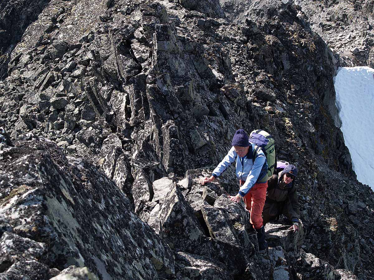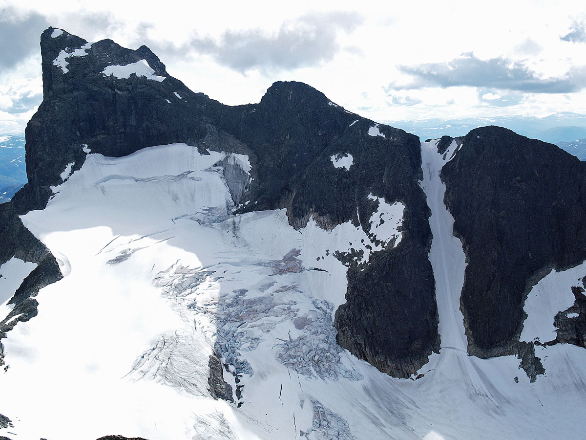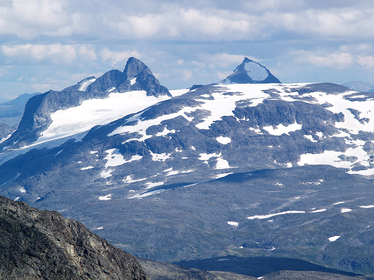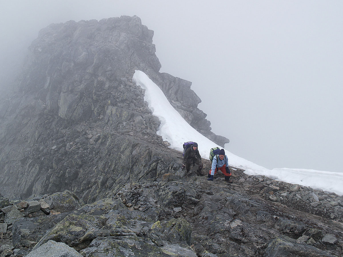 Det var nå gått to år siden jeg sist var på en 2000-meterstopp, så da jeg fikk forespørsel om å være med på en tur til Horungane siste helg, svarte jeg ja. En hyggelig fornorsket danske, Walter, som jeg hadde vært på tur med for mange år siden, driver og samler 2000-metringer. Også den ene av Hans-ene som jeg hadde gått mye sammen med og som også hadde hatt mange turer med Walter, var med. Da yr.no spådde fint vær fredag og lørdag, men ikke søndag, dro vi avgårde torsdag ettermiddag. Fredag gikk vi på Austabottind, men finværet som var lovet, slo ikke helt til. Tåka lå ganske langt nedover fjellsidene, og vi opplevde også lett snøfall uten at det maktet å gjøre fjellet vått. På toppen gratulerte vi Walter med en ny topp, til og med en kremtopp. Mens vi satt på toppen kom det opp et ungt, hyggelig dansk par bosatt i Sogndal. Det var med andre ord flertall av dansker på toppen. Vi ble sittende lenge å prate. Enhver ekspedisjon bør jo ha et vitenskapelig aspekt ved seg. Jeg hadde derfor intensjoner om å undersøke om en kunne se fjorden fra toppen (diskutert for et par år siden på fjellforum). Desverre ødela tåka denne muligheten, og det ergret meg. Tilbake på Vesttoppen satt to hyggelige karer som vi ble sittende å prate med. De hadde tenkt seg videre, men den minst fjellvante syntes det så litt overveldende ut så de valgte å snu her. Det samme gjorde tre ungdommer som kom opp. Lørdag sto de tre Soleibotntindane på programmet. For å få en rundtur ut av det, valgte vi oppstigning over Lauvnostind. Jeg hadde gått opp her for 10-15 år siden med en annen kamerat og kjente derfor ruta. For å komme ned i skaret mot Nordre uten å rapellere, må en klyve ned en kløft i vestsiden. Et sted nede i kløfta må en henge etter armene for å finne feste for føttene. Nederst må en ut av kløfta rundt et hjørne, og her er det en fordel å ha god balanse. Dagen før hadde jeg fra veien studert oppgangen til skaret mellom Nordre og Store og kunne bare se en snøflekk som jeg regnet med var grei å passere. Vi hadde derfor valgt ikke å ta med isøkser og stegjern. Nå oppdaget vi at snørenna gikk helt opp i skaret, og vi angret på å ha etterlatt snøutstyret. Da vi kom bort til renna, var snøen hard som betong og umulig å forsere uten utstyr. Til høyre for renna så oppstigningen grei ut, men det var veldig løst. Vi valgte derfor vekselvis å gå tett sammen eller å klyve hver for seg når ingen sto i fall-linjen. Selv om klyvingen foregikk med stor forsiktighet, løsnet en stein som etterhvert tok med seg et helt regiment av steiner og blokker. Med dunder og brak styrtet de utfor og fordelte seg utover breen nedenfor. Vi kom opp til ryggen litt til høyre for dypeste skaret. Da jeg var på Nordre for første gang på 80-tallet engang, fulgte vi en hylle i vestsiden som gikk helt over til nordryggen, mens jeg siste gang fulgte hylla et lite stykke før vi tok opp på sydvestegga. De andre syntes siste alternativ så bratt ut og ville prøve det første alternativ. En glemmer mye etter mer enn 20 år, og denne hylla viste seg å ha et brudd som ikke så helt enkelt ut. Det hang noen slynger oppe i veggen som vel viste at andre også hadde ansett dette for ikke helt greit. Vi var nok tøffere da vi var yngre. Jeg foreslo å gå tilbake til det første alternativet, og da de andre så hvor greit det var å klatre opp her, kom de etter. Sydvest-egga bort til toppen er tildels meget smal og morsom å klyve. Ett sted var en metode å ta tak over egga og spenne beina mot fjellet og entre bortover. Etter å ha gatulert Walter med en ny topp, returnerte vi til skaret. På grunn av snøkonsistensen vi hadde erfart, var jeg litt spent på oppgangen til Store for jeg hadde sett fra Nordre at det gikk en lang snørenne oppover på siden av skarpeste ryggen som har flere hammere. Detaljene her kunne jeg ikke huske fra de tre gangene jeg hadde gått her tidligere. Nå gikk det greit å holde seg på fjellet på venstresiden av snørenna. Da vi var kommet nesten på høyde med øverste del av snørenna, var det en hammer som jeg anså for å være klatrebar, men jeg ville først undersøke snøkonsistensen. Denne viste seg nå å ha blitt en helt annen enn det vi erfarte nedenfor skaret. Dermed kom vi enkelt opp på der hvor ryggen flater ut. På Store Soleibotntind satt det flere mennesker. Vi kom i prat med et ungt par. Hun var dansk og han var sønn av en fjellsportmann i Hamar fjellsportgruppe som jeg kjente navnet på. De slo følge med oss bort på Søndre. Når en følger hyllene til høyre ut av kløfta mellom toppene, ser man en varde på andre siden av et sva. Med knudret fjell ville helningen på svaet ikke være problematisk, men fjellet er nærmest blankpolert og med en svart, kortvokst mose som i tørr tilstand blir rene støvet når den tråkkes på. Dette var med på å minske friksjonen. Dessuten er det meget magert med tak inne ved den loddrette hammeren over svaet. Men alle kom velberget over, og etter en kort stund sto vi på Søre Soleibotntind og kunne gratulere Walter med tredje topp for dagen. Været var fint og i kikkerten kunne vi se flere personer på ryggen og toppen av Store Austabottind. På oppstigningen til Nordre Soleibotntind kunne vi se to klatrere som tydeligvis hadde gått etter anvisning fra den gamle føreren for Horungane, nemlig ved å gå til høyre etter skaret. De plundret tydeligvis med dette opptaket som er angitt som firerklatring i føreren. Etter å ha tatt fram tauet, kom de seg tydeligvis greit opp. Første gang jeg var på Søndre på 80-tallet, fortsatte vi mot Soleiskaret og gikk ned Berdalsbreen. Nå returnerte vi mot Store. Walter ville ha med seg sekundærtoppen nær kløfta mot Store som han mente hadde 20 m pf. Vi stakk derfor oppom denne. Da vi kom til det før omtalte svaet, syntes jeg det var mer vemmelig å gå ned dette enn da vi gikk opp. Da jeg var kommet over, undersøkte jeg muligheten for alte