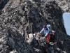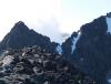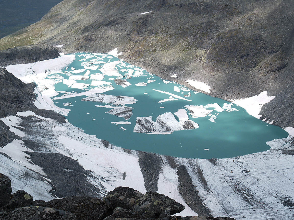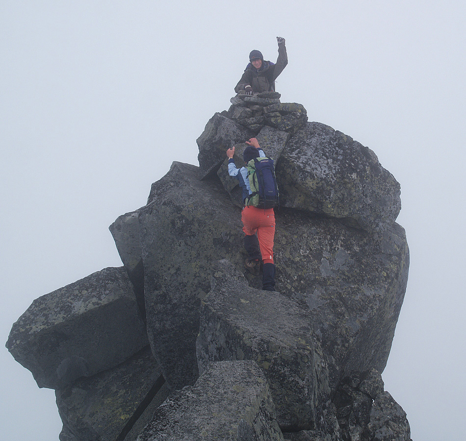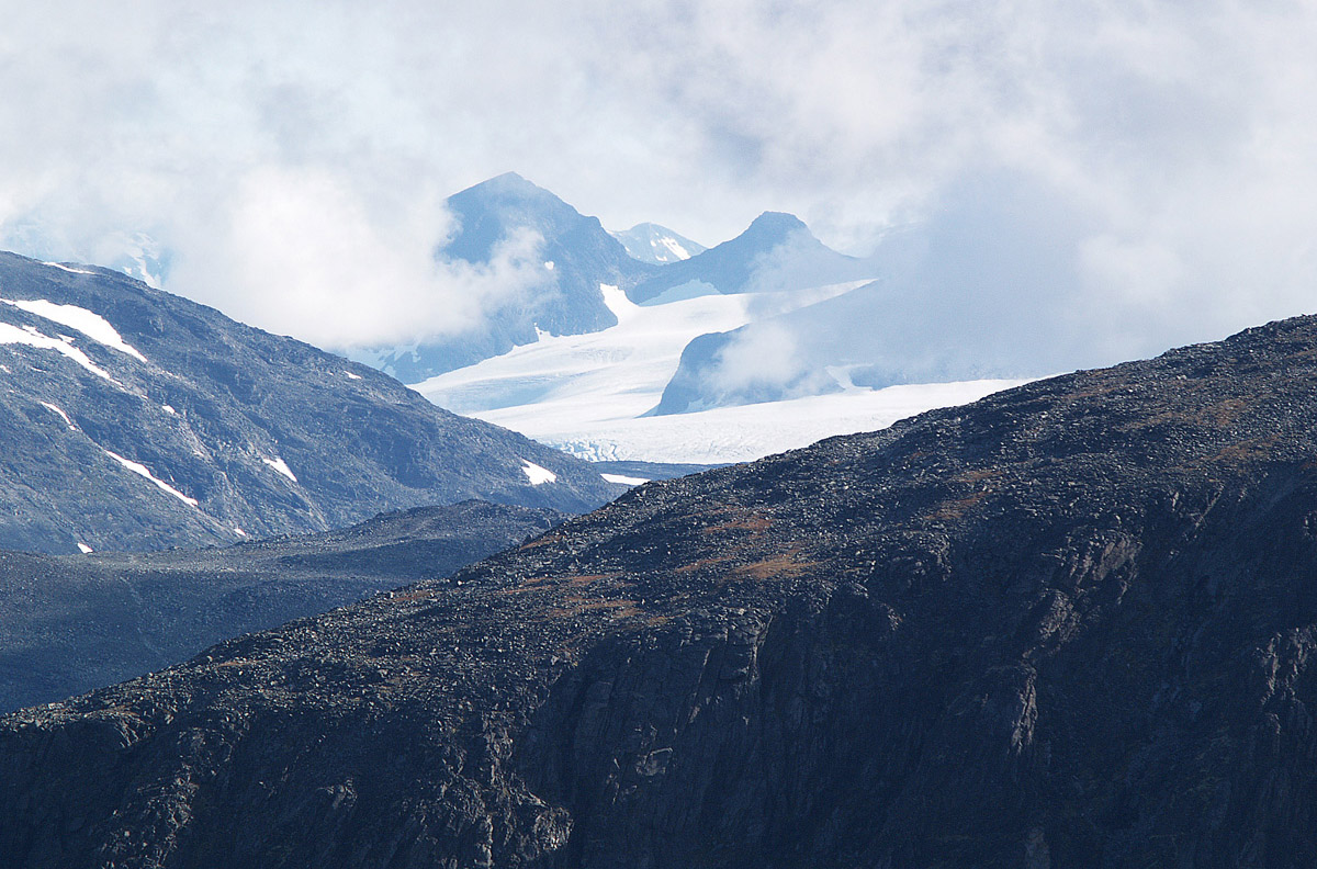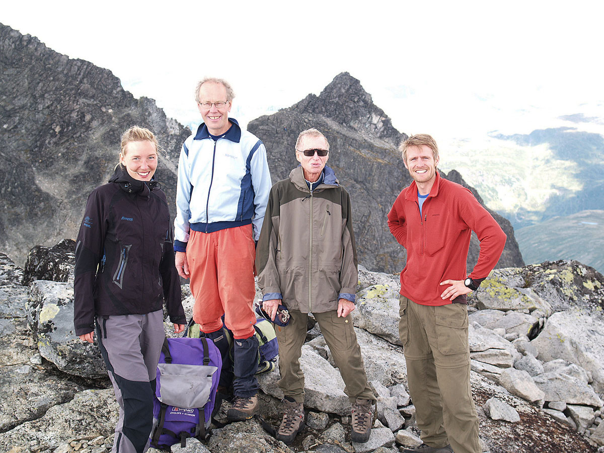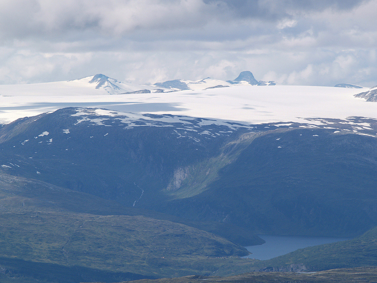 Det var nå gått to år siden jeg sist var på en 2000-meterstopp, så da jeg fikk forespørsel om å være med på en tur til Horungane siste helg, svarte jeg ja. En hyggelig fornorsket danske, Walter, som jeg hadde vært på tur med for mange år siden, driver og samler 2000-metringer. Også den ene av Hans-ene som jeg hadde gått mye sammen med og som også hadde hatt mange turer med Walter, var med. Da yr.no spådde fint vær fredag og lørdag, men ikke søndag, dro vi avgårde torsdag ettermiddag. Fredag gikk vi på Austabottind, men finværet som var lovet, slo ikke helt til. Tåka lå ganske langt nedover fjellsidene, og vi opplevde også lett snøfall uten at det maktet å gjøre fjellet vått. På toppen gratulerte vi Walter med en ny topp, til og med en kremtopp. Mens vi satt på toppen kom det opp et ungt, hyggelig dansk par bosatt i Sogndal. Det var med andre ord flertall av dansker på toppen. Vi ble sittende lenge å prate. Enhver ekspedisjon bør jo ha et vitenskapelig aspekt ved seg. Jeg hadde derfor intensjoner om å undersøke om en kunne se fjorden fra toppen (diskutert for et par år siden på fjellforum). Desverre ødela tåka denne muligheten, og det ergret meg. Tilbake på Vesttoppen satt to hyggelige karer som vi ble sittende å prate med. De hadde tenkt seg videre, men den minst fjellvante syntes det så litt overveldende ut så de valgte å snu her. Det samme gjorde tre ungdommer som kom opp. Lørdag sto de tre Soleibotntindane på programmet. For å få en rundtur ut av det, valgte vi oppstigning over Lauvnostind. Jeg hadde gått opp her for 10-15 år siden med en annen kamerat og kjente derfor ruta. For å komme ned i skaret mot Nordre uten å rapellere, må en klyve ned en kløft i vestsiden. Et sted nede i kløfta må en henge etter armene for å finne feste for føttene. Nederst må en ut av kløfta rundt et hjørne, og her er det en fordel å ha god balanse. Dagen før hadde jeg fra veien studert oppgangen til skaret mellom Nordre og Store og kunne bare se en snøflekk som jeg regnet med var grei å passere. Vi hadde derfor valgt ikke å ta med isøkser og stegjern. Nå oppdaget vi at snørenna gikk helt opp i skaret, og vi angret på å ha etterlatt snøutstyret. Da vi kom bort til renna, var snøen hard som betong og umulig å forsere uten utstyr. Til høyre for renna så oppstigningen grei ut, men det var veldig løst. Vi valgte derfor vekselvis å gå tett sammen eller å klyve hver for seg når ingen sto i fall-linjen. Selv om klyvingen foregikk med stor forsiktighet, løsnet en stein som etterhvert tok med seg et helt regiment av steiner og blokker. Med dunder og brak styrtet de utfor og fordelte seg utover breen nedenfor. Vi kom opp til ryggen litt til høyre for dypeste skaret. Da jeg var på Nordre for første gang på 80-tallet engang, fulgte vi en hylle i vestsiden som gikk helt over til nordryggen, mens jeg siste gang fulgte hylla et lite stykke før vi tok opp på sydvestegga. De andre syntes siste alternativ så bratt ut og ville prøve det første alternativ. En glemmer mye etter mer enn 20 år, og denne hylla viste seg å ha et brudd som ikke så helt enkelt ut. Det hang noen slynger oppe i veggen som vel viste at andre også hadde ansett dette for ikke helt greit. Vi var nok tøffere da vi var yngre. Jeg foreslo å gå tilbake til det første alternativet, og da de andre så hvor greit det var å klatre opp her, kom de etter. Sydvest-egga bort til toppen er tildels meget smal og morsom å klyve. Ett sted var en metode å ta tak over egga og spenne beina mot fjellet og entre bortover. Etter å ha gatulert Walter med en ny topp, returnerte vi til skaret. På grunn av snøkonsistensen vi hadde erfart, var jeg litt spent på oppgangen til Store for jeg hadde sett fra Nordre at det gikk en lang snørenne oppover på siden av skarpeste ryggen som har flere hammere. Detaljene her kunne jeg ikke huske fra de tre gangene jeg hadde gått her tidligere. Nå gikk det greit å holde seg på fjellet på venstresiden av snørenna. Da vi var kommet nesten på høyde med øverste del av snørenna, var det en hammer som jeg anså for å være klatrebar, men jeg ville først undersøke snøkonsistensen. Denne viste seg nå å ha blitt en helt annen enn det vi erfarte nedenfor skaret. Dermed kom vi enkelt opp på der hvor ryggen flater ut. På Store Soleibotntind satt det flere mennesker. Vi kom i prat med et ungt par. Hun var dansk og han var sønn av en fjellsportmann i Hamar fjellsportgruppe som jeg kjente navnet på. De slo følge med oss bort på Søndre. Når en følger hyllene til høyre ut av kløfta mellom toppene, ser man en varde på andre siden av et sva. Med knudret fjell ville helningen på svaet ikke være problematisk, men fjellet er nærmest blankpolert og med en svart, kortvokst mose som i tørr tilstand blir rene støvet når den tråkkes på. Dette var med på å minske friksjonen. Dessuten er det meget magert med tak inne ved den loddrette hammeren over svaet. Men alle kom velberget over, og etter en kort stund sto vi på Søre Soleibotntind og kunne gratulere Walter med tredje topp for dagen. Været var fint og i kikkerten kunne vi se flere personer på ryggen og toppen av Store Austabottind. På oppstigningen til Nordre Soleibotntind kunne vi se to klatrere som tydeligvis hadde gått etter anvisning fra den gamle føreren for Horungane, nemlig ved å gå til høyre etter skaret. De plundret tydeligvis med dette opptaket som er angitt som firerklatring i føreren. Etter å ha tatt fram tauet, kom de seg tydeligvis greit opp. Første gang jeg var på Søndre på 80-tallet, fortsatte vi mot Soleiskaret og gikk ned Berdalsbreen. Nå returnerte vi mot Store. Walter ville ha med seg sekundærtoppen nær kløfta mot Store som han mente hadde 20 m pf. Vi stakk derfor oppom denne. Da vi kom til det før omtalte svaet, syntes jeg det var mer vemmelig å gå ned dette enn da vi gikk opp. Da jeg var kommet over, undersøkte jeg muligheten for alte