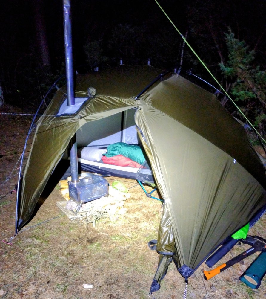 Blir mer og mer glad i, og komfortabel, med hot tent når gradestokken truer med blått. Første 1-manns fra Pomoly(Dune). Uvant konstruksjon, så trenger noen innkjøringsrunder. For tidlig å si noe om kvaliteten på teltet, så kommer tilbake med erfaringer til våren.