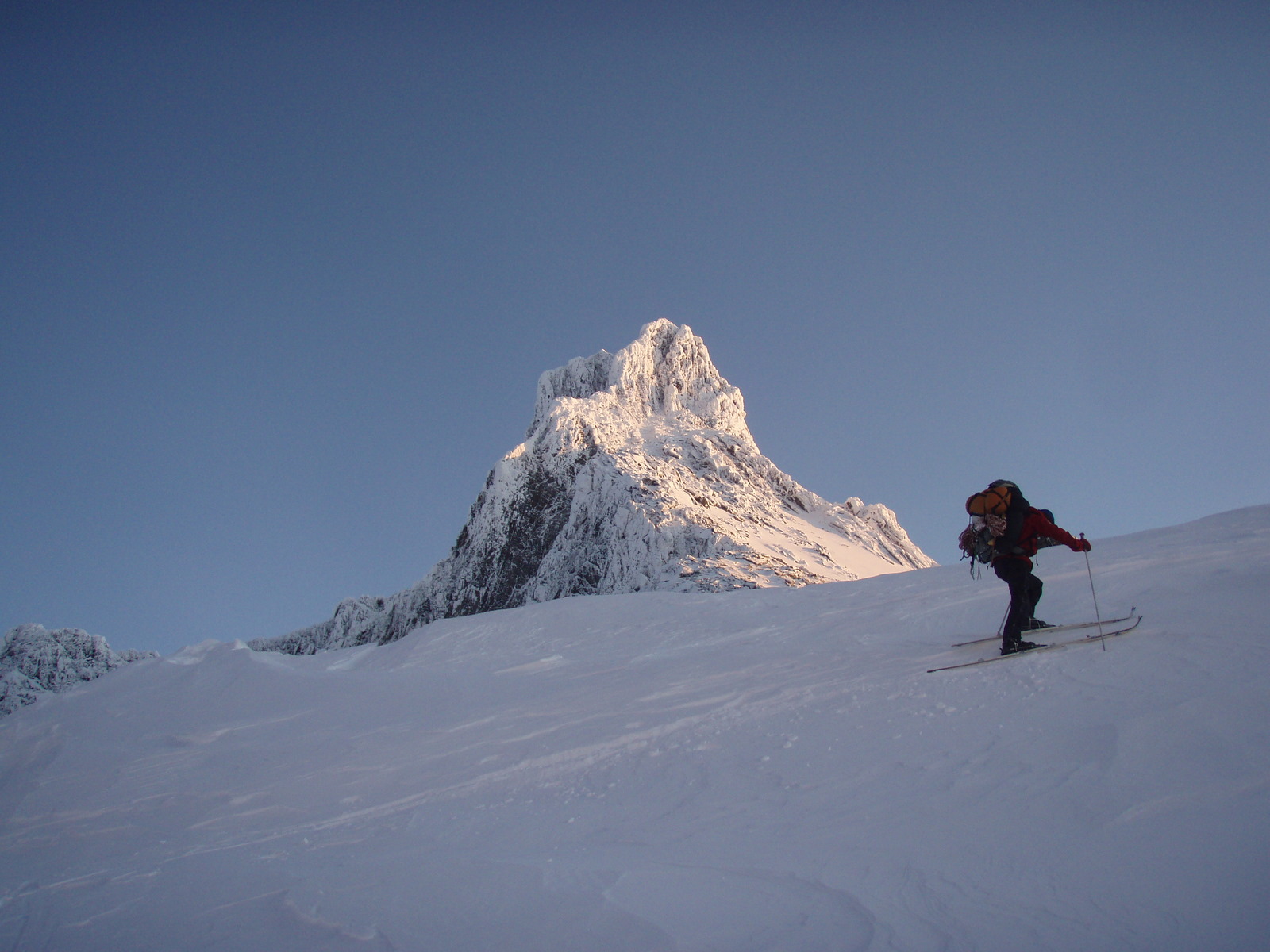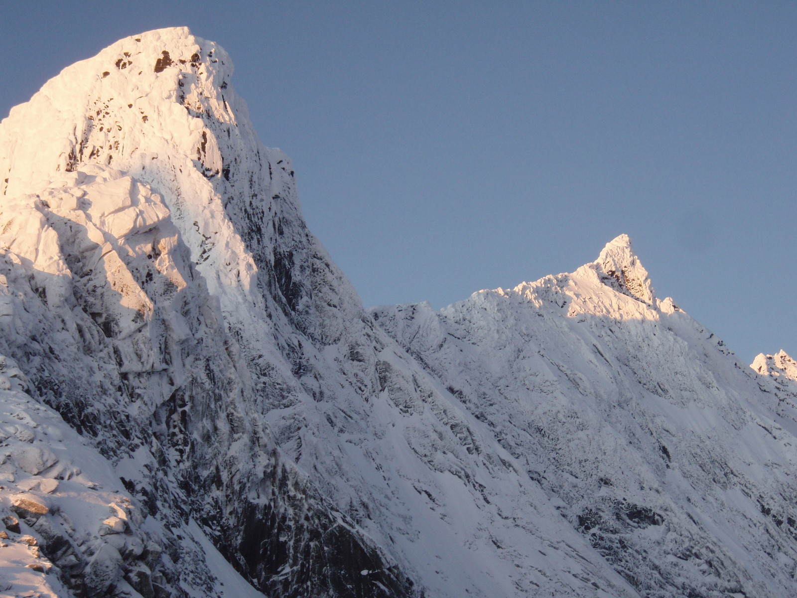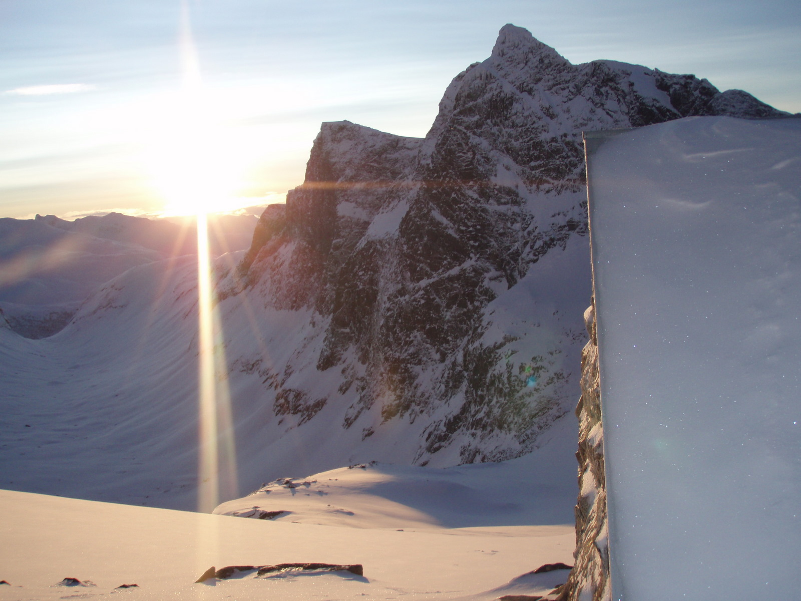 Store Skagastølstind, 2.405m (Helge og Coni, 24.01.2007) For en som meg som er glad i spisse tinder er Hurrungane det mest spennende område i Jotunheimen. Storen og naboene hans er imponerende tinder på sommeren, men de er enda mer fascinerende vinters tid. Det norske vinterlyset skaper praktfulle farger som pynter de bratte toppene enda finere. Etter noen sommerbestigninger vokste ideen i meg å prøve Storen på vinteren. Da var jeg nok ganske heldig at jeg møtte Helge på 4000 toppen Zinalrothorn i Sveits. Han hadde nemlig også planer om å klatre på Norges tredje høyeste topp i den kalde årstiden. Skal man lykkes med et slikt ”prosjekt”, må alt klaffe. Ikke minst været. Jeg har sjekket været på Turtagrø hver dag på noen uker. Og det har nesten ikke skjedd en dag med fint vær. Siste mandag sjekket jeg værmeldingen på nettet, snakket med værtelefonen og oppdaget et værvindu på onsdag. Det var meldt solskinn hele dagen over hele Jotunheimen. Jeg ringte Helge og kvelden etter (tirsdag) satte vi i bilen i retning Skjolden. Turen begynte med flaks. Vi rakk fergen fra Lærdal 2 minutter før avgang. Men bare en time senere kom det første tilbakeslag. Da vi satt opp teltet i Fortun snødde det tett. Dårlige utsikter. Vekkerklokken ringte 3:30, ikke en gang 4 timer etter vi har langt oss. Det var tøft å stå opp. Vi, eller bilen vår, klarte den første utfordringen, veien opp til Turtagrø. Kl 5.00 var vi i gang. Først gjaldt det å finne en vei opp til Tindeklubb hytta. Grunnet snørasfaren under samme hytta valgte vi å gå en alternativ rute. Vi gikk opp skråningene mot Dyrhaugstind for å traversere til NTK hytta. Månen glitret med sitt fravær, men natten var så klar at man kunne ane toppene rundt omkring. Først og fremst Storen. Det var faktisk utrolig fint å gå i mørket. Klokken har passert halv åtte når vi sto under bratthenget opp til breen. Dette henget er en typisk raskandidat. Vi kunne ikke gå den før dagslyset ga oss muligheten til å bedømme skråningen. Det viste seg heldigvis at snøkonsistensen var veldig kompakt og tryg. Vi krysset skråningen oppover, en og en. Så var det bare å spasere over breen før vi nådde bandet. På bandet var solen i ferd med å slå skikkelig gjennom. Fargene på toppene var så utrolig at vi begynte nærmest å juble. Dyrhaugstindene var oransje, Jostedalsbreen farget rosa. Og så Storen. Den var hvit, helt hvit. Et uvanlig syn for oss som kjenner Hurrungane fra sommertiden. Vi var for late til å grave fram inngangen til hytta og forberedte oss til toppetappen ute. Det blåste ikke en millimeter/sekund, så tingene vi ikke trengte på toppen lot vi bare ligge foran hytta. Etter å ha skiftet skistøvler med fjellsko gikk vi til verks. Først opp snøskråningene. Forholdene var forbausende bra. Det var litegran slit å lage spor men det kunne ha vært mye verre. Allerede kl halv tolv var vi på begynnelsen av det første svapartiet. På sommeren tenker man ikke så mye på tau på det stedet. Men på den dagen var det annerledes. Storen var helt snøhvit, men snøen var ikke tykk nok overalt slik at vi måtte etterlate noen skrapspor på svaene. Det var litt ekkelt av og til. Det viste seg at veien til innsteget var litt mer krevende enn forventet. Men vi var optimistisk allikevel. Solen skinte som bare det. Og selv om det var kaldt i lufta, skapte solen påskefølelser. Og det var så fint. Spesielt utsikten til Riings- og Austabotntindene. Selv om vi kom fort oppover, gikk klokken. Vi nådde innsteget av Andrews renna kl ett. Klokken 2 skulle vi stå på toppen, i hvert fall etter planen. Men den isete og skumle Andrews renna gjorde om på tidsplanen vår. Heldigvis var Helge i storform. Han ledet de to fulle taulengdene opp til varden. Grunnet is og snø var det helt umulig å bruke noen av takene. Hele klatringen var basert på stegjernskraping og isøkser. Sikringen foregikk på friends av alle størrelser. Og Helge måtte ta i bruk hele racket for begge av taulengdene. Kl 15:30 kom det store øyeblikket. Helge kom opp renna, måket seg opp de siste ti meter til topps og hentet meg etter. Målet var nådd. En drøm har blitt realitet. Og stemningen kunne ikke vært bedre. Fortsatt var det ingen sky på himmelen. Lyset fikk farger igjen, praktfull kveldsstemning. Men det var altfor lite tid for å nyte øyeblikket. Det gjaldt bare å komme seg ned så fort som mulig. Vi gikk ned til helikopter slyngen. Eller til det stedet hvor vi tenkte den skulle befinne seg. Men etter fem minutters graving ga vi opp og la en gigant slynge rundt en blokk og fyrte oss ned. Akkurat i solnedgangen. Nok en rappell, noen traverser og skumle nedover klatring partier og vi var tilbake i snøflanken. Vi rakk det akkurat. Men nå ble det mørkt. Ingen problem, nå var vi i sikkerhet. Vi løp ned til bandet, pakket sekkene våre og kjørte ned til Turtagrø. Denne gangen med månen over oss. Klokken halv ti på kvelden var vi tilbake på Turtagrø. Dønn sliten, fysisk og psykisk, men så fornøyd. Så utrolig fornøyd.