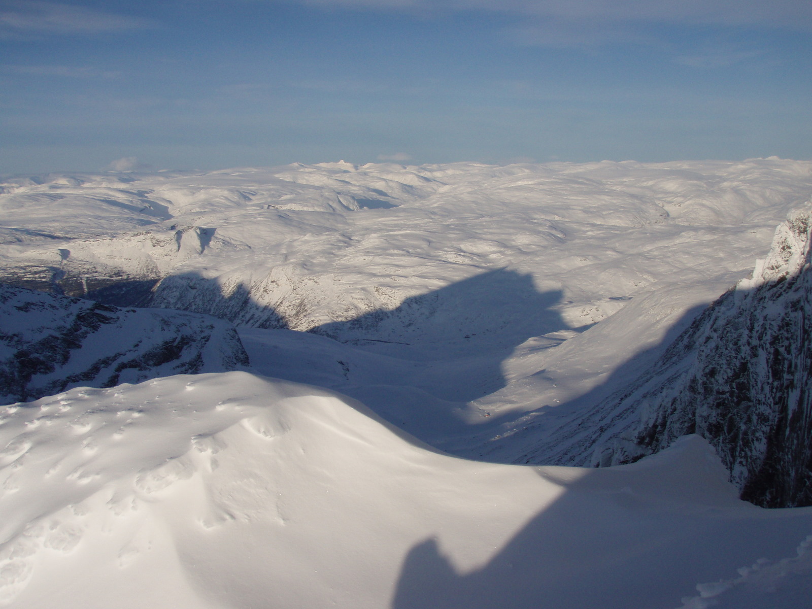 Sol og 10-15c oppe over 2000m i oktober, går det ann? Dumhøe, Skardstinden og Nåla Forrige helg så været for godt ut til å være sant, så jeg bestemte meg for å dra til Jotunheimen. Etter å ha deltatt på kveldsmiddag ute på byen her i Trondheim fredag, dro jeg hjem å pakka sekken. En 2 timer lang 'powernap' var nok, jeg kjørte sørover kl 02.45! Kl 07.00 var jeg framme ved Geitsætre (1000moh) i Leirdalen, her var veien stengt videre opp til Leirvassbu, noe som overasket meg da det ikke var ett fnugg av snø. Var i gang med å gå en halvtime senere, temperaturen lå rundt 0c nede i dalen, men steg fort mens jeg gikk oppover. Da jeg fikk sola i ansiktet på rundt 1600m var temperaturen oppe i 5c. Er ganske vant til at temperaturen detter nedover når jeg går oppover i fjellet, spesielt så seint på høsten, så jeg storkoste meg iført kun t-sjorte på overkroppen! Først på 2000m lå det litt nysnø fra snøværet tidligere, nesten alt var smeltet bort. Besteg Dumhøe som ikke var så mye til bestigning, men fin utsikt og profil av både Skardstinden og Galdhøpiggen herfra. Kløyv så opp til Vestre og tilslutt selve Skardstinden. Gikk helt greit å gå usikra opp her da det var helt tørt opp klyve/klatretrinnene. Storslagen utsikt fra toppen, spesielt la jeg merke til hvor liten å ubetydelig Store Smørstabbtinden blir iforhold til Hurrungane i bakgrunnen! Turen ned og opp på Nåle gikk fint, her var det endel is, spesielt i skyggen av Nåle. Men videre ned renna fra Nåla ble ei utfordring uten sikring. Har var det nesten bare nysnø på glatt is. Hadde nok ikke vært noe problem ned her på tørt sommerføre, men jeg brukte nesten 1 time på 100 høydemetre! Vel nede gikk turen videre øst til Søraustre Skardstinden. Herfra så jeg to klatrere på vei ned fra Nåle. Tenkte meg egentlig opp på Ymmelstinden og Storjuvtinden med det samme jeg var i denne teigen, men det var såpass seint at jeg måtte ned før sola tok kvelden. Nede ved enden av Nørdre Illåbreen så jeg forsatt de to klatrerne oppe der, tenkte at det skulle bli bra mørkt før de kom seg ned. Senere ser jeg en artikkel på Fjuken at de to klatrerne måtte hentes ut av helikopter da den ene av de hadde falt å knekt begge anklene. Store og Søre Soleibotntindane Dagen derpå gikk turen til Hurrungane og opp på Store Soleibotntindane. Tok akkurat 3 timer å gå fra parkeringa ved Tverrelvi (1220m) til topps. Etter litt mat gikk turen videre ut på Søre Soleibotntindane, noe som ga mersmak. Her var det mye klyving og en luftig egg, spesielt over og ut på toppen helt mot Ringstinden. Her traff jeg på to til og vi joina lag da vi tenkte å prøve oss på traversen fra Store Solei. til Lauvnostinden uten sikring. Har hadde det nok også gått fint på en tørr og fin sommerdag, men vi endte opp med å snu halveis mellom Store og Nørdre Solei. Har var det kun snø og skummelt glatt is å klyve i, så det var vel sånn passe uforsvarlig å fortsette! Så det ble slått retrett. Opp på Store Solei. for tredje gang denne dagen og ned til bilen igjen. Både på Skardstinden og Soleibotntinden var det t-sjorte vær, stasjonen på Fannaråki viste 11.0c på lørdagen. Minnet mer om en topptur midt på sommeren, uten at dn behøvde solkrem! Snart sol, fra Raudhamran. Klikk på bildene for å forstørre! Utsikt fra Dumhøe, Skardstinden til høyre. Mektig skue fra Skardstinden Store Smørstabbtinden og Kniven med Skarstøltindane i bakgrunnen. Nåle sett fra Søraustre Skardstinden. Klatrere på tur ned fra Nåle. Nørdre Illåbreen og Nørdre Bukkehøe Overnattet i Ringsbotn, under stjernene og Ringstindene! Lang eksponering av Midtre Ringstinden Store Soleibotntinden Sola står opp ved Austanbotstindane Austanbotstindane sett fra ryggen opp mot Soleibotntindane. Flott fjell! Utsikt fra Store Soleibotntindane- 8 svar