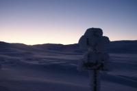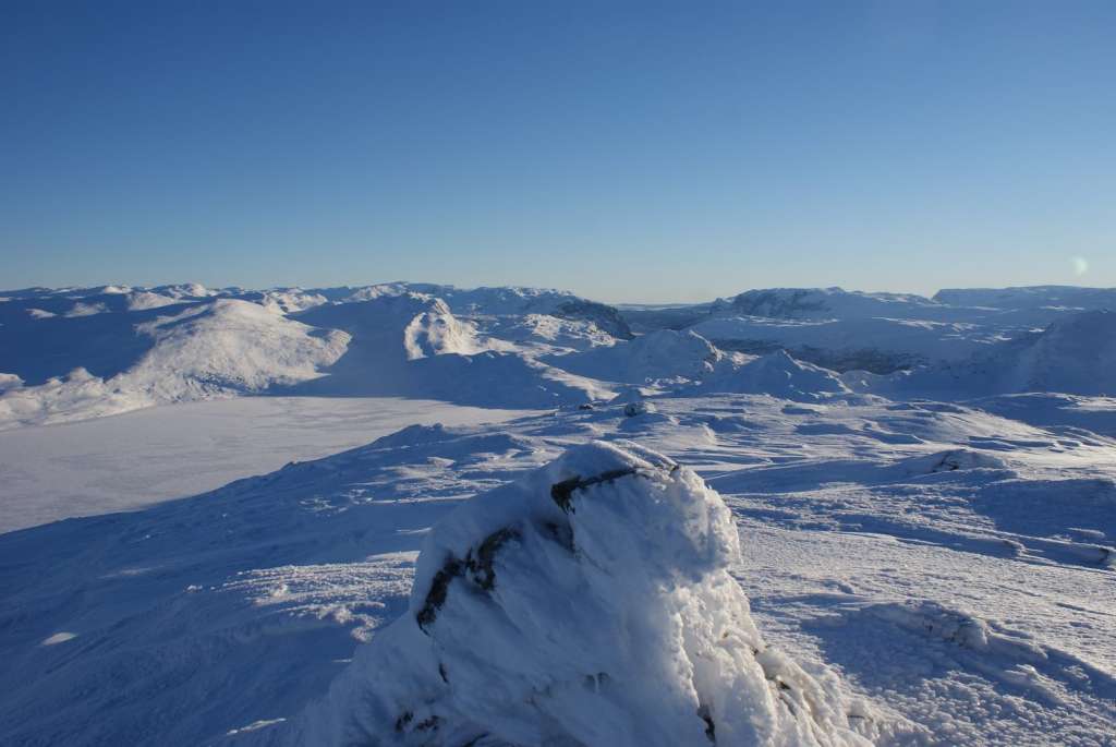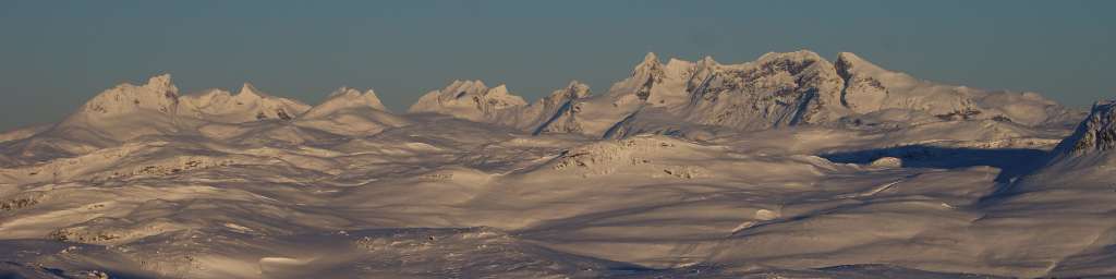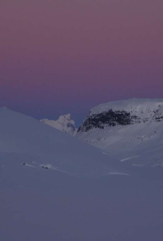 Starta fra Tyinstølen p-plass ca kl 10.30 i minus 20 omtrent. Vindstille og skyfritt. Mange spor av skred fra noen dager tidligere. Nå var neppe skredfaren så stor. Til dels is og skare. Nådde Galden kl 11.18 og kunne ta av skifellene. Herlig utsikt mot et solbadet Jotunheimen. På knakende skare (litt ekkelt i grunn) i skyggen over Nedre Årdalsvannet, og så over til Øvre. Her måtte balaklavaen fram også, da jeg fikk svak motvind. Det var nok drøyt 20 blå. Sjekket at Slettningsbu var i ok stand, siden den på papiret var "stengt." Spadde fram døra og sleit litt med låsen, som var bunntæla. Ved og mat i overflod i stua her! Drakk litt varm drikke, og la ut på tur videre i sola. Gikk fortsatt uten feller opp på Svarteknippa, som ble nådd kl 13.26, og følte nærkontakt med Hurrungane, badet i lav januarsol. For et syn - og for et liv! Skled ned i sørlig retning, og kom snart i skyggen av Slettningsegge. Nå var det på med skifellene, som ble grundig teipet fast i kulda! Så vidt det funka med teipen også! Nådde toppen kl 14.28, med enda litt bedre utsikt til Hurrungane. Syntes jeg hørte en hund, og oppdaget etterhvert folk på Svarteknippa, som jeg var på for bare en time siden. Skled så lett ned mot NØ, og over vannet tilbake til Slettningsbu, hvor det jammen var godt å komme inn, selv om det var -15 inni stua også! Ca 5 timers tur i dag. Absolutt alle gjøremål ble i de første to timene sentrert rundt den varme ovnen, selve symbolet på livet i en iskald snøverden. Brukte 1 time på å fyre slik at varmen kom over frysepunktet i stua. Etter ytterligere en time var det blitt 7 varme grader. Sengetøyet ble tidlig hengt fram foran ovnen, og boksmaten ble forhåndstint på ovnen. Alt sentreres om en varm oven i en slik stund, men jeg glemte zalo-flaska. Vondt å vaske opp etter joikakakene når såpa omtrent er is! NESTE DAG Våkna søndag kl 6.00 i Slettningsbu og syntes det var voldsomt kaldt; +2 inne i hytta, ja. Utenfor var det nok -25. Sånn blir det når en ikke sitter oppe og fyrer om natta. Kvart på ni i det gryende morgenlyset var jeg klar på skiene, og syntes i grunn ikke det virket så skrekkelig kaldt, selv om alt tydet på at det var godt under 20 minus. Etter en halvtime fikk jeg et nydelige glimt av Austanbottinden i magisk lilla lys - herlig. Gikk uten feller, men det gikk veldig sakte da, syntes jeg. Grønnvoksen ga dårlig feste, og blåvoksen (som gav bedre) ble fort slitt av. Høyt opp på Sletterustvatnet SØ møtte jeg endelig sola, og kl 10.03 sto jeg på toppen, med fabelaktig utsikt mot Hurrungane i morgensol - igjen. Vindstille var det også, og bare å nyte livet. Tenkte så å gå på beina rett ned bratta i sør, men det ble altfor bratt, og så ble det å skli nedover i en stor bue mot vest. Opp mot Skjeltrene teipet jeg igjen skifellene på skia, og det holdt akkurat til jeg nådde toppen kl 11.30. Da jeg så på gps-en at det var 9 km tilbake til p-plassen i luftlinje, skjønte jeg at jeg ikke hadde all verden med tid. Over vannene i øst gikk det ganske radig, selv om gliden ikke var noe særlig å snakke om. Verre ble det å krysse utallige fonner og skavler skapt av vinden nord for Bjørdalsnøse. Små ubetydelige "smultringer" på kartet er ofte langt større hindringer i virkeligheten, og i alle fall med ski på beina. Tida gikk og jeg skjønte at det var en riktig beslutning ikke å gå oppom noen flere topper underveis. Mot slutten ble det riktig kaldt og jeg gikk på beina ned de siste bakkene til bilen, som stod parkert på Tyinstølen p-plass siden lyset var så flatt og bakken så bratt og isete. Det mest spennende nå, var om jeg fikk start på motoren. Det lød skrekkelig tungt, men så kom den i gang, heldigvis. -23 grader sa termometeret. Min klart kaldeste langtur på ski - likevel: Vindjakka forble i sekken begge dagene!