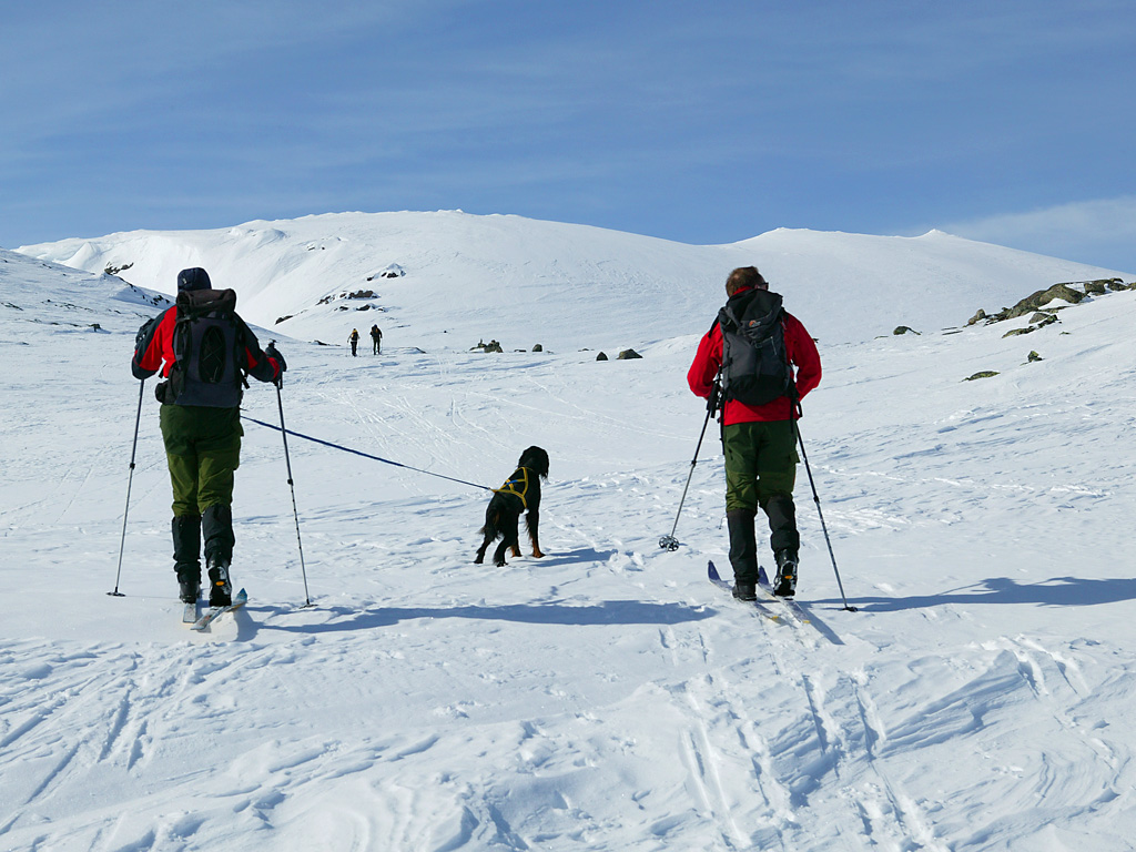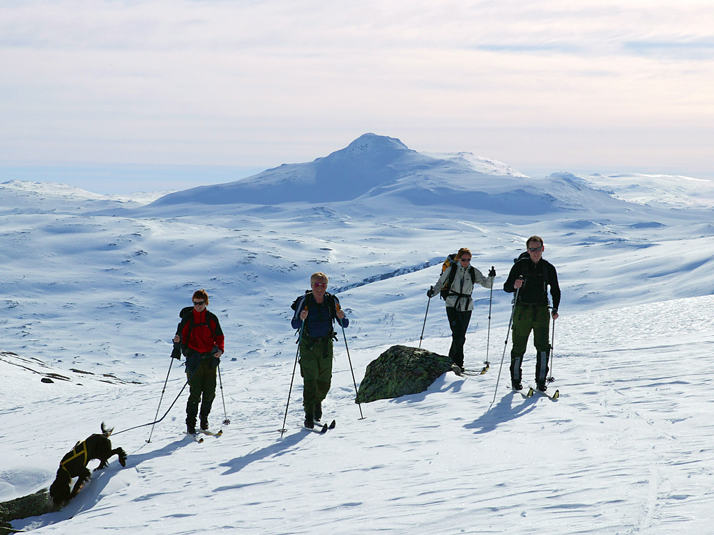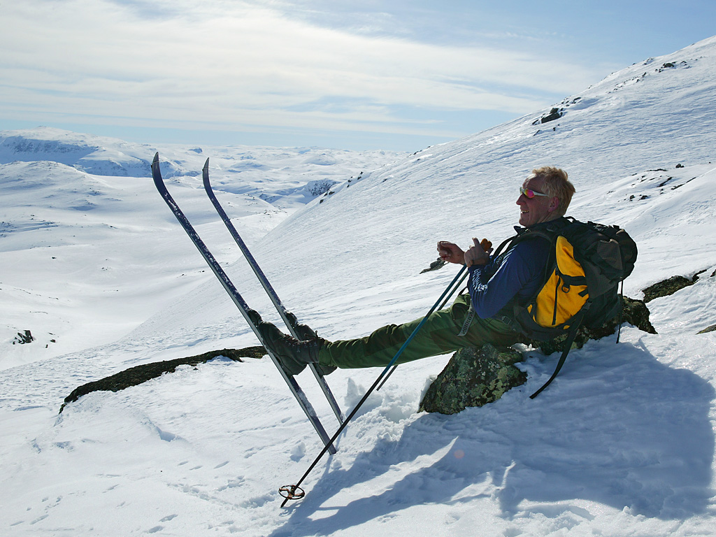 Først en stor takk til Kim og familien Dahlen for å dra meg med på denne skjønne turpalmesøndagen. Ellers ville jeg sikkert sittet på terassen, puslet med familiære sysler, spist for mye og lagt på meg enda mer. I stedet ble det en drømmetur til et hittil ukjent turmål for mitt vedkommende. Jeg møtte Line og Gunnar Dahlen på Fagernes og ved Buhaugane på vestsiden av Filefjell stod Kim og Trine sammen med den overivrige turbovoffen Trym og ventet. Det var kjølig med en håndfull minusgrader, men sola var allerede godt i gang med å tine opp landskapet. Med feller og skare under skiene tuslet vi fornøyde over broa sør for Øvre Smeddalsvannet og oppover lia hvor muntre fjellryper allerede var i kurrende godhumør. Line tok det også med godt humør da hun oppdaget at hun hadde glemt maten i bilen. Dette ga oss andre en bedagelig pause på en stor stein i sola. Kims bamsemumspose var prikken over i'en på denne steinen. Det var til og med en "mums" igjen da Line kom pesende tilbake. Nær vindstille og på fast underlag var dette en drømmetur. Det minte kanskje mer om vårskitur i mai enn tidlig påske, men det får så være. Turen er ikke voldsom lang når føre er så godt som i dag. Ca. 9 km og 900 høydemeter, så vi tok det med ro oppover Vetlefrostdalen, hadde en lang pause i lia vest for Frostdalsnosi. Siste kneika opp østryggen til toppen blåste det litt sur og heller ikke toppen bød på temperaturer for de lange pauser, men til gjengjeld var snøskulpturene på toppen flotte. Utsikten mot Hurrungane var litt hard. Sørveggene der var nesten snøfrie etter flere uker uten nedbør og daglig intens solstråling. Det var nesten finere å skue mot det bølgende fjell-landskapet i retning Suletind og Bleia. Nedkjøringen gikk raskt unna til tross for variable ferdigheter. I siste kneika opp mot toppen møtte vi for øvrig en familie på fire med to ikke alt for gamle barn som helt sikkert ville greie toppen. Imponerende. De må ha vært under 10 år. I Vetlefrostdalen ble det tid til nok en døsig pause på en flat rabb i den stekende påskesola. Humørsprederen Gunnar hadde med seg overraskelser i sekken og sendte en stor ladning Troikasjokolade over til undertegnede. Og nede i bilen ventet flere godsaker som han rundhåndet delte ut. En svært hyggelig gest til alle de små "barna". Selv Julia som satt hjemme og passet barn fikk tilsendt en pose med påskegodt. Turen gikk egentlig veldig fort unna, nesten litt for fort, men Trine begynte å verke etter lille Olatassen på 9 mndr. og ble utålmodig. Line som, hadde kjørt 5 timer fra Rendalen for denne turen hadde dessuten fortsatt 5 timer å kjøre tilbake. Solid å kjøre 10 timer for en tur på ca. 5 timer. Attpåtil en tur hvor gnagsårene kom snikende. Vi var skjønt enige om at neste gang skulle forholde mellom kjøretid og gåtid stå litt bedre i forhold til hverandre. Legger ved noen få bilder fra turen.