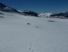 29.03.-13 Nå hadde jeg og Ivar Nerdal pakka sekkene med tau, økser, stegjern, kiler og friends i tillegg til alt det stæsjet som er påkrevd å ha med i dagens toppturfikserte samfunn, da for å være god kamerat. Med dette menes spade, søkestang, batteridreven pipedings, skihjelm og alskens pikkpakk. Jaja, vi tar det som trening tenkte jeg da jeg på lang avstand kunne se at Jutullene (som var målet) tydeligvis hadde brattere anmarsj i år. Ivar som bor i Nerdalen og kikker rett på Skarfjells nordvegg fra frukostbordet var helt enig. Det var nok blitt brattere. opptråkket spor til Grasdalen åpenbarte seg da vi entra åkeren i Nerdalen. Idet stigninga begynte stussa vi lenge over hvorfor de som hadde gått her ikke hadde brukt staver, det var jo ingen kringlespor i snøen, var det paralympics-folk som hadde traska opp her? Antagelig var det bare noen som hadde kjørt ned, for det var fullt av svinger oppe i lia. Hvor de kom fra vet vi ikke med sikkerhet, for det var ingen spor opp (med kringler). Snøen var som beskrevet av kamerat og pioneer fra gullkysten, Tustnastabbenes erobrer, selveste Toralf Furseth. 30 cm pudder plassert lett og luftig på klinkende skare. Vi holdt oss unna rennesystemene og bøksa oss rett på den steinete ryggen som går fra Grasdalen til Jutullene. "Følg rygg, vær trygg" runget ut i de bratte fjellsidene mens vi bestemt og taktfast masjerte opp, opp og opp. Det var tungt, skaren slapp taket på pudderet og vi klarte ikke å gå opp bratta med ski, skaren holdt derimot ikke vekten av oss lammelårspisende ålvundeidinger med tunge ryggsekker når skia hang på sekkene. Steike for et slit. Kl 13 var alt dyvått av svette, vi hadde fremdeles et stykke igjen og snøen ble dypere og tyngre for hver høydemeter. Til slutt ga vi opp, velta oss ned på en stein og glefsa i oss nistepakka. Vi myste bort mot Nordveggen på Skarfjell og ble enige om å traversere ut dit for å få ei nedkjøring der som plaster på såret. Ingen klatring idag. Her var snøforholdene temmelig lik det vi hadde jobba med tidligere på dagen, pudder som ikke ville ligge i ro på skaren. Vi kryssa oss over hele flanken i øvre del og kjørte en safere linje i østsida før vi kryssa oss tilbake mot grasdalen i bunnen av ura. Nordveggen ser enorm ut på nært hold, og dødens dal åpenbarte seg som en interessant sak som skrådde seg opp mot himmelen. Kan nevnes at undertegnede gikk på trynet så det sang etter nede i henget. Resultatet ble utgraving av ei grop på størrelse med et alminnelig meteorkrater grunnet jakten på den forsvunnede ski. Når folk nede i dalen spør hva det krateret de skimter der oppe er for noe, sier jeg bare at det er slik ålvundeidinger bruker å grave snøprofil. Ja, gropa er faktisk synlig fra virumdalen. Fikk i det minste inspisert litt, været var bra og helsa ble sikkert ikke dårligere av dette heller. Mysteriet med manglende spor opp til Grasdalen ble løst. Vi oppdaga skispor lengre vest, nesten i sida opp mot hesthøgda som dro seg ned i grasdalen igjen og fortsatte opp breen mot kongen. Variant.