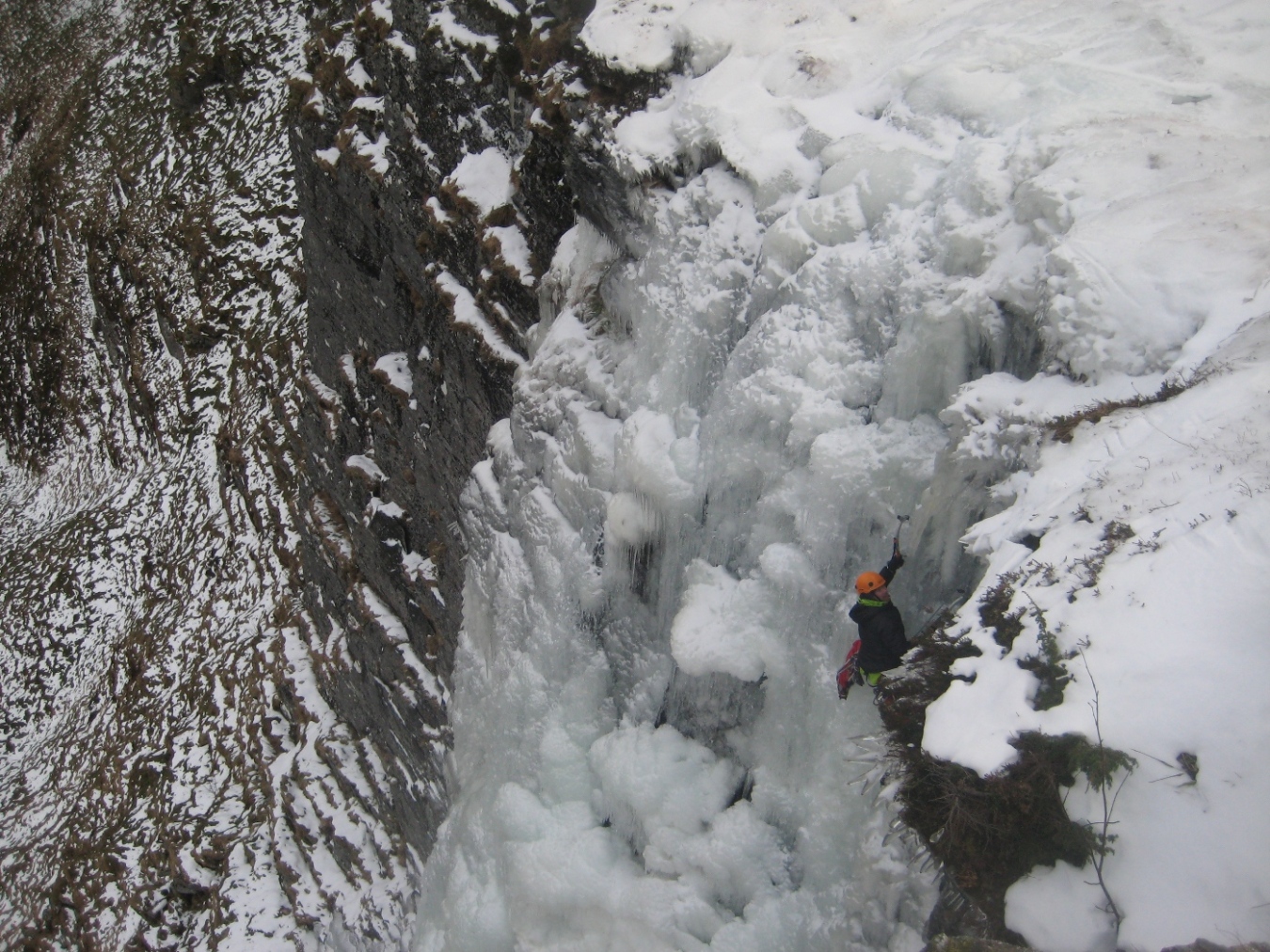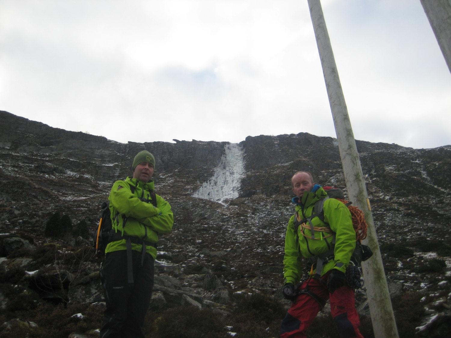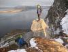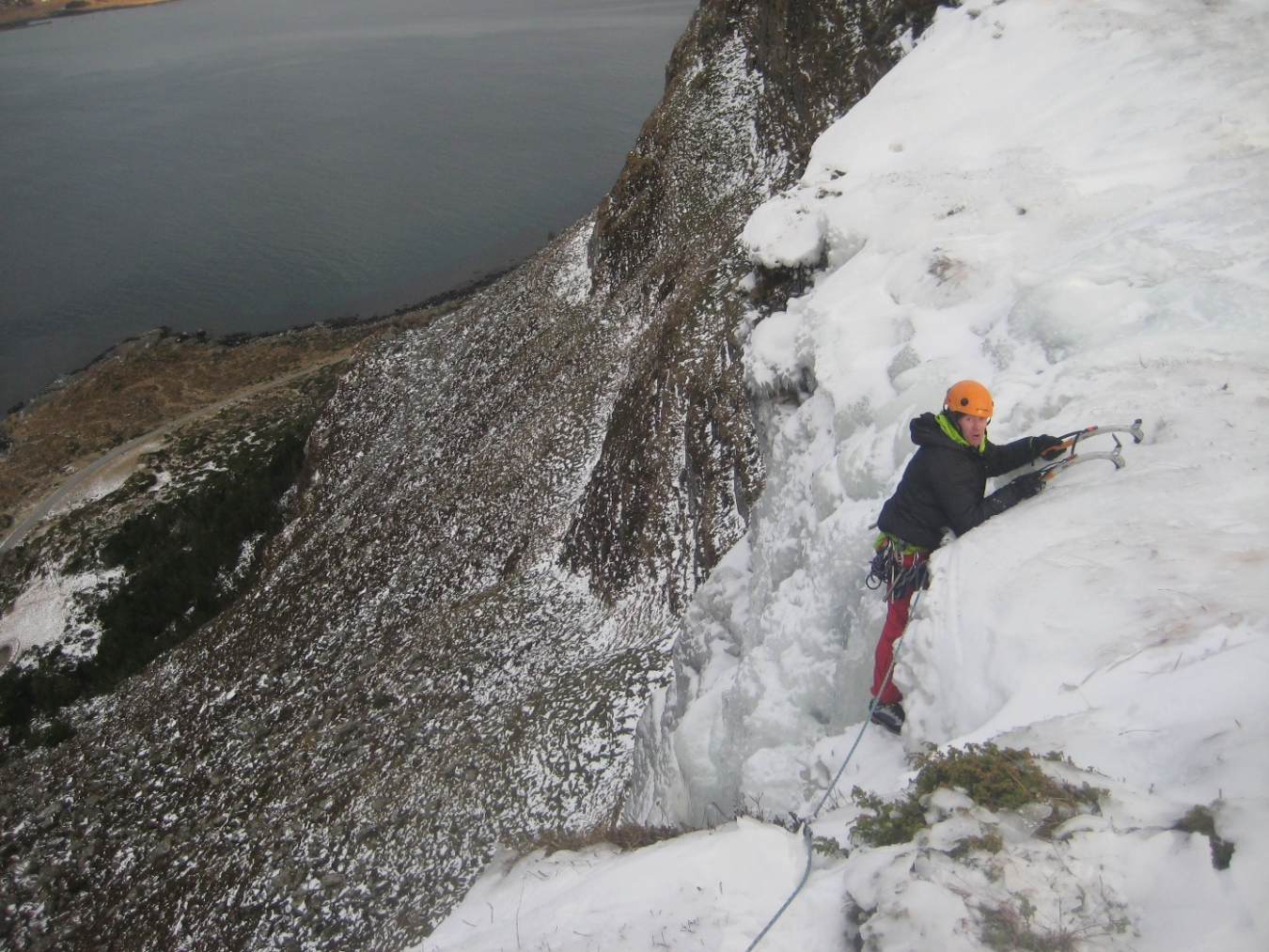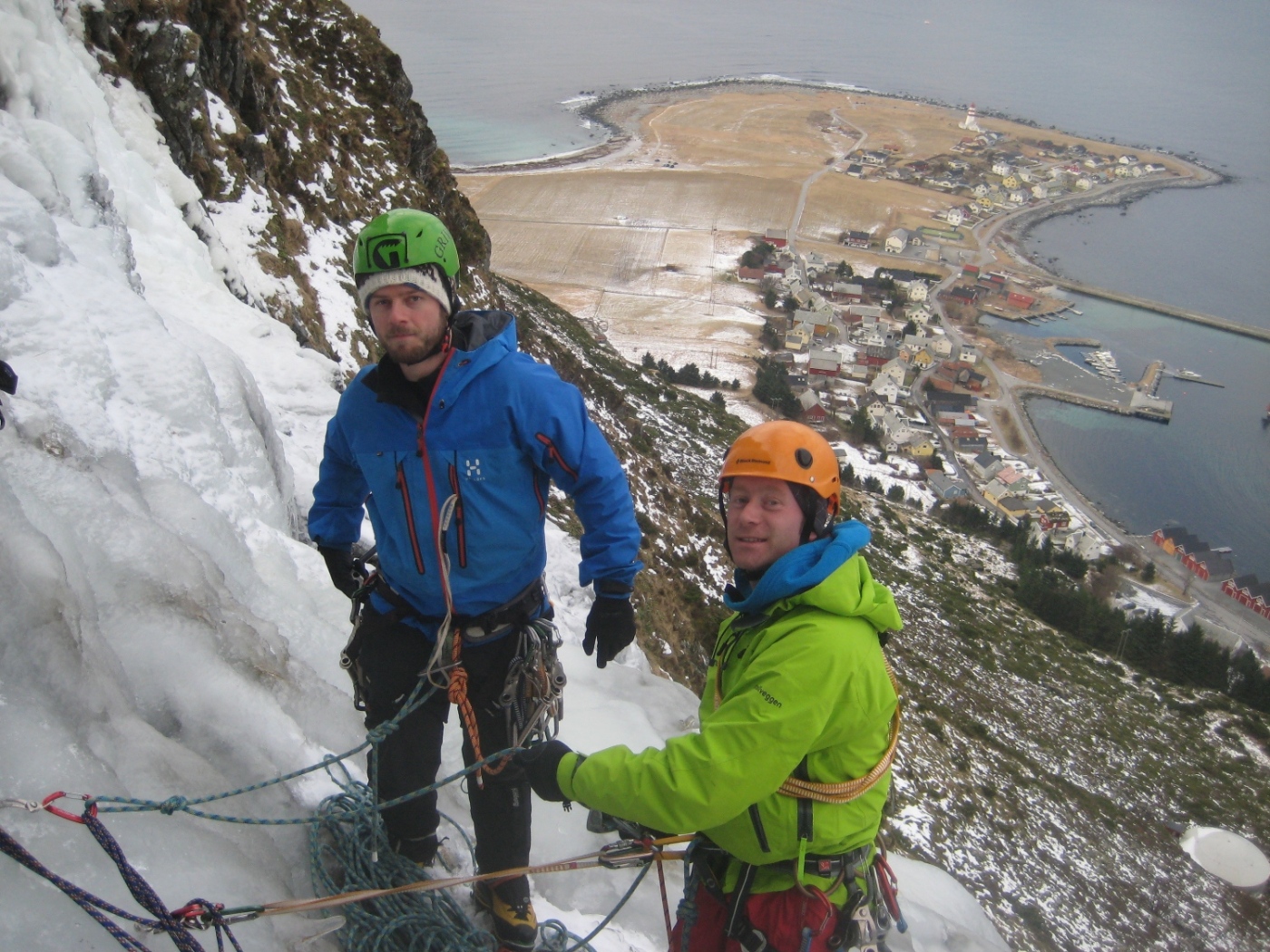 Så langt har det vært en vinter med mye isklatring og lite rapportskriving, er vel på tide å smette inn et bidrag igjen. På Sunnmøre ble isen i lavlandet ødelagt av en lengre mildvær og nedbørsperiode, så mesteparten av turene har funnet sted på Nordmøre. Men merkelig nok overlevde Alnesfossen på Godøy sånn nogen lunde. Siste uka ble det kaldere og oppholdsvær, 1-3 plussgrader på dagtid og et par minus om netterne, fossen grodde seg brukbart til og så farbar ut på fredagens ekskursjon ut til Alnes. Alnesfossen Lørdag formiddag trasker vi opp fra fjøresteinene og til innsteget, anmarsjen er minimal, fossen er bratt og omgivelsene er stilige og kontrastfyllte. Vi studerte og diskuterte linjer fra innsteget. Første taulengde var moderat, kanskje grad WI3, neste taulengde er bratt og har tilsynelatende dårligere is. Er ingen ekspert på isgradering men ville kanskje gitt 2 taulengde grad WI4+ under rådende forhold. Glenn leder opp første taulengde og rigger standplass godt til sides for bratta i toppen, han sikrer meg og Frode opp. God stemning, god is og godt vær Det er ikke vanskelig å se at neste parti blir ei hardere økt, orgelpiper, gardiner og blomkålformasjoner. Jeg går ut i fossen og går igang med 2 taulengde. Første isskru er ikke verdt ei krone, bedre blir det ikke med 2 og 3, klatrer videre og får noen bekymrede bemerkninger fra standplass, en stor og fast isformasjon buler ut mellom orgelpiper og blomkål, her får jeg satt en bombesikker skru, det føltes nødvendig og godt. Slapper av litt her og planlegger ferden videre før jeg fortsetter. Etter å ha forsert det bratteste partiet traverserer jeg forbi et felt med sprutis, slår knokene for hvert hugg og banner og steiker før kommer inn i ei linje med fastere og mer lettsikra is. Nå ser jeg toppen ca 15m over meg, siste biten var en fryd å klatre med fin utsikt utover Alnes og havet. På toppen var isen så dårlig at det var bare å glemme å ankre seg opp med skruer, en stor stein ca 10 meter til høyre for utsteget kunne se brukbar ut. Gravde ut langs kanten på steinen og la tauene som ei slynge rundt og rigga en bombesikker standplass. Ikke optimalt å få standplass så langt til sides for utsteget, men man må ta det man får. Etter å ha sikra opp 2 og 3 mann står vi glade og fornøyde på toppen, stapper i oss noen kjeks og finner ut at vi skal rappelere ned fremfor å gå normalvegen. Fastkilte tau er noe djevelens herk! Johan Skytt er jo et fint punkt for rapell, en svær stein som stikker rett ut fra kanten på toppen, 3-4 meter vil jeg tro den står ut i lufta. Etter en 60m rapell lander vi ca 15-20m over innsteget og vi skal dra ned tauene. Alt er bare velstand helt til tauet kiler seg fast, bom fast. Glenn og frode knyter seg inn i enden og tar springfart men ikkefaen om det løsner. Jeg var stressa, begynte å bli sent ute for kveldens festligheter så jeg grafsa meg opp til Johan Skytt nok en gang, ca 50-100 meter til sides for fossen går det en rygg som er farbar, vil ikke anbefale denne vegen opp.. Fikk uansett ordna opp i tauet og rappelerte ned for 2 gang. Utrolig at det går an å skrive så langt om en 2 taulengders foss, men det var uansett en artig tur, og det er virkelig spesielt på Alnes syns jeg, flott å henge oppe i en isvegg og kikke utover mot fyret og den lille fiskerlandsbyen. Ingen spektakulære naturbilder å vise til, fokuset har en tendens til å dreie seg kun om klatringa.