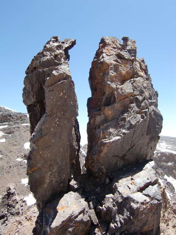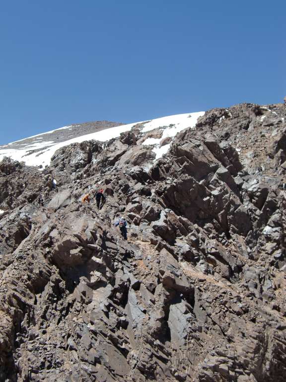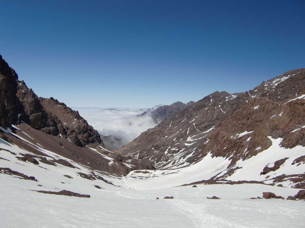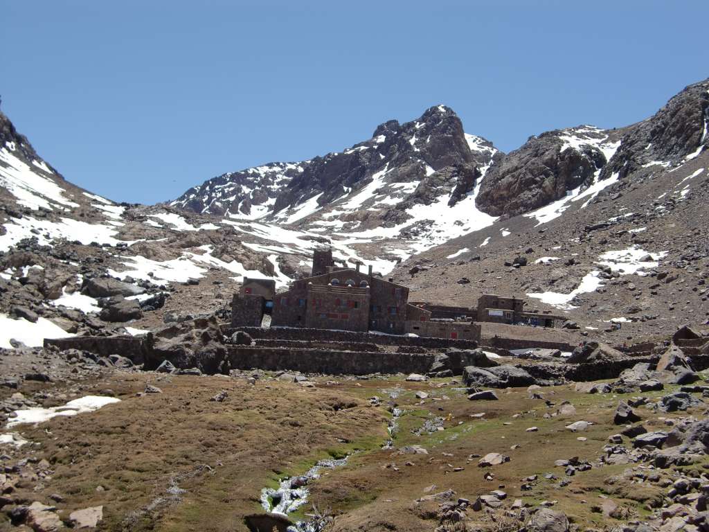 Dag 1 28.april 2013: Etter å ha reist hjemmefra med direktefly til Marrakesh og tatt en drosje opp til fjell-landsbyen Imlil(1700 moh) dagen før, var det på tide å komme seg på tur. Jeg hadde tatt inn for natten på et lite gjestehus litt oppe i lia og etter frokost var det på tide å begynne å bevege seg. Først et lite stykke på en luftig vei opp til en landsby til, og derfra videre på eselstier til den øverste bebyggelsen som består av noen få hus som stort sett livnærer seg på å selge mat og drikke til turister. Også et stykke etter denne byen er det noen utsalg, men de siste 4 km inn til fjellhytta på 3200 moh må man klare seg selv. Med andre ord ikke noe stort poeng i å bære seg skakk på mat og drikke innover. Ca 5 norske kroner for et stort glass med ferskpresset appelsinsaft ute i villmarken er til å leve med. Sekken min veide maks 5 kilo, mens andre folk drasset med seg digre sekker og mange valgte å sende bagasje med muldyr innover. Hva skal man med alle disse tingene innover her? Ved 13-tiden var jeg oppe ved fjellhytta, det er faktisk 2 stykker. Jeg valgte den nederste og ettersom det var et raus med turister på vei bak meg, valgte jeg å sove på et separat rom, så for meg at sovesaler med 16 personer kunne bli lite søvn. Det var en nydelig dag, så jeg bestemte meg for å prøve meg på en topp. Afella på 4043 meter lå ikke så langt unna og skulle være tilgjengelig fra hytta. Det tok 2,5 timer å komme opp, men det var litt utrivelig bratt noen plasser, og jeg forsøkte meg på en annen vei ned. Snøen var myk og fin, og en dal så ut til å føre ned mot fjellhytta. Riktig artig var det å danse og skli nedover, og jeg fulgte ikke så nøye med på retningen. Plutselig var jeg nede på 3000 meter i feil dal. Jeg peilet ut retningen mot fjellhytta, men det var høye fjell i mellom. Etter litt traversering i ullent terreng fant jeg en godt opparbeidet sti som gikk i riktig retning. Denne bar opp til et pass på 3600 meter, og det var litt av et slit å komme seg opp etter alle motbakkene tidligere på dagen. Vel oppe i passet var solen gått ned og det begynte å mørkne. Jeg hadde god sti, Jebel Toubkal så jeg på andre siden av dalen og etter hvert så jeg lysene fra fjellhytta, så jeg var på rett vei igjen - endelig. Det ble et par timer i mørke med hodelykt ned den bratte stien som brakte meg ned i dalen en drøy kilometer nedenfor fjellhytta, og det siste stykket opp til hytta ble drøyt. Over 3000 høydemeter opp og 1500 høydemeter ned denne dagen. På hytta var de i ferd med å dekke på til frokost ved 22-tiden, men jeg fikk heldigvis lurt dem til å lage litt middag til meg. Dette var vel mest en historie om dårlig navigering jeg ikke er så stolt av, men det går helst godt. Dag 2 29. april 2013: Etter ekstreme aktiviteter dagen før, var kroppen litt slapp. Kom meg dog greit opp på Jebel Toubkal i strålende vær, men kaldt og vindfullt. Da jeg tok frem vannflasken på toppen ved 12-tiden i strålende sol var den full av isbiter. Marokko er ikke bare varmt. 3 timer opp, en halvtime på toppen med Bache-Gabrielsen, 1,5 timer ned, etter hvert på myk snø som man kunne skli litt på. De fleste startet grytidlig på denne turen, og jeg hadde toppen for meg selv hele tiden, med unntak av et par fugler og et lite jordekorn(trur eg). På vei ned møtte jeg bare en håndfull mennesker, blant annet noen nederlendere i tennis-sko, som mot alle odds kom seg opp og ned igjen før det mørknet. Sovnet i solen på terrassen, heldigvis med både solbriller og solkrem på, ellers hadde jeg nok ikke sett så pen ut etterpå. Ca 1000 høydemeter opp og ned denne dagen, nærmest hviledag i forhold til dagen før. Dag 3 30. april 2013: Nok en dag med skyfri himmel og turen gikk sydover opp i et fjellpass på 3750 meter. Herfra var det lett klyving et stykke opp mot toppen Ras Ouanoukrim(4083 m). En liten passasje med klyving mellom fortoppen og hovedtoppen bød ikke på noe problem. Fra Ras Ouanoukrim gikk turen ned i en liten sadel og opp på den høyeste toppen i dette fjellmassivet, Timzguida(4088 m), som ikke er like spennende, og ganske flat på toppen. Sjokolade og drikke på toppen, før det bar ned til fjellhytta på 3200 for en liten rast og pakking av retursekk. Lenger nede ble det en lang pause med mange glass ferskpresset appelsinsaft og en omelett før den siste etappen ned til Imlil. 1000 høydemeter opp og 2500 høydemeter ned denne tredje dagen. Tror beina skal hvile litt nå etter noen flotte dager i Atlasfjellene. For de mer ekstreme er det mulig å gå Imlil-Jebel Toubkal t/r på en lang dag. De fleste bruker 2 dager, en dag opp til hytta, og andre dag opp til toppen og helt ned. Jeg syntes det var greit å bruke litt mer tid her oppe og plukke noen flere fjell, når jeg først hadde tatt turen så langt og gått så mange motbakker oppover dalen. Det er fritt å gå og telte i terrenget, med en del overnattingsplasser her og der. Ikke noe problem med å ta seg frem på egen hånd her.