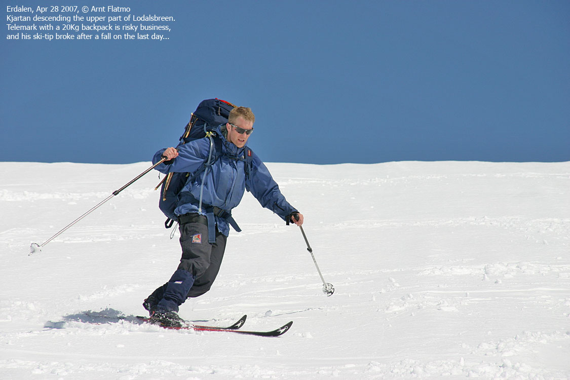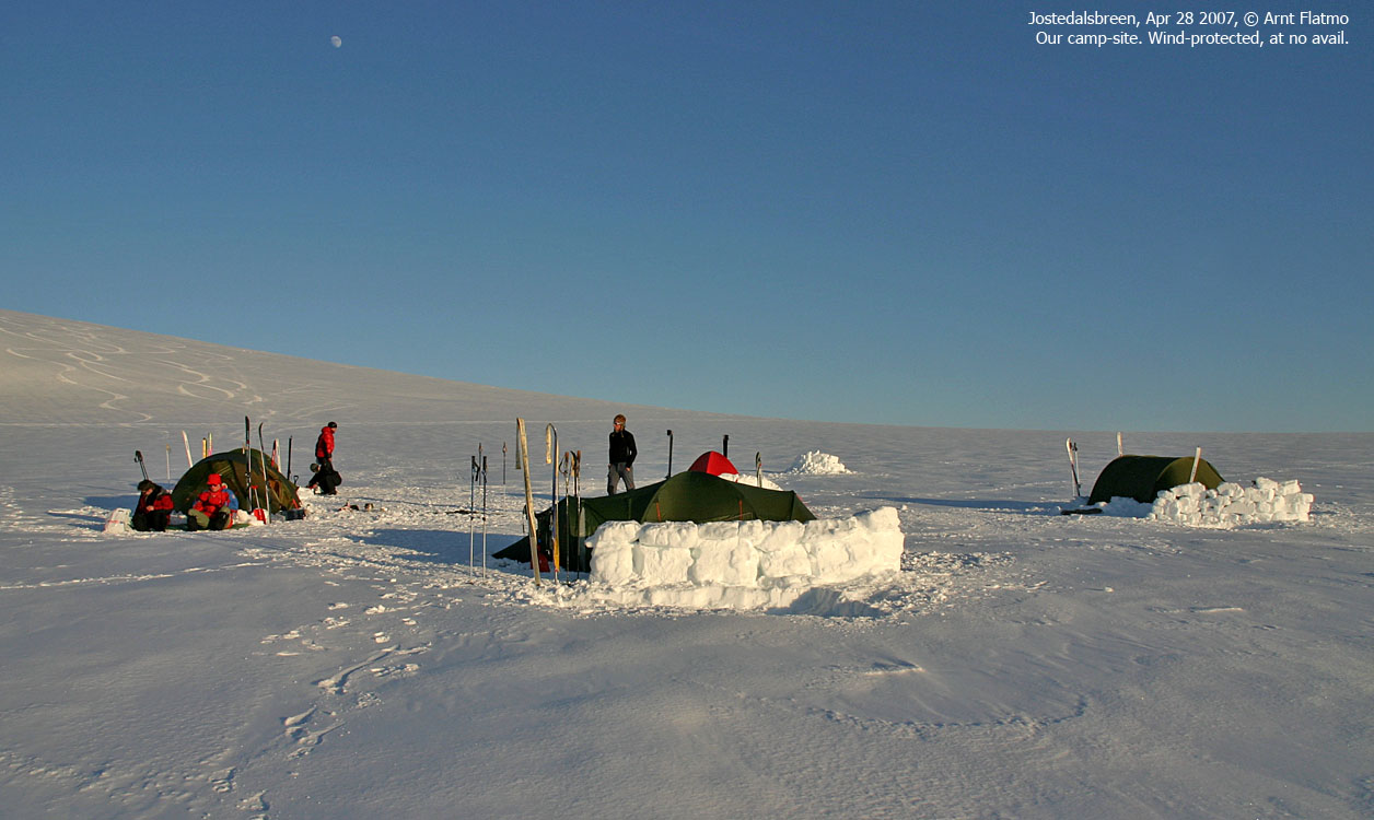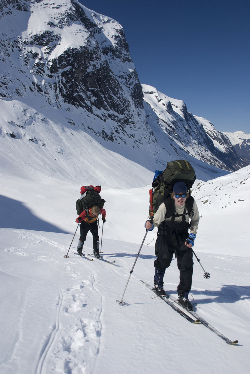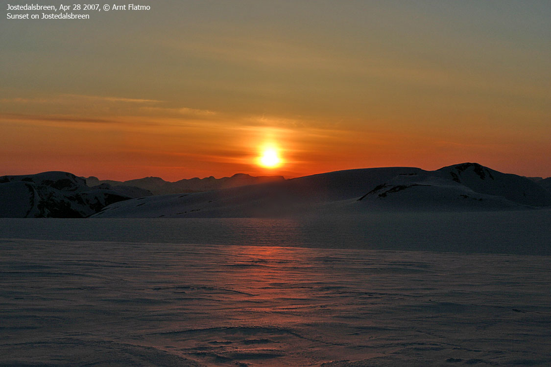 Planen var i utgangspunktet å gå josten helga før 1.mai, men værmeldingane gjorde at andré ringde med nokre dagar før avreise og spurde om framskunding var ok. etter å ha teke ein kjapp oversikt over studia, sa eg sjølvsagt ja til det. andré og camilla kom med bil frå oslo, medan eg tok bussen frå trondheim. eg ankom erdal kl 0300 tirsdag morgon, og fekk nokre timar i posen før vi la i veg oppover mot erdalsbreen. men før den tid hadde vi en ekstra frukost på ein støl. sola skein frå skyfri himmel, og livet var godt. med mat i kroppen var det berre å fortsetje oppover dalen. eg er ingen nobelprisvinnar i bæring av tung sekk, men med innlånt bergans alpinist gjekk også dette overraskande bra. før vi bann oss i tau og gjekk på breen, tok vi oss tid til ein nærare titt på enden av brefallet, der det stakk ut i det frosnet vatnet. vakkert! vel oppe første stigning på breen måtte vi ta ein pause, andré følte seg ikkje heilt på topp og ville ha ein liten time på ryggen i teltet. eg og camilla tok på oss vasskoking, og sovna nesten frå heile greia. vi kom oss tilslutt vidare, og slo første leir på toppen av erdalsbreen, der det heiter høgda (?). 1400 høgdemeter kunne vi sjå oss nøgde med. så var det berre å nyte utsikten mot spisse sunnmørsfjell, som bada i raud solnedgang. onsdag var på ingen måte ein dårligare dag enn forgjengaren sin. vel nede i bunnen av småtten måtte skallet av, og vi gjekk opp iført kun ullundertøy (riktignok type lang). svetten sila, og vi slo ny leir då vi kom opp til ståleskaret. her åt vi middag og tok ein lang middagskvil, før vi labba iveg mot kåpa omlag kl 18. det var nesten vindstille, og sola hang framleis halvhøgt på himmelen. føret opp var perfekt, og vi spaserte nærmast opp med isøks som einaste sikring. på toppen vart vi sitjande ein time, og kikka på vakre hurrungfjell, og flotte vestlandsfjell. vel nede igjen tok vi vegen gjennom sjølve vindgryta i ståleskaret, og kom tilbake til teltet osm hadde lagt utan sol lenge. før vi slokna fekk vi unna mykje snøsmelting før morgondagen. torsdag, den store gå-langt-dagen: med det været vi hadde, så hadde ikkje orientering vore noko problem. vi visste heile tida nøyaktig kor på kartet vi var. difor hadde ingen av oss tenkt på at jostedalsbrekartet er i 1:100000... så om morgonen la vi planen, vi ville gå til flatbrehytta, så vi kunne rekke buss frå fjærland dagen etter. halv ti labba vi iveg, med brenibba som første mål. men allereie før vi kom så langt rauk vaieren på andré sin riva 3-binding. uflaks! heldigvis fekk vi fiksa det, og turen kunne fortsetje. etter brenibba skulle vi altså byrje å ete opp dei drøye to mila til flatbrehytta... det er vel ikkje overraskande for dykk å høyre at vi snart lurte på kvifor det tok så lang tid å komme seg frå delmål til delmål? iallfall vart både høgste breakul og ramnane passert. sistnevnte var åstad for middagseting, ca kl 17. la meg få skyte inn at real viltgryte gjer seg best med varmt vatn... vi fortsette utover kvelden, det var trass alt ikkej så langt igjen og vi kom til å være framme før det vart mørkt... eller ikkje?? på supphellebreen kom hovudlyktene fram, mi for anledninga med nesten frosne batteri... i lysa frå desse seig vi nedover breen, langs gamle spor lagt att av tidligare passerande. det var stup mørkt, og vi såg berre kort vei framfor oss. tilslutt kom vi til skaret, og bar skiene nedover dei drøye to hundre høgdemeterane mot hytta. kor er så hytta? vi gjekk sjølvsagt for langt, og måtte gå opp at ca 50 høgdemeter for å finne hytta. dette hadde ikkje vore så lett utan gps. kl 0100 ramla vi ned i vindgryta rundt hytta, og kunne konstatere at vi måtte grave fram døra. vel inne kunne vi frå hytteboka anta at vi var årets første besøkande, og at det framleis var att kola frå ifjor! ein lang dag, 15,5 timar, var over. men det var då merkeleg lang tid å bruke på 25km? sjølv med øydelagt binding? kartet vart teke fram, og kontrollen viste at vi hadde rett... fredag var det berre å feste skia på sekken og trakke seg nedover i råtesnøen. det tok oss omlag 3 timar å komme ned, og eg kunne kjenne små elver i skoa mesteparten av vegen... resten av turen heim gjekk knirkefritt... laurdag snakka eg med andré igjen, som innen den tid hadde kontrollsjekka distansen igjen, og no altså innsett at kartet slettes ikkje var i 1:50000. torsdagsetappen frå ståleskaret til flatbrehytta hadde altså vorte revidert, og funne til å være 47km! snakkar om pinleg bommert... det positivet er at eg gjekk min lengste dagsmarsj nokon sinne, sannsynligvis med den tungaste sekken eg har hatt nokonsinne. det får meg i det minste til å føle meg litt barsk... fleire bilete frå turen fin de her: