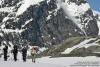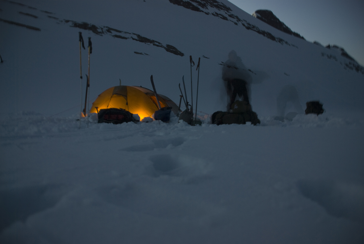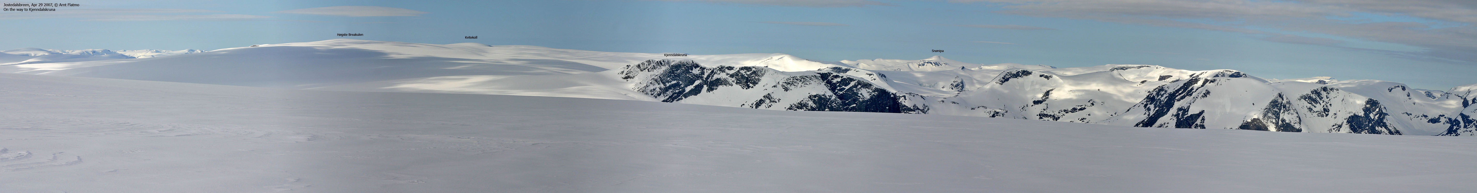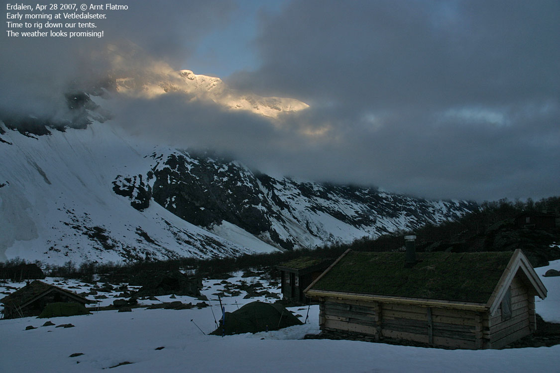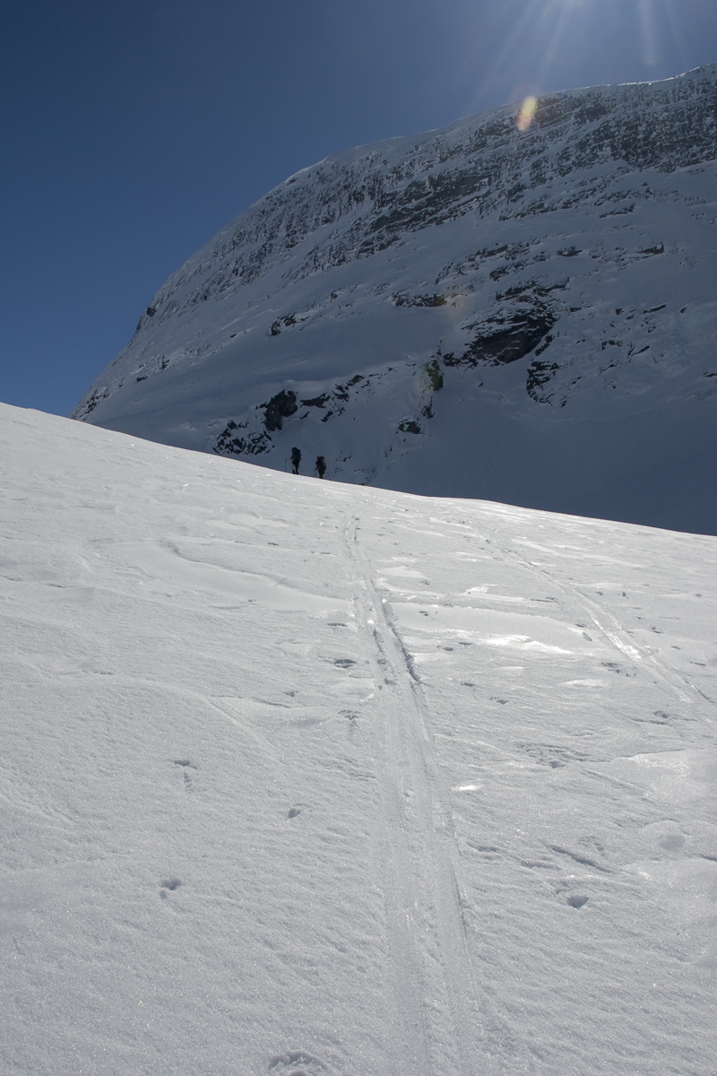 Planen var i utgangspunktet å gå josten helga før 1.mai, men værmeldingane gjorde at andré ringde med nokre dagar før avreise og spurde om framskunding var ok. etter å ha teke ein kjapp oversikt over studia, sa eg sjølvsagt ja til det. andré og camilla kom med bil frå oslo, medan eg tok bussen frå trondheim. eg ankom erdal kl 0300 tirsdag morgon, og fekk nokre timar i posen før vi la i veg oppover mot erdalsbreen. men før den tid hadde vi en ekstra frukost på ein støl. sola skein frå skyfri himmel, og livet var godt. med mat i kroppen var det berre å fortsetje oppover dalen. eg er ingen nobelprisvinnar i bæring av tung sekk, men med innlånt bergans alpinist gjekk også dette overraskande bra. før vi bann oss i tau og gjekk på breen, tok vi oss tid til ein nærare titt på enden av brefallet, der det stakk ut i det frosnet vatnet. vakkert! vel oppe første stigning på breen måtte vi ta ein pause, andré følte seg ikkje heilt på topp og ville ha ein liten time på ryggen i teltet. eg og camilla tok på oss vasskoking, og sovna nesten frå heile greia. vi kom oss tilslutt vidare, og slo første leir på toppen av erdalsbreen, der det heiter høgda (?). 1400 høgdemeter kunne vi sjå oss nøgde med. så var det berre å nyte utsikten mot spisse sunnmørsfjell, som bada i raud solnedgang. onsdag var på ingen måte ein dårligare dag enn forgjengaren sin. vel nede i bunnen av småtten måtte skallet av, og vi gjekk opp iført kun ullundertøy (riktignok type lang). svetten sila, og vi slo ny leir då vi kom opp til ståleskaret. her åt vi middag og tok ein lang middagskvil, før vi labba iveg mot kåpa omlag kl 18. det var nesten vindstille, og sola hang framleis halvhøgt på himmelen. føret opp var perfekt, og vi spaserte nærmast opp med isøks som einaste sikring. på toppen vart vi sitjande ein time, og kikka på vakre hurrungfjell, og flotte vestlandsfjell. vel nede igjen tok vi vegen gjennom sjølve vindgryta i ståleskaret, og kom tilbake til teltet osm hadde lagt utan sol lenge. før vi slokna fekk vi unna mykje snøsmelting før morgondagen. torsdag, den store gå-langt-dagen: med det været vi hadde, så hadde ikkje orientering vore noko problem. vi visste heile tida nøyaktig kor på kartet vi var. difor hadde ingen av oss tenkt på at jostedalsbrekartet er i 1:100000... så om morgonen la vi planen, vi ville gå til flatbrehytta, så vi kunne rekke buss frå fjærland dagen etter. halv ti labba vi iveg, med brenibba som første mål. men allereie før vi kom så langt rauk vaieren på andré sin riva 3-binding. uflaks! heldigvis fekk vi fiksa det, og turen kunne fortsetje. etter brenibba skulle vi altså byrje å ete opp dei drøye to mila til flatbrehytta... det er vel ikkje overraskande for dykk å høyre at vi snart lurte på kvifor det tok så lang tid å komme seg frå delmål til delmål? iallfall vart både høgste breakul og ramnane passert. sistnevnte var åstad for middagseting, ca kl 17. la meg få skyte inn at real viltgryte gjer seg best med varmt vatn... vi fortsette utover kvelden, det var trass alt ikkej så langt igjen og vi kom til å være framme før det vart mørkt... eller ikkje?? på supphellebreen kom hovudlyktene fram, mi for anledninga med nesten frosne batteri... i lysa frå desse seig vi nedover breen, langs gamle spor lagt att av tidligare passerande. det var stup mørkt, og vi såg berre kort vei framfor oss. tilslutt kom vi til skaret, og bar skiene nedover dei drøye to hundre høgdemeterane mot hytta. kor er så hytta? vi gjekk sjølvsagt for langt, og måtte gå opp at ca 50 høgdemeter for å finne hytta. dette hadde ikkje vore så lett utan gps. kl 0100 ramla vi ned i vindgryta rundt hytta, og kunne konstatere at vi måtte grave fram døra. vel inne kunne vi frå hytteboka anta at vi var årets første besøkande, og at det framleis var att kola frå ifjor! ein lang dag, 15,5 timar, var over. men det var då merkeleg lang tid å bruke på 25km? sjølv med øydelagt binding? kartet vart teke fram, og kontrollen viste at vi hadde rett... fredag var det berre å feste skia på sekken og trakke seg nedover i råtesnøen. det tok oss omlag 3 timar å komme ned, og eg kunne kjenne små elver i skoa mesteparten av vegen... resten av turen heim gjekk knirkefritt... laurdag snakka eg med andré igjen, som innen den tid hadde kontrollsjekka distansen igjen, og no altså innsett at kartet slettes ikkje var i 1:50000. torsdagsetappen frå ståleskaret til flatbrehytta hadde altså vorte revidert, og funne til å være 47km! snakkar om pinleg bommert... det positivet er at eg gjekk min lengste dagsmarsj nokon sinne, sannsynligvis med den tungaste sekken eg har hatt nokonsinne. det får meg i det minste til å føle meg litt barsk... fleire bilete frå turen fin de her: