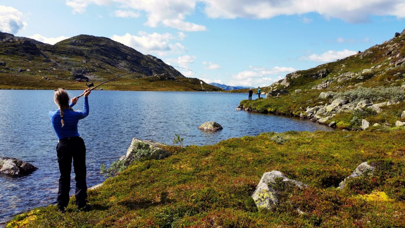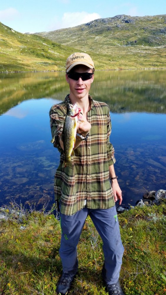 Klassetur på turistforeningens stier – fra Berdalsbu til Tjørnbrotbu Klokken ni på morgenen møtte jeg og ca. 60 andre spente elever på utsiden av skolen vår som ligger på Tromøya utenfor Arendal. Vi skulle på fjelltur sammen! Denne fjellturen er en tradisjon på skolen jeg går på, og det var faktisk 40 års jubileum i år! Her hoppet vi av bussen, klare for tur! Etter å ha stappet bussene fulle av bagasje og forventningsfulle elever, ventet en fire timers kjøretur. Hele trinnet er delt inn i tre klasser, der min klasse (ca. 20 stykk) skulle gå følgende rute: Berdasbru – Berdalsbu – Tjørnbrotsbu – Hovden. Etter en lang busstur var vi fremme, og det var (etter min mening) deilig å få på sekken og snøret fjellskoa skikkelig godt, jeg var klar! Nede under tregrensa var terrenget ganske bløtt, da det hadde regnet før vi kom. Crispi Hunter, jaktstøvlene mine holdt meg tørr som vanlig. Første stopp Første dagen hadde vi ikke særlig langt å gå, kun rundt syv kilometer, men en del stigning. Mange syntes sekkene var tunge og ubehagelige, slik er det gjerne i starten, men man blir vant til det. Vi hadde mange drikkestopp langs elva som renner opp til hytta, herlig med fjellvann! Vi brukte mellom tre og fire timer opp til Berdalsbu, en koselig og liten DNT – hytte. Turistforeningen hadde fått beskjed at vi kom 20 stykk til denne hytten denne datoen, men det kunne selvfølgelig være folk der. Annekset hvor jeg og ti andre sov Hytta var tom, ingen andre mennesker. Jeg sov sammen med ti andre på annekset, mens resten sov i hoved-hytta. Middagen hadde vi fordelt i sekkene våre, og på menyen var det pølser og potetstappe. Utsikten og lyset i fjellet lokker en ut, og før det mørknet dro jeg og fire andre gutter opp på en 1400 meters høyde bak hytta, utrolig fin solnedgang og utsikt! Kveldstur på 1400 meters høyde! Etter å ha studert kartet nøye, ble neste dag planlagt. Elva som renner i dalen forbi Berdalsbu Vi så oss ut en fin løype og dro på en dagstur til Skardstjønnane øst for Berdalsbu. På dagstur mot Skardstjønnane Her ville jeg prøve noen kast med stanga! Var det fiske her tro? Det tok ikke mange kastene før jeg fikk napp, da er det fisk! Jeg mistet tre ørreter før jeg endelig fikk en i land, denne veide 3 hekto. Etter en times tid hadde vi totalt fått seks stykk og sluppet ut noen. Den største veide 4 hekto, ikke særlig stor, men fin stekefisk. Størrelse lå mest rundt 1 og 3 hekto. Fin stekeørret! Storfiskerne Nede igjen på hytta ble ørreten sprøstekt, herlig med fjellørret på skiva til kveldsmat! Neste dag var det på med sekkene igjen, og tidlig avgang. Vi hadde en lang etappe foran oss. Fra Berdalsbu til Tjørnbrotsbu er det rundt 16 kilometer å gå. Vi startet dagens etappe med en lang motbakke i et litt kronglete terreng som ble mer lettgått lenger oppe over tregrensa. Bratt stigning til å begynne med! Berdalsbu kan fortsatt akkurat ses oppe til høyre i bilde På nordsiden av Tverrheiskaret fikk jeg en fin stekeørret i Tverrheitjønni på 1094 moh. Dette var et fint og nokså stort fiskevann med både innos og utos. Videre fulgte vi DNT – stien på vestsiden av Tverrheieggi og opp Korpenutskaret. Jeg tok noen kast med stanga i noen navnløse vann øst for Auversvasseggi her fikk jeg faktisk fin Røye på rundt 2 hekto! Fin Røye! Klokken nærmet seg fire på ettermiddagen, vi hadde gått hele dagen og var klare for å komme frem. Endelig fremme!!! Tjørnbrotbu var og heldigvis folketom og vi steg inn, en klasse på 20 stykk. Jeg sov i Annekset, som i forrige hytte. Jeg likte denne hytten bedre enn forrige både på grunn av utseende og beliggenhet. Det skal sies at denne hytta er den mest besøkte i område. Tjønnebrottjønnane Jeg prøvde å fiske litt i Tjønnebrottjønnane rett sør for hytta, men det virket veldig dødt. Jeg så noen få vak, så det er nok fisk der, men den ville ikke bite på mine lokkemidler. Senere på kvelden gikk jeg opp på høyde på 1450 meter bak hytta (retning nord). Her ligger det ett vann på 1401 meters høyde som jeg så fine vak i, her vil jeg tippe det kan være fin fisk. Dessverre hadde jeg ikke med fiskestangen. På vei ned fra toppen gikk jeg rett på en flokk med seks ryper, stilig! Vi våknet opp til noe mer skyet vær, og det så ut som det ville komme noen drypp i dag. Etter hytta var ryddet og vasket, satte vi kursen mot Hovden. Dette var en strekning på en mil og vi regnet med å bruke mellom fire og fem timer med stopp. Litt mer overskyet på vei ned mot Hovden Jeg pakket sammen stangen på morgenen, så det ble ikke fisket noe i vannene på vei nedover. Naturen var vakker selv om sikten var begrenset. Etter et par timer var vi nede i tregrensen igjen. Det siste stykke (kanskje to kilometer) gikk vi på grusvei til vi kom ned til hovedveien som går til Hovden. Vi fulgte denne et lite stykke til vi kom til hyttene vi skulle sove i til i morgen. Alle var klare for en god dusj! Neste dag tok jeg bussen hjemover mot Tromøya igjen. Det hadde vært en skikkelig vellykket tur med gode kompiser. Den tradisjonelle fjellturen i tiende klasse har vært et glimrende startskudd på det siste året på ungdomsskolen! Les flere slike tur-rapporter på bloggen min her!