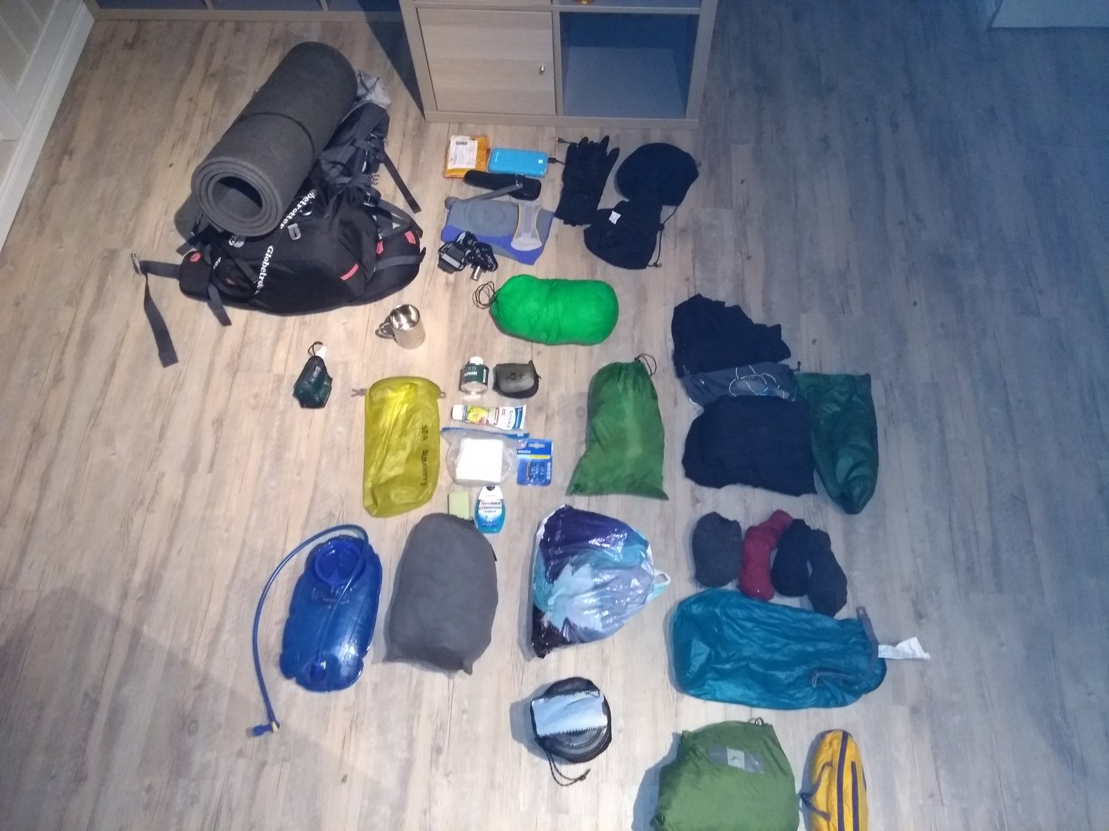Det nærmer seg årets langtur og da er forberedelsene selvfølgelig i gang. Det er jo i så måte ikke så mye som kreves siden dette blir mitt 3 forsøk på å nå samme mål. Veien mot målet, bokstavlig talt, er stort sett den samme, men noen endringer har det blitt. Når det gjelder ruta velger jeg i år å krysse Nordmarka fra øst til vest. Ikke for å spare tid og krefter, tvert i mot, men mer for å få litt variasjon i forhold til tidligere turer. Selv om jeg er født og oppvokst i Groruddalen i Oslo´s utkant er Nordmarka stort sett et uskrevet blad for meg. Forespørsler her på Fjellforum med tilhørende gode tips og @Memento mori sine bilder av diverse skilt både i vinterdrakt og mer sommerlige toner nå nylig, vil forhåpentlig sikre at jeg ikke roter meg helt bort. Vist det står Hønefoss på skiltet når jeg kommer ut av skauen passer det bra med planen om å følge 7´ern videre opp Hallingdalen og over vidda mot vest. Når det gjelder utstyret, dvs sykkelen, har jeg også foretatt noen endringer. Tidlig i våres skiftet jeg til lettere gir etter gode råd fra @kardam. Prosjektet er beskrevet og ligger her på forumet under Sykkel for de som måtte være interessert. Et nytt sete ble det også når originalsetet ble erstattet av et Brooks B17. Husker ikke (jeg er snart 64) om jeg har skrevet noe om det på forumet, eller om det ligger her. Og for å toppe det hele ble nytt speil montert til applaus fra min kjære som ikke liker at jeg sykler på trafikkerte veier. Det gjør i og for seg ikke jeg heller, men noen ganger må man. Resten er stort sett gammelt og velkjent og trenger bare en siste sjekk før det forsvinner ned i sykkelveskene. Teller litt på knappene om jeg skal ta med et ordentlig kamera, eller om jeg skal satse alt på Gopro Hero 6. Er veldig fristet på bare Gopro, men lyden bekymrer meg. Skal telle noen fler knapper før jeg bestemmer meg. Foreløpig ser samlingen av elektronikk slik ut. Jeg velger egen lader til mobilen siden det er den som trenger påfyll oftest. Radio, kamera og hodelykt går sammen på USB-pluggen. Solcellepanelet får duge når jeg ikke har annen strøm i nærheten. Liggeunderlag og pute er pumpet opp for å sjekke om de holder på lufta. Thermarest NeoAir Xlite Large og pute fra JR Gear. Den gamle posen blir med i år også siden jeg ikke finner noen god erstatter. Posen har mange gode kvaliteter, særlig vist jeg ser bort fra dun og fjær. Men siden dunposer ofte rangeres nettopp for sine dun og fjærkvaliteter henger ikke denne helt med. Omvendt av min vektutvikling har denne posen lettet sin vekt med hele 412g. ja kanskje ennå mer. I sin ungdom veide den 1790g og på kjøkkenvekta nå idag klokket den inn på 1378g inkludert kompresjonsposen. Jeg har tidligere mistenkt at den var fylt med dun og fjær fra trekkfugl, nå vet jeg. Kommer til å oppdatere tråden med småplukk fram til turstart.