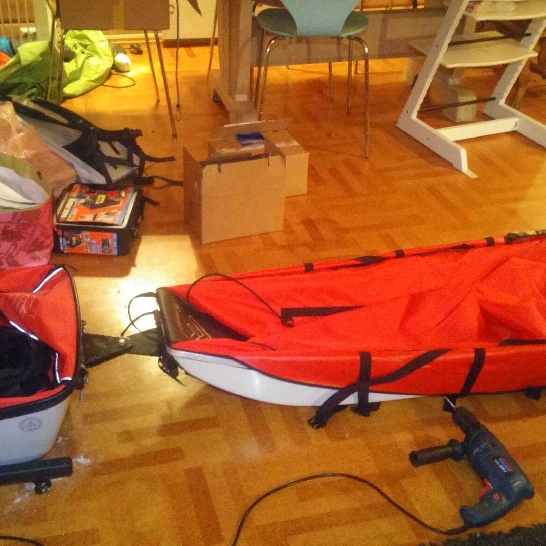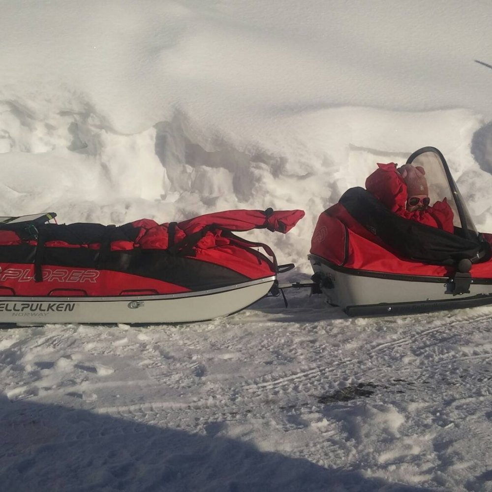 Kople barnepulk med Fjllpulken Xplorer 168 Min første post her inne. Tenkte jeg skulle legge ut litt info om mine erfaringer og løsninger knyttet til forberedelser med det å dra på langtur på vinteren i fjellet med barn og utstyr. Spesifikt gjelder det valg av pulk og modifisering av to pulker sammen for å kunne få med seg avkom OG alt utstyr for 2 måneder. 1. Jeg har lekt med flere løsninger for overnevnte problemstilling. Jeg har i tillegg til barnepulk fra Fjellpulken også en Thule sykkelvogn som kan gjøres om til pulk. Fordelen er at barnet kommer opp fra bakken og er godt kapslet inne. Også mer plass om man slenger på vanntttbagger inne i vognen (dersom du har toseter), samt 2 stk vanntettposer bakpå. Mer plass altså enn Fjellpulken. Etter samtale med en som selger Thule ble det fort klart at mine bekymringer ble bekreftet; galskap var konklusjonen. Den vil ikke tåle påkjenningene som en slik tur gir. Forkastet ideen og søkte inspirasjon. Fant en link her inne om en far som koplet på en mindre transport pulk bak barnepulken. (Finner ikke linken nå dessverre). Etter en del sparring med bla Fjellpulken ble dette løsningen også for meg. Men jeg skal på lengre tur og trengte derfor mer plass. Her kommer en beskrivelse av hva jeg gjorde av modifiseringer. 2. Xplorer har tre festepunkter til draget i motsetningen til tur varianten Xcountry (som er største med 144). Jeg trengte større. Det innebærer at «søsterfeste»/koplingen man kan kjøpe fra Fjellpulken til å kople to pulker sammen ikke passer. (Fungerer bare medio fester). Jeg freste derfor ut poppnaglene til det midterste feste og limte på gaffatape. 3. Målte nøye opp festepunktet for de to feste dingsene som jeg monterte på baksiden av barnepulken. Pass på at selve koplet er i vater. Og husk å få det sentrert naturligvis. Vipps, du har nå et vogntog av en pulk😁