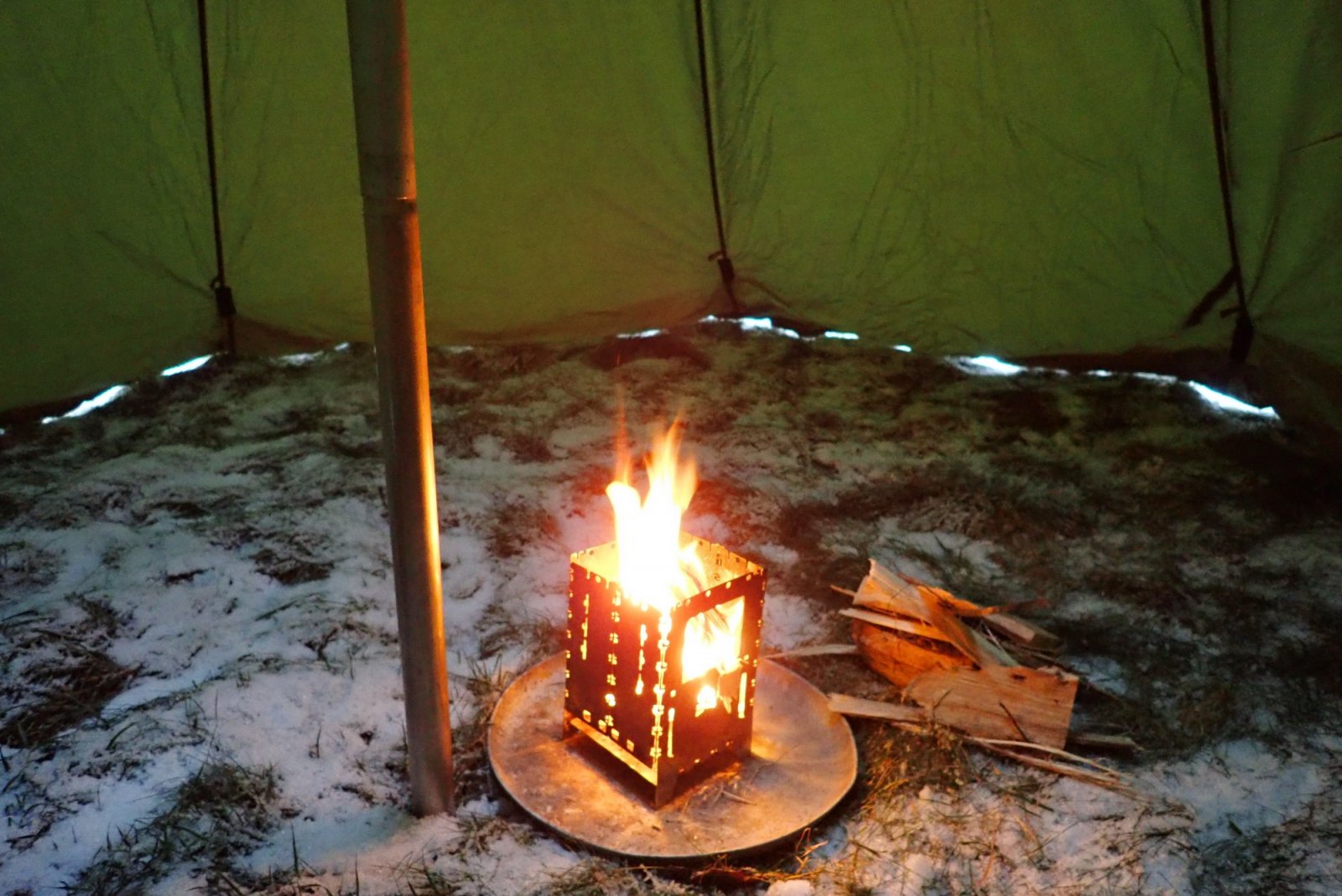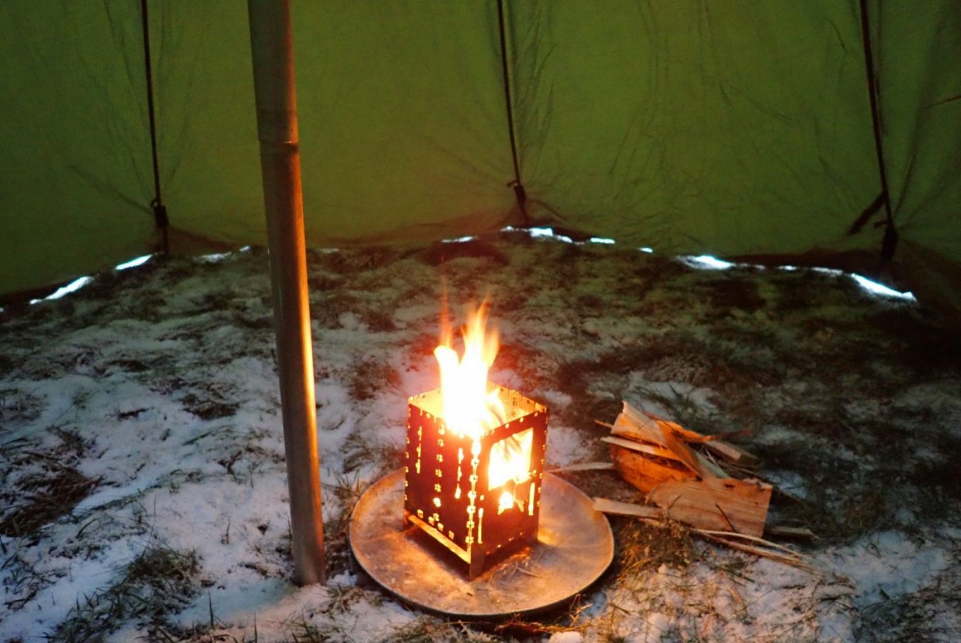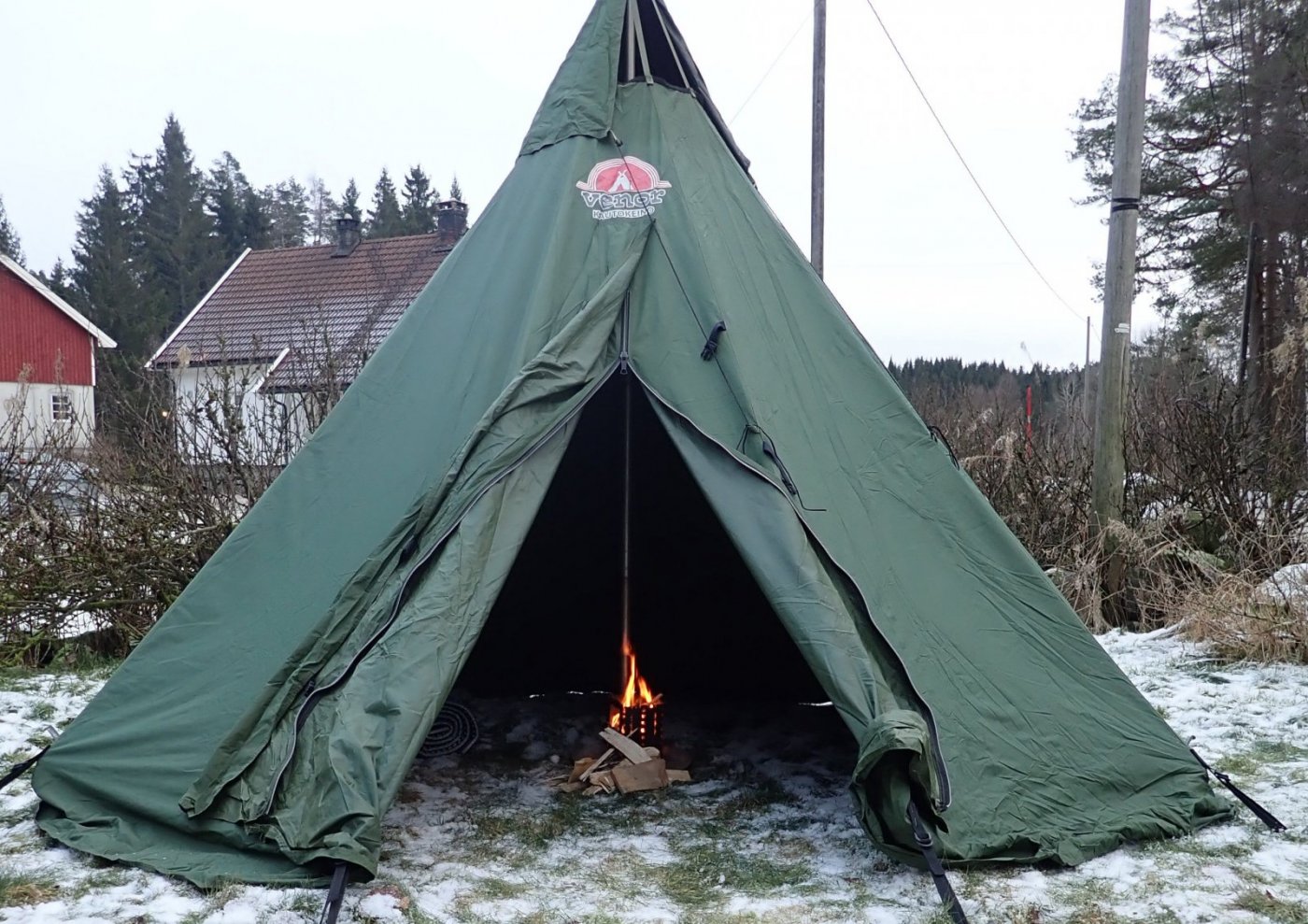 Siden lavvuen vår har ligget på lager noen år, måtte den opp og stå slik at vi kunne sjekke at den virkelig er i god stand. Og det er den! Men samtidig testet vi hvordan kvistbrenneren vår fungerte som erstatning for et tradisjonelt bål. Fungerer glimrende! Passe varme, og god kontroll over "bålet", men må mates oftere selvsagt. Samtidig er kvistbrenneren glimrende til å koke på. Da vet vi det til vi drar på en tur lenger enn ut i hagen.