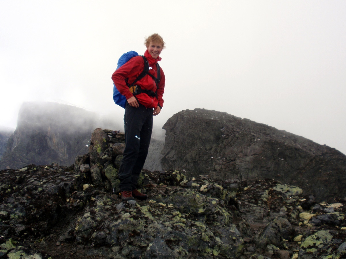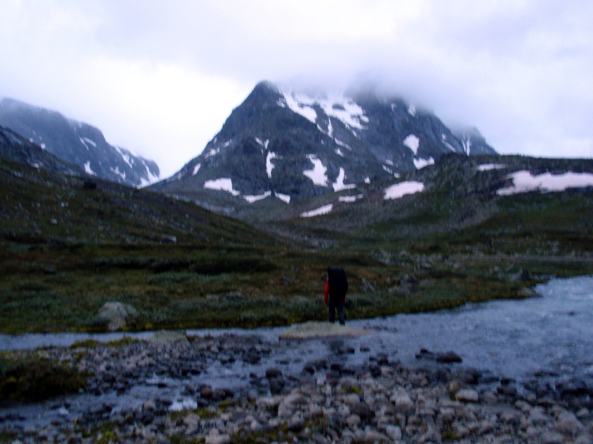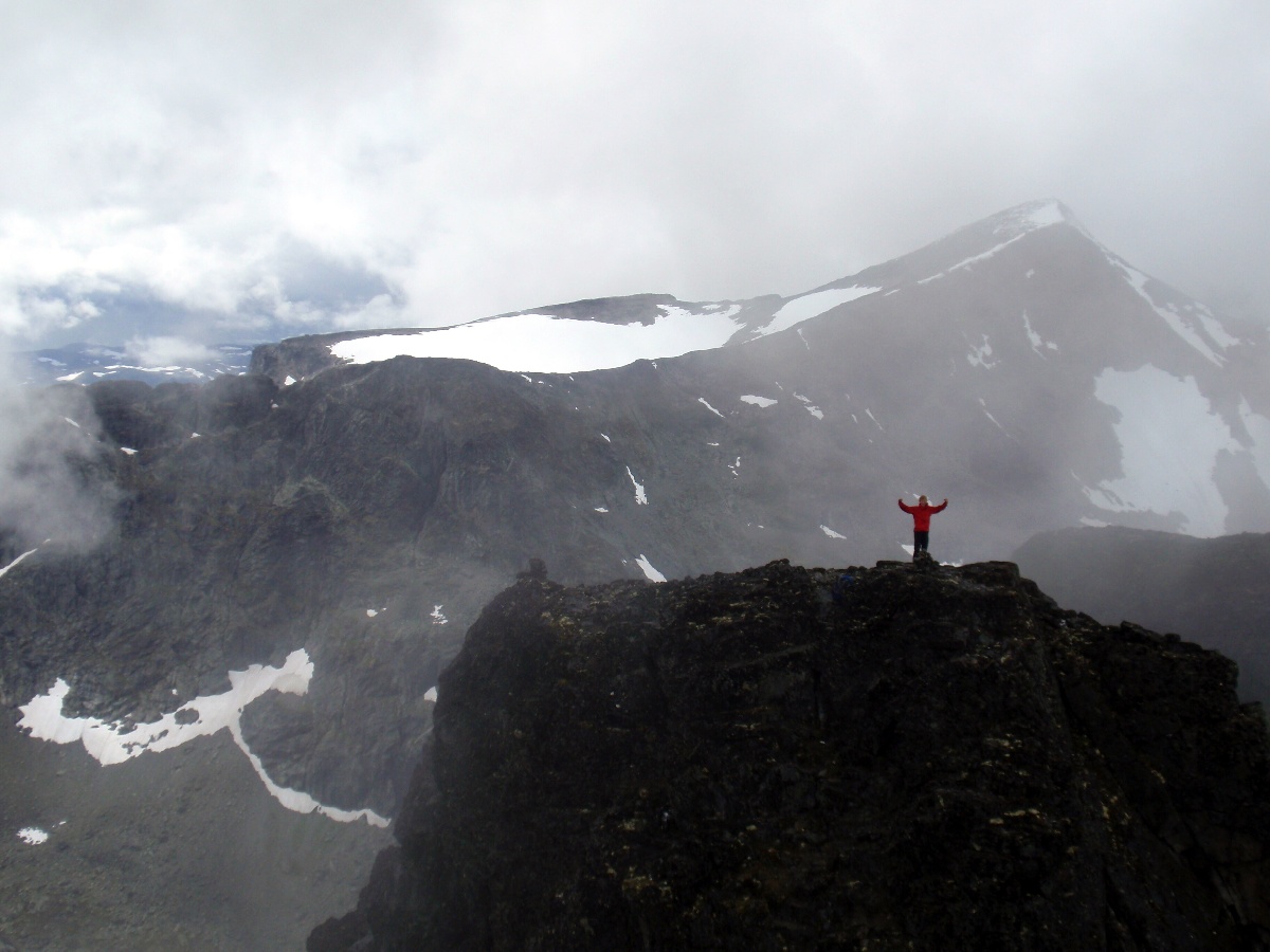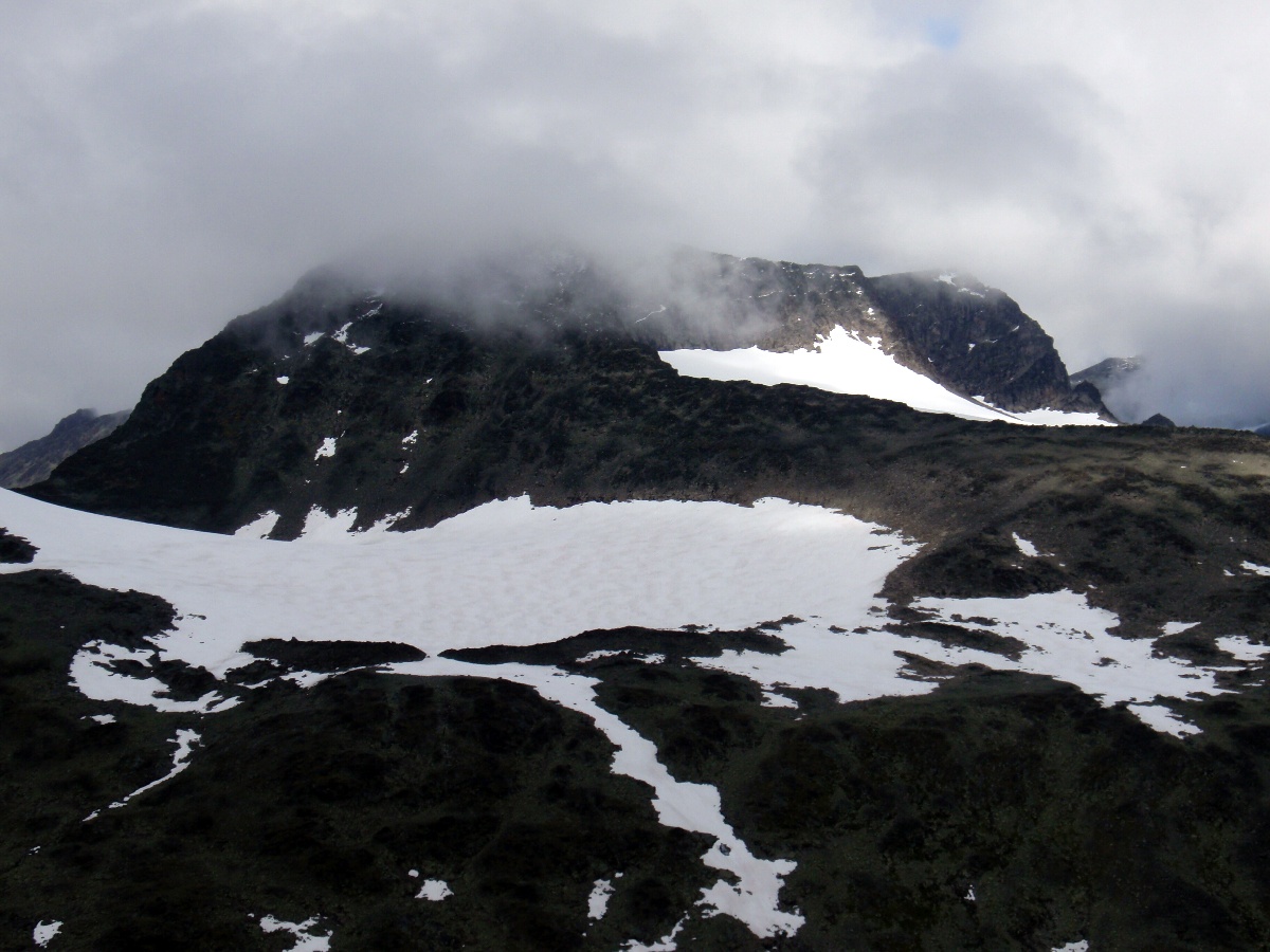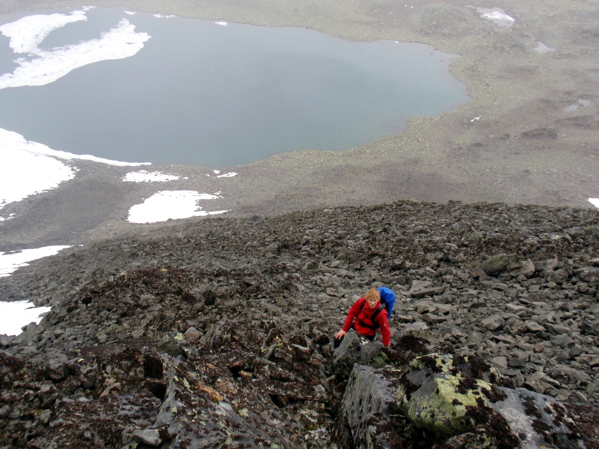 Fredag – leting etter leirplass: Carl Fredrik hadde fått fri fra jobben på Oslo Sportslager og spurte om jeg og Bjørn-Even var keen på en siste fjelltur før skolestart. Selvfølgelig var vi det, Men Bjørn-Even kunne ikke være med denne gangen. Veldig synd med fjelltur uten ”moroklumpen” og entusiasten Bjørn-Even! Vi var heldige, Onkel Halvor skulle over fjellet for å delta på Skåla Opp lørdag så vi satt på med ham til Valdresflya. Han kunne også hente oss søndag siden han skulle på hyttetur til Homborsund på mandag, perfekt for oss! Sekkene var godt pakket med klær, telt, mat, gassapparat og annet utstyr. Vi plukket opp Carl Fredrik i Sandvika, i bilen hadde jeg en badevekt vi kunne veie sekkene. Min lå på 14 kg og CF sin på 20 kg! Riktignok hadde CF 3-mannsteltet i sin sekk. Da vi passerte Bagn var vi som vanlig spente på om vi kunne skimte Galdebergstind og Slettmarkpiggen i det fjerne, de var borte i skyene, men yr.no hadde lovt oss to solrike dager både lørdag og søndag, optimismen var der. Etter å ha gaflet i seg noen boller fra Statoil ble vi sluppet av ca. 1 km sør for Heimdalsmunnen. Det var 8 C ute og småregn, Halvor var glad han ikke måtte ut av den varme, trivelige bilen. Klokken 20.00 var vi i gang, og etter bare 5 minutter måtte vi passere noen bekker. Steinene var glatte og Carl Fredrik fikk en våt start på turen da han plumpet i bekken. Sekken ble heldigvis ikke våt så turen var ikke ødelagt. Etter noen kjipe passeringer av Raslebekkene var vi oppe på bandet sør for Raudhamran. Leirungsdalen var vakker, men toppene rundt var badet i tåke. Det var nytt for begge å gå innover denne dalen og begge var spente på hvordan elvekryssingen av Leirungsåe ville gå. Elva var ikke spesielt stri heldigvis, men vi gikk oppover et stykke for å finne et gunstig vadested. Omtrent der elva fra ”Steindalsbreen” kommer ut prøvde vi oss på en vading, det tok litt tid for å finne det beste stedet. Av med skoa og krysse fingrene. Huttetu, for en kald elv! Med sekken på ryggen ble det enda verre. Midtveis, på en av sandtakene tok vi på oss skoene for å prøve å hoppe fra stein til stein resten. Det gikk delvis bra, men til slutt var vi så våte at vi like gjerne vadet med skoa på. Nå var det bare å gå så langt oppover dalen som mulig, og finne en teltplass før vi mørknet ute. Carl Fredrik fant noen fine leirsteder, men jeg ville helst gå så langt som mulig denne dagen. Grunnen var å få en kortere fjelltur neste dag. Vi ble enige om at vi skulle lete til klokken var 22.00. Til slutt fant vi en fin teltplass, slo opp teltet, spiste noen skiver og satte klokka på 07.00. Lørdag – Tjørnholsoksle og Leirungskampen: Dagens plan om været var bra var å ta Tjørnholsoksle, alle Skarvflytindene, Skarvflyløyfttinden, Austre Leirungstind, Midtre Leirungstind og Leirungskampen. Men da vi våknet hørte vi regnet dryppet på teltduken, ute var fjellene enda mer tåkefylt enn gårsdagen! Huff, vi unnet oss heller mer søvn og satte klokken på 08.30. Da vi våknet hadde regnet stanset, men skyene var der stadig. Vi kokte oss havregrøt og spiste noen skiver, og la i vei fra teltet med friskt mot og håp om klarning i været. Etter 1timer og 30minutter stod vi på toppen av Tjørnholsoksle (2145) i tåke og snø på bakken. CF hadde lovet faren sin å ikke gå på Skarvflytindene om det var tåke, men det var det. Planen ble da å gå ned Skarvflyen for så å runde ryggen og gå opp til Nørdre Skarvflytind, kanskje skyene forsvant til da. Men etter hvert da vi kom ut på Tjørnholsoksle sin nordrygg ble vi møtt med snø opp til knærne. En kombinasjon av gjennomslagsnø og tåke gjorde at vi snudde og gikk ned til Leirungsdalen igjen. Når vi kom under tåka begynte det utrolig nok å klarne mer og mer, etter hvert fikk vi øye på Leirungskampen, så Vestre Kalvehøgde, Kvitskardstind og Austre Leirungstinden! Kanskje vi kunne ta en til topp likevel. Vi tok oss GOD tid til å gå opp mot Svartdalsbandet. På veien tok vi en bedre lunsj ved Leirungstjønnin, pent ved stranda. Tre karer med fulle sekker på vei mot Svartdalen passerte oss mens vi lunsjet. Da vi kom til 1678-vannet rundet vi opp nordsiden av Leirungskampen, gikk i løs ur før vi var oppe på nordvestryggen. Etter noen hundre høydemetre stod vi på toppen av Leirungskampen N-2. Skyene drev forbi, og etter hvert dukket Torfinnstindane opp, et fristende mål for neste år! Herfra var det bare å kruse bort til Leirungskampen N-1 og Leirungskampen, litt lett klyving, men langt fra vanskelig. Det går en renne med løs grus siste stykket til hovedtoppen. Da vi fikk tatt noen photos spiste vi litt niste på Leirungskampen N-2, her fikk vi også telefondekning! På nedturen var steinene sleipe, så vi tok det helt piano. Lenger nede så vi en fyr med gul/svart jakke på sikker kurs mot oss, men da vi kom lenger ned var fyren borte, ikke hadde han passert oss heller! Turen tilbake til teltet gikk raskt da vi pratet oss bort, fremme var vi klokken 18.00. En akkurat passe tur, neste dags værmelding er sol og i natt skulle det være ned mot -7c på toppene. Det låter bra hvis det blir skareføre! Da jeg skulle til bekken for å hente vann hører jeg noen lyder bak meg, det er Carl Fredrik som roper. Jeg hører ingenting pga bekken og prøver å åpne ørene, han trodde jeg prøvde å holde meg for ørene! Han skulle fyre primusen, og da fyrstikken ble tent flerret en gedigen flamme opp. Han var redd gassboksen skulle sprenge og kastet apparatet bort fra seg. Ingen var sikre på grunnen så vi lot boksen brenne opp. Selve brenneren var smeltet i stykker da det hele var over. Det rare var at gassen ikke ville slukne da han prøvde å skru gassen ned. Heldigvis skjedde dette etter vi hadde kokt vann til middagen. Men frokosten neste dag bestod av havregryn, vann, salt og syltetøy (ukokt), det var ikke like godt når den var kald. Søndag – Tjørnholsoksle (igjen!), Tjønn