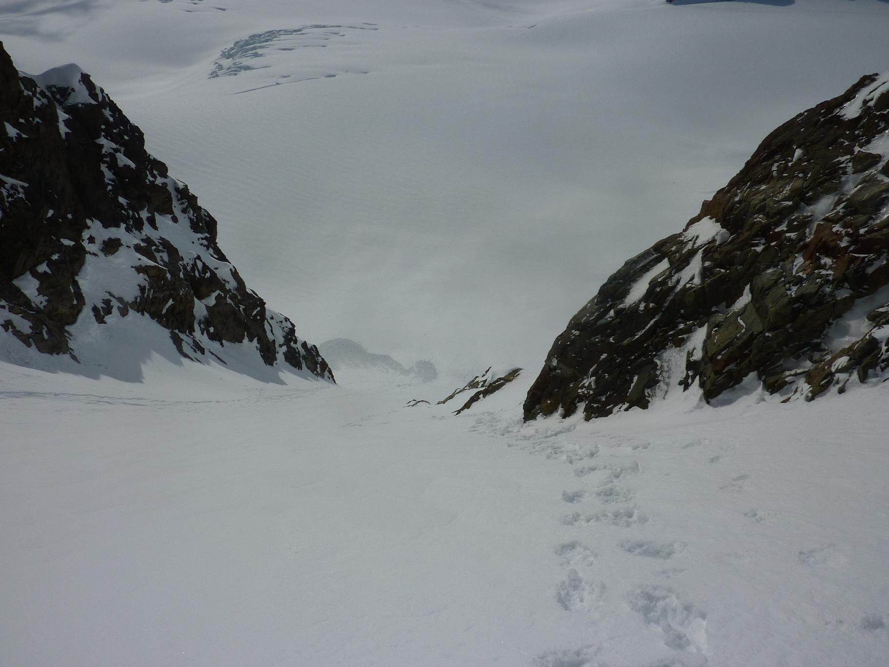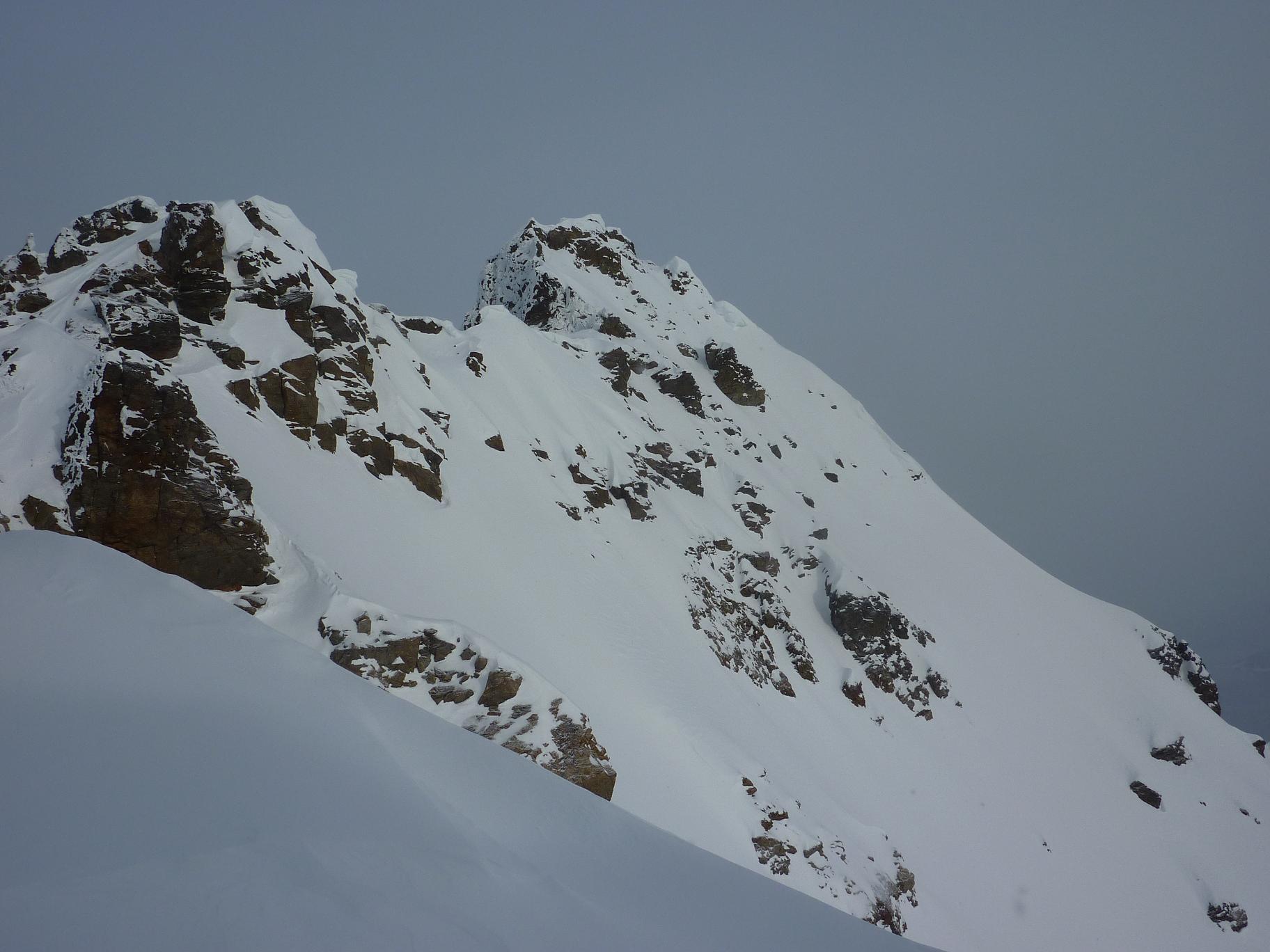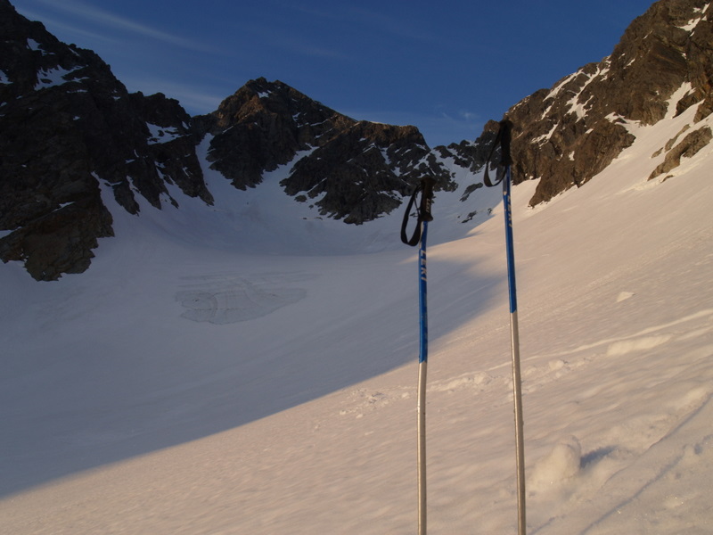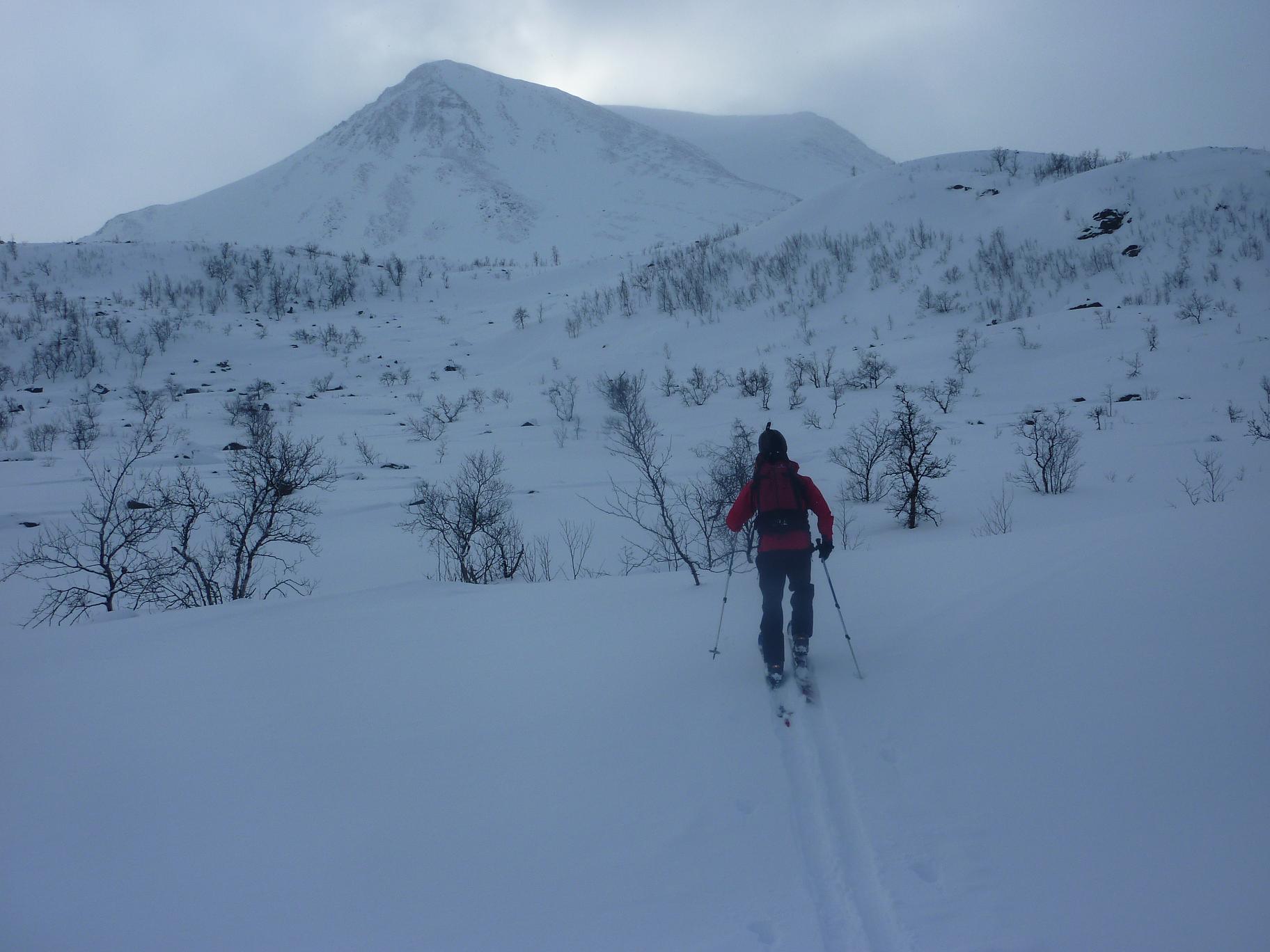 Midtre Balggesvarri, østre topp 1427 og Østre Balggesvarri 1406 har ikke navn på kartet og med 11 kilometers anmarsj før man i det hele tatt ser toppene er dette neppe så veldig mange som gidder å ta seg bryet med et besøk. Av Dissse toppene er det 1427 som ser ut som turens høydepunkt på kartet og fra nabotoppene ser denne toppen fryktinngytende ut. En av de 124 1k toppene jeg har vært mest bekymret for i Lyngsalpene.PÅ 70 tallet fikk 1427 kallenavnet Klokketårnene pga sitt utseende fra nabotoppene. Starten er den samme som til Lyngenklassikeren Daltinden som er av de mest besøkte skifjellene i Lyngsalpene. Starten av turen fra Furuflaten har drøye 5 kilometers marsj inn Lyngsdalen før man kommer seg inn til den 3 kilometer store sletten før Dalbotn. Heldigvis har man mye fint å hvile øynene på inn mot Dalbotn, Etter 8 kilometer på tur er man på drøye 200 moh før man endelig kan begynne å ta litt høyde, Fra Dalbotn fulgte vi elvedalen som kommer ned fra Balggesvahjiehkki, etterhvert kom vi inn på isbreen som vi fulgte forbi punkt 804 der vi etter ca 11 kilometer endelig så dagens 2 turmål og skiftet kurs rett inn mot den navneløse breen mellom de navneløse toppene i dette området som neppe har hatt alt for mange besøkende. Etter ca 5 kilometer og drøye 800 nye høydemeter fra Dalbotn var vi endelig for å starte den artige delen av turen. Vi fulgte en bratt renne på ca 50 grader i retning av det laveste av klokketårnene, like under det laveste tårnet traverserte vi inn mot skardet mellom tårnene i et bratt snøfelt. Fra skardet fikk vi se ruten mot toppen, som så lettere ut en fryktet. Vi hadde bare sett dette beistet av en topp på avstand tidigere og hadde med oss klatreutstyr. Fra skardet var det en luftig travers mellom tårnene før vi gikk en bratt snøbakke opp mot toppen. Det var et lite opptak på halvannen meter like under toppen som gikk greit med isøks og stegjern. På toppen ble vi overrasket av en stor varde og herlig utsikt mot bl.a Nallangaisi, Guhkkesgaisis nordvegg, Jiehkkevarri, Balggesvarri sin høyeste topp, Nallancohkka, Gaskacohkka og Steindalstindene. Returen gikk etter samme ruten ned til innslaget til renna der vi prøvde å holde høyde mot skardet mellom 1406 og 1386. Vi var nede på ca 1050 moh før vi startet stigningen opp mot skardet som ligger på ca 1230 moh. De første ca 130 høydemeterne kom vi oss greit opp med skiene på, 35 graders bakke ca. Den siste biten mot skardet ble brattere- ca 45 grader, det var også litt problematisk å finne en plass vi kunne komme oss opp i skardet pga skavler som hang utfor kanten. Med få valgmuligheter for oppstigning fikk vi oss litt trøbbel med å komme oss opp til skardet med litt klyving på stein/is/snø de siste meterne. Fra skardet var det en enkel skitur på ca 175 høydemeter og en knapp kilometer til den vardeløse toppen. Utsikten fra toppen var som på den første toppen fantastisk. Nedkjøringen med utsikt mot Nallangaisi var nesten verdt turen alene. Nede i skardet klatret jeg og Eivind oss ned det bratte partiet på noen meter, mens Torvind var litt mer kreativ og kom fra til at han bare skulle droppe de 3-4 meterne ned fra skavelen og ned i den 50 grader bratte bakken:) Resten av returen fulgte samme ruten som opp, og med solstek i sporene våre fra turen opp gikk returen på 14 kilometer unna på drøye halvannen time. Vi brukte ca 9 timer på turen på drøye 30 kilometer og 1800 høydemeter. Stegjern og isøks er et minimum for folk som blir fristet av å gå 30 kilometer for å gå 2 topper uten navn:) Flere bilder