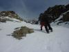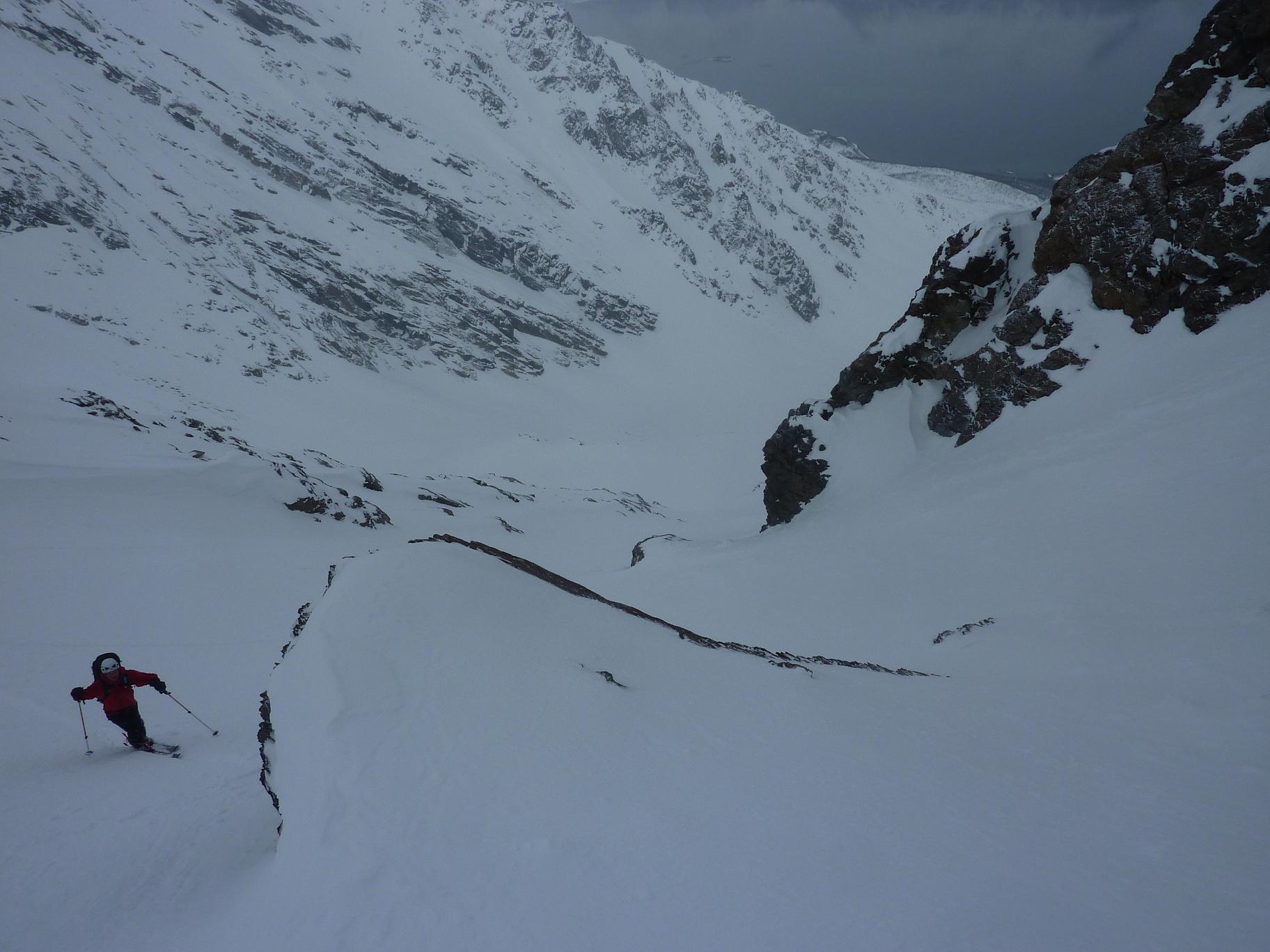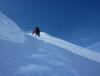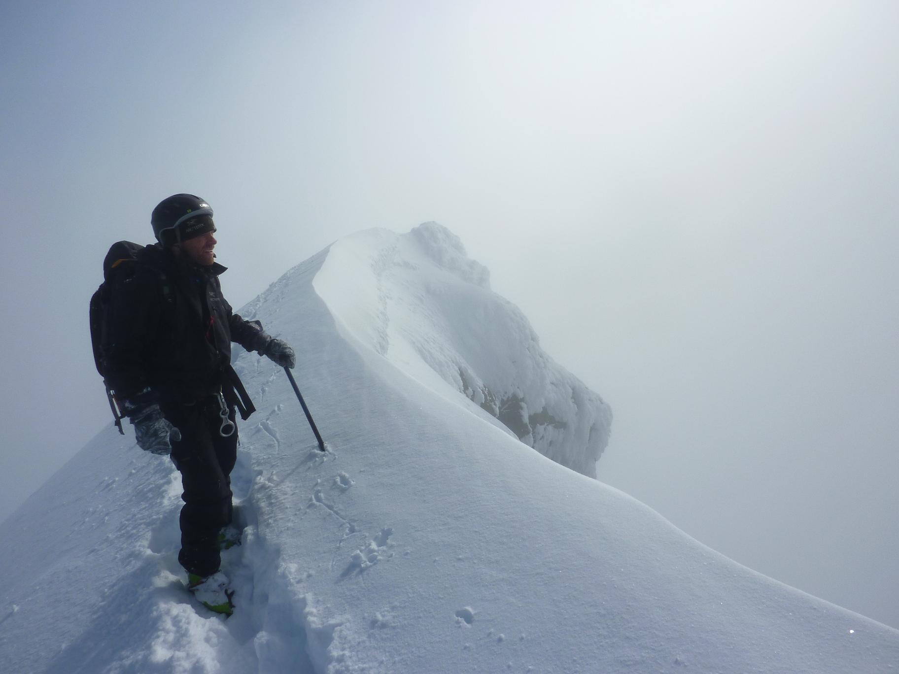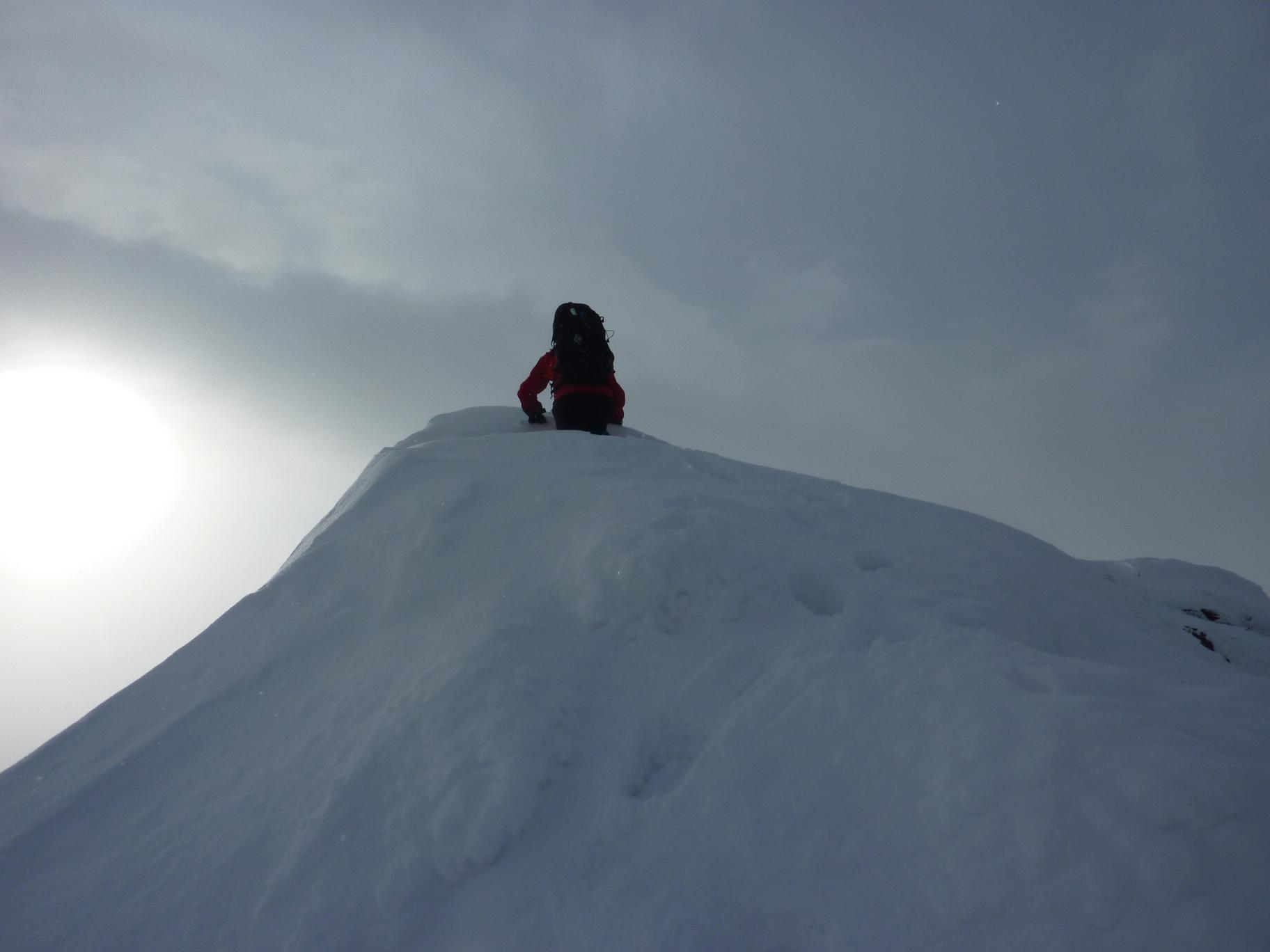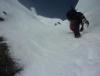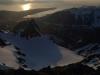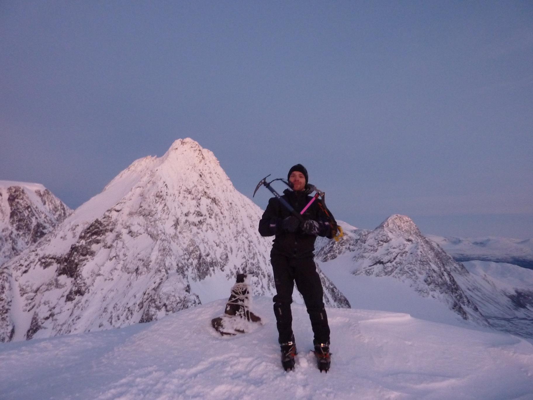 Etter litt ny info i forbindelse med rapporten fra min bomtur til Store Lenangstinden i påska fant jeg og Bjørn(annen turkamerat enn sist) ut at vi skulle prøve på nytt, denne gangen i en renne jeg ikke viste at fantes ved mitt forrige forsøk...Tusen tak Ivaaar:) Vi hadde sett på bilder at det var mulig å bytte renne noen flere ganger for å komme oss opp på eggen nærmest mulig toppen, da eggen er luftig så det holder. Såpass luftig at mitt forrige forsøk på Store Lenangstinden ble avbrutt bare med å se på eggen... Bjørn kom med et forslag om å forsøke Store Lenangstinden natt til Lørdag på torsdagskvelden etter at jeg hadde vært på Høglikka, da hadde jeg lagt planer om en liten topp i Nordreisa i forbindelse med en jobbtur i Nord Troms på fredagen, men jeg kunne ikke la sjansen til en tur til Store Lenangstinden gå ifra meg. Så da satset jeg på å kunne gjennomføre en tur på ettermiddagen, rekke hjem å sove en liten time før fotballtrening og direkte avreise til Lyngen med sisteferga. I alt stresset klarte jeg å glemme goretexbuksa mi, noe jeg oppdaget når vi skulle starte å gå… fikk lånt meg en ny bukse kl 00.45!Tusen takk, Torunn! Buksa ble hentet på Lyngseidet. Vi begge var trøtte, så vi tok oss en times powernap i bilen før vi kjørte til Koppangen igjen. Vi startet å gå ca 03.30, vi hadde valgt å gå om natt for å slippe rasnerver i den bratte sør/sørvest vendte renna. Anmarsjen opp Koppangsbreen og Strupbreen tok ca 3,5 timer før vi tok oss en lunsj og skiftepause før vi startet å gå hovedrenna oppover mot eggen. Hovedrenna var bred og oversiktelig, på godt skiføre ville den vært mulig å kjøre ned på ski. På ca 1530 meter byttet vi ut hovedrenna som var +/- 40 grader med en mye smalere renne som gikk ut til venstre på ca 50 grader, når den renna var brukt opp på 1565 moh måtte vi ta en liten rapell ned i en litt smalere og enda brattere renne som gikk helt opp på eggen. Snøen i rennene var god, bortimot null rasfare. Når vi kom på eggen var konklusjonen at det var et smart trekk av oss å prøve å komme på eggen nærmest mulig toppen, beundrer Petter som har gått den eggen på vinterlige forhold! Vi brukte ca 3 timer fra lunsjen til vi var på toppen og rundt 3 timer på nedturen inkludert en god matpause når vi kom til skiene våre. En perfekt tur, med manglende utsikt som eneste minus. Flere bilder og turbeskrivelse: http://kugo.no/2010/04/store-lenangstinden-1625-moh-3/