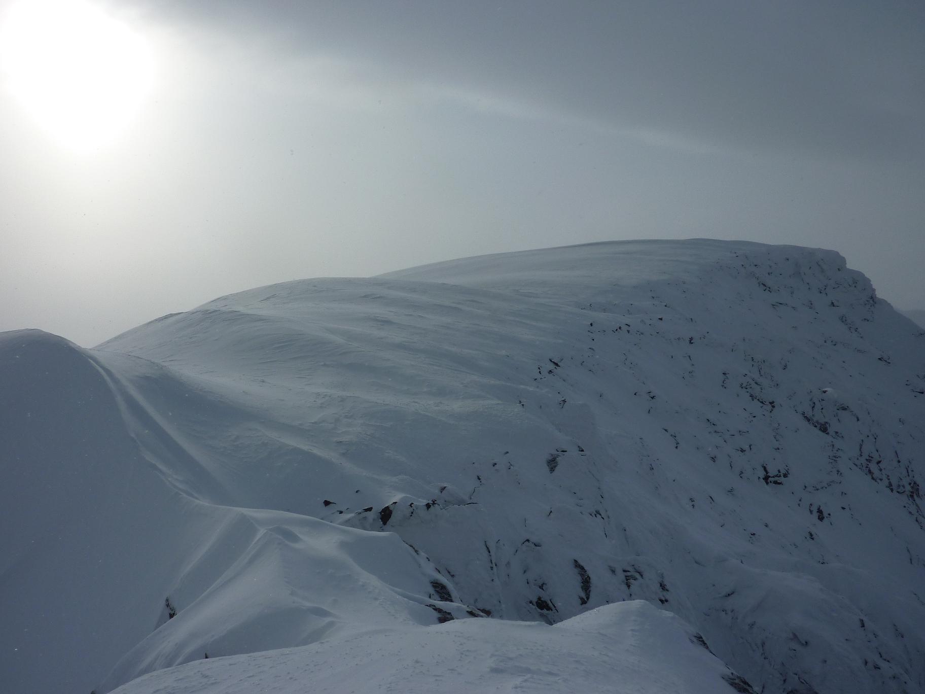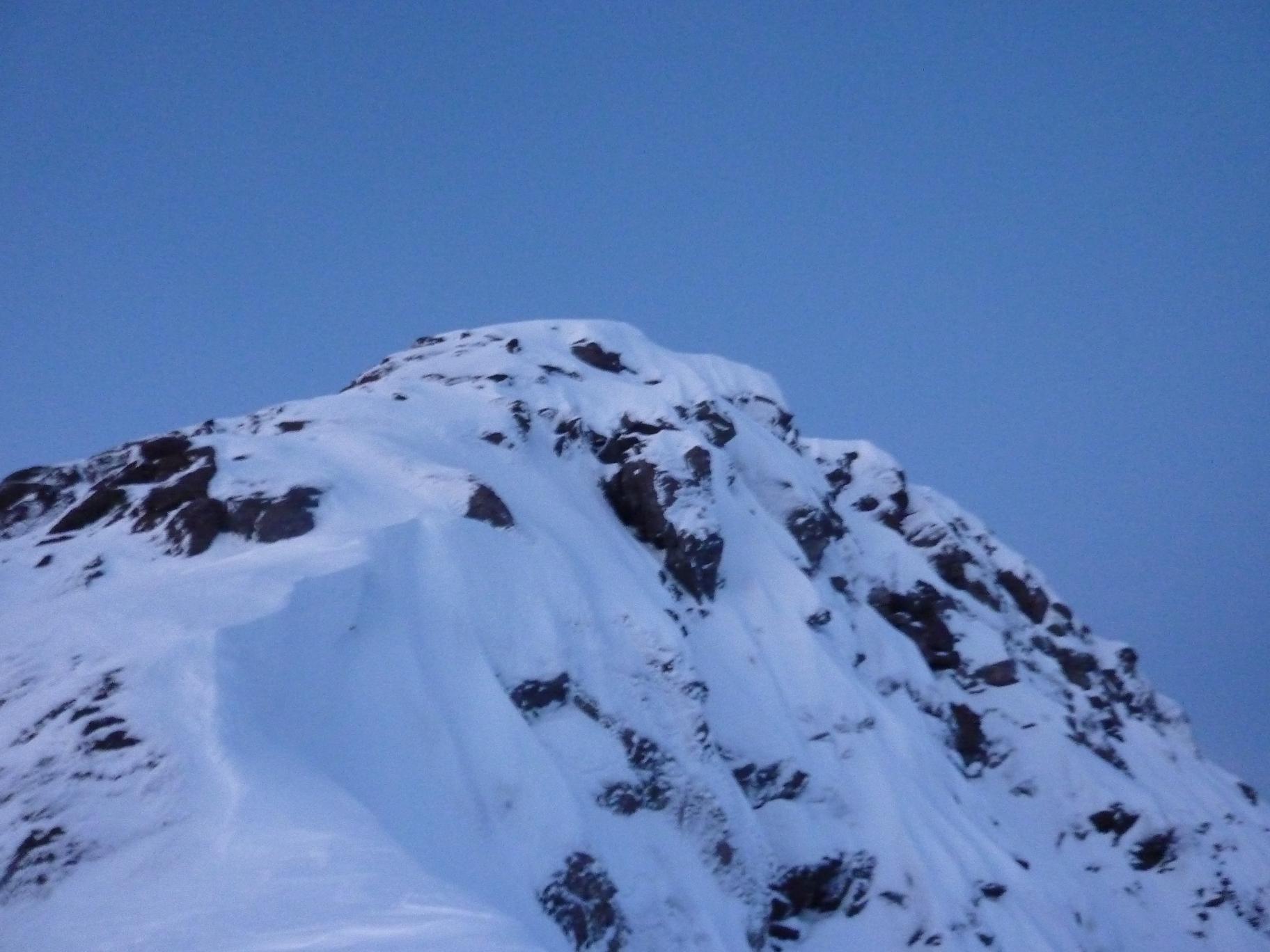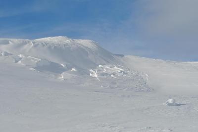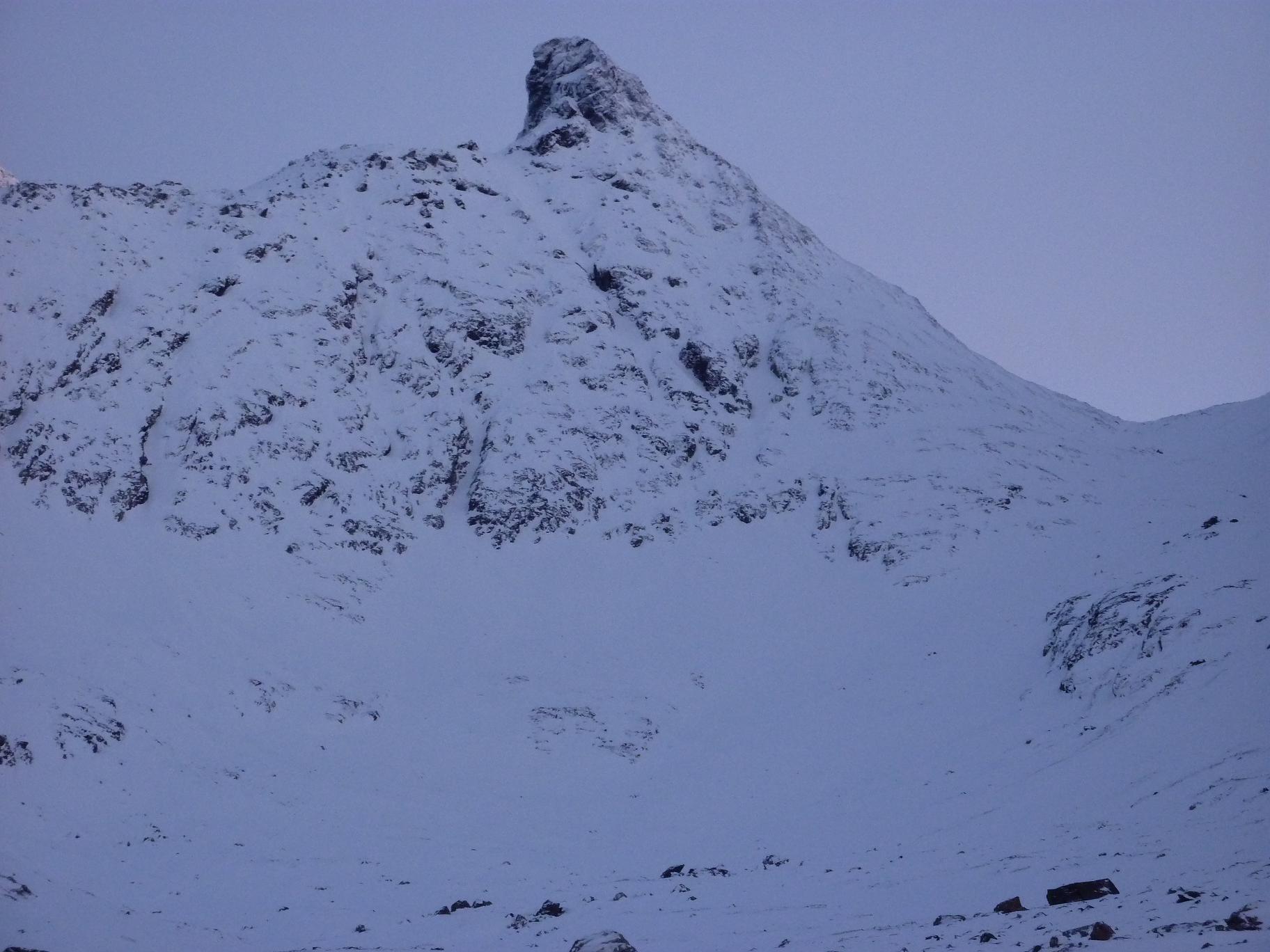 Store Durmålstinden er en av de “ukjente” 1500 meterstoppene på Lyngenhalvøya, med så godt som ingen treff på Google utenom noen topplister. Store Durmålstinden var ett overraskende bra skifjell, med 400 høydemeter i en renne på 30-35 grader+ opp mot ryggen og ett bratt heng på ca 200 moh innerst i Rissmålskardet. Startstedet ved Leirbukta noen km fra Holmbukta ligger ca 1 time og 15 minutters kjøretur unna Tromsø. Fant ingen egnede parkeringsplasser, men siden vi startet turen litt etter 0300 fant vi ut at vi neppe var til sjenanse for andre trafikkanter om vi parkerte i vegkanten. Fra startstedet ser man ruten mot Rissmålskardet, vi gikk omtrent rett opp mot Rissmålskardet, med noen svinger for å holde en liten elvedal opp mot Måsevatnet 255, et vann som forøvrig levde opp til navnet sitt da det var stor måseaktivitet der når vi gikk forbi. De første 300 høydemeterne var i slakt terreng, men det ble brattere de neste 300 meterne opp mot Rissmålskardet. Fra 6-800 moh var det slakt igjen mens vi gikk inn Rissmålskardet, fra 800 moh til 1000 moh gikk vi opp ett bratt heng på ca 35 grader, når vi kom opp henget traverserte vi inn mot renna som går opp til eggen mellom >1480 og Store Durmålstinden, også dette i potensielt skredterreng. Omtrent samtlige av de siste 600 høydemeterne opp mot eggen var 30 grader eller brattere. Renna vi fulgte til eggen var bred i starten, men den ble smalere og brattere jo lengre opp vi kom, ca 20 moh fra eggen satt vi ifra oss skiene da det begynte å bli bratt og liten plass til å svinge. Det lå enm rad med store steiner som stakk opp mitt i renna like før eggen, vi gikk opp på venstresiden av disse og gikk rundt på baksiden. Fra eggen kledde vi på oss stegjern og isøks før vi begynte å klyve oss oppover eggen mot punkt 1567, vi fulgte den ganske smale eggen i ca 100 moh, før vi kom opp på det store flate topplatået på ca 1520 moh. Det var et luftig punkt på eggen like før vi kom inn på topplatået, ellers var eggen grei. Vi hadde desverre litt tåke rundt toppen, så vi hadde litt begrenset utsikt mot mange av “de ukjente” fjellene i området, og jeg som hadde lyst til å ta litt bilder av nabotoppene for å planlegge ruter ble litt skuffet over akkurat det. Ellers var det en meget fin tur til et spennende og ukjent fjell på Lyngenhalvøya. Skiføret var også meget bra, så vi begge var strålende fornøyd med turen til Store Durmålstinden. Flere bilder og turbeskrivelse: http://kugo.no/2010/05/store-durmlstinden-1567-moh/