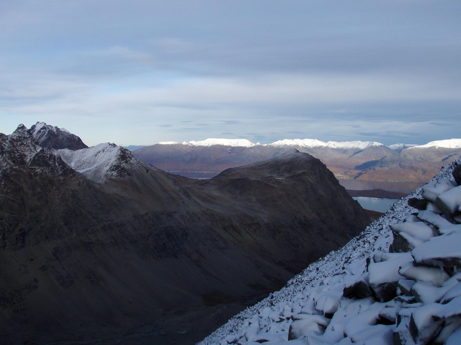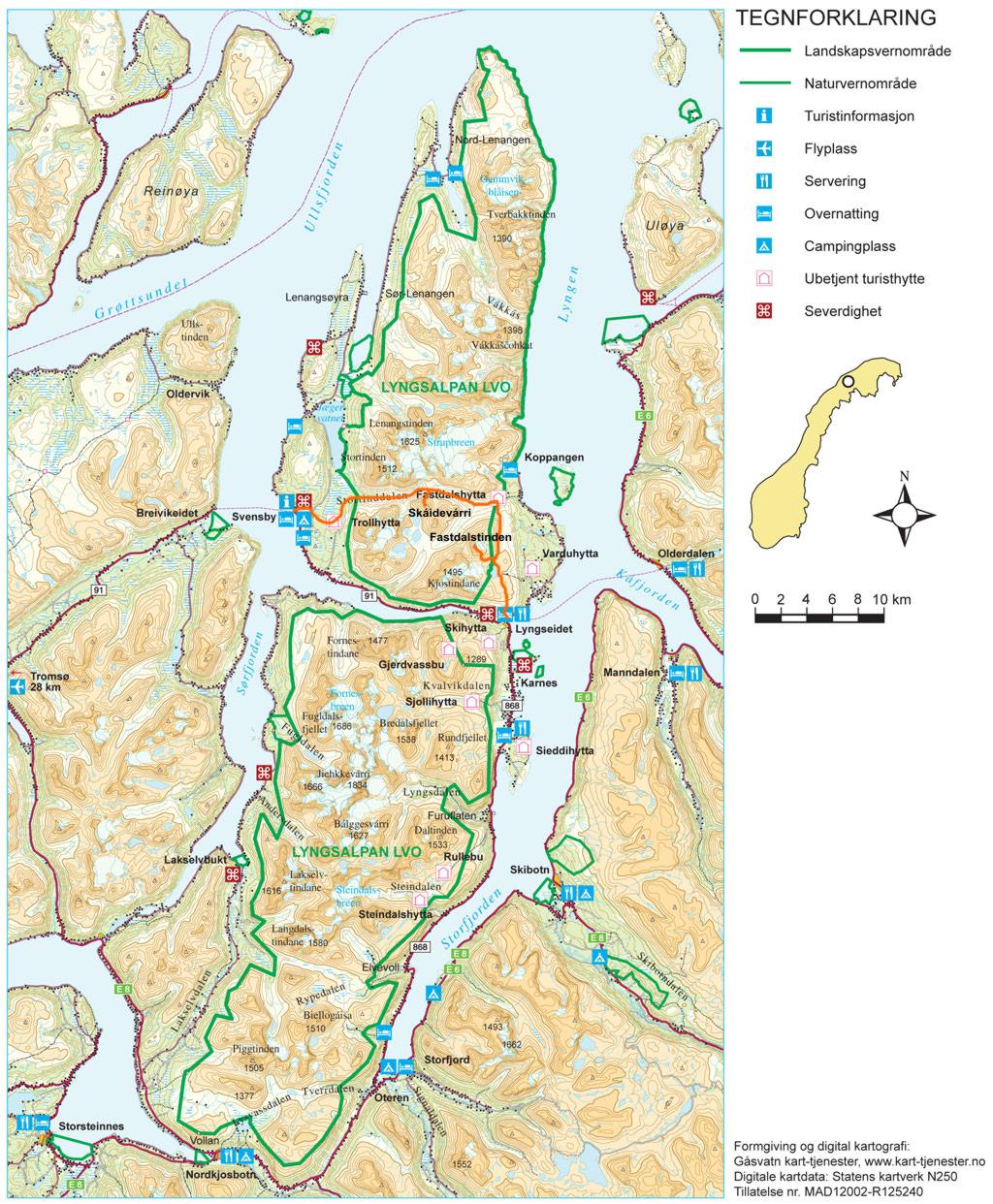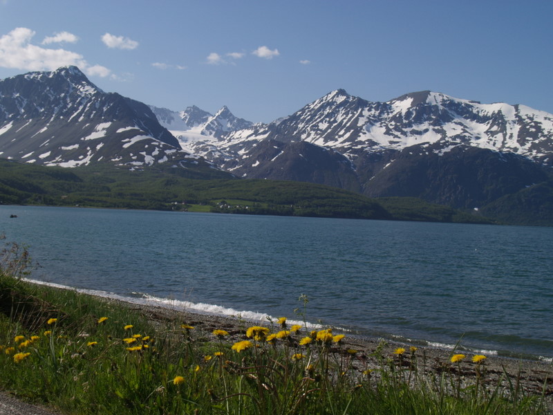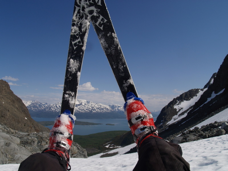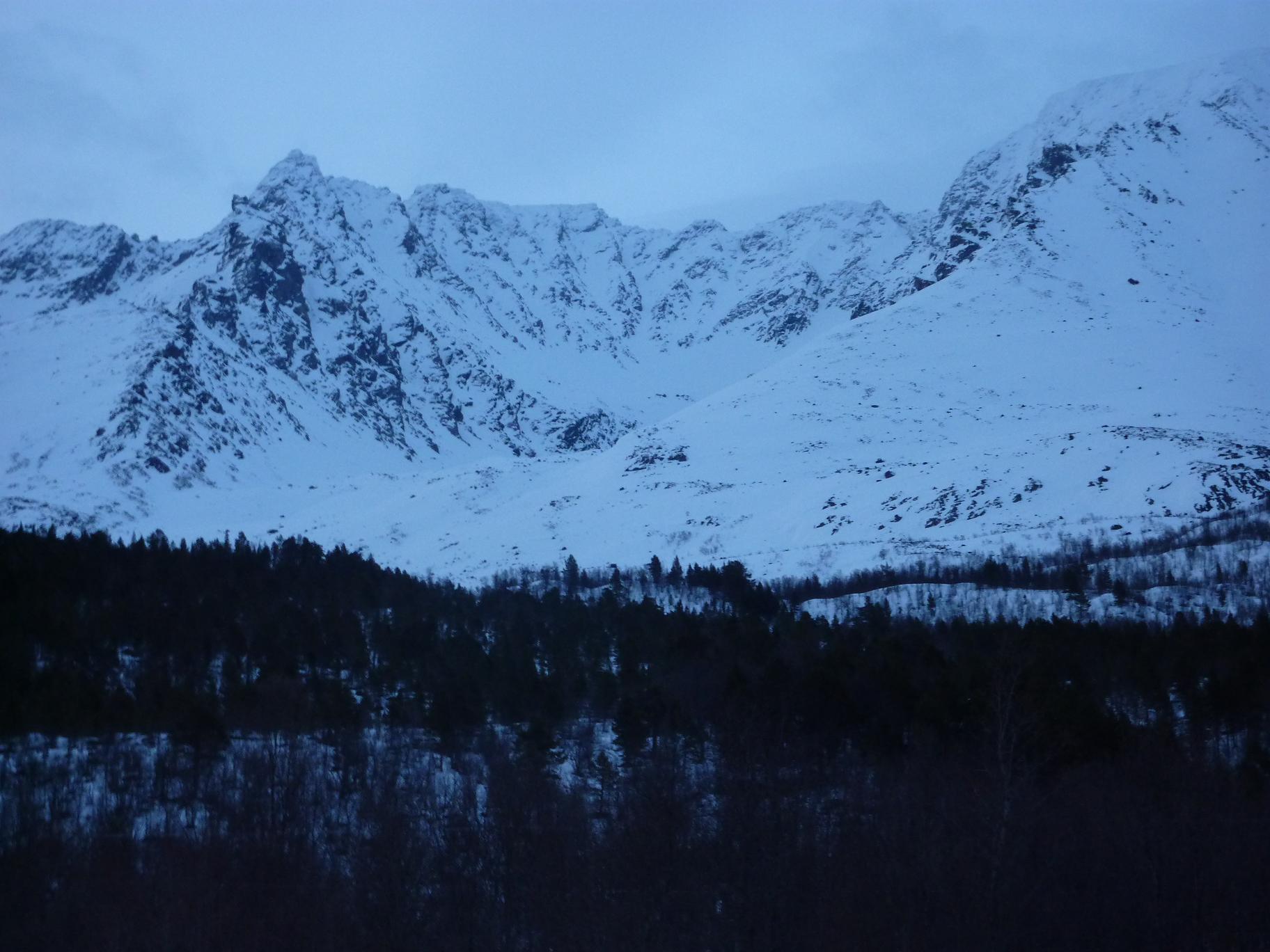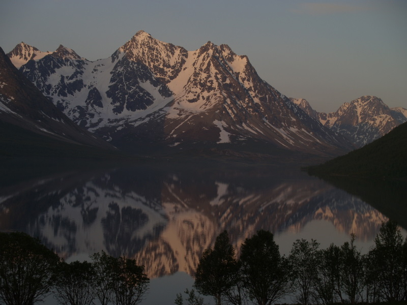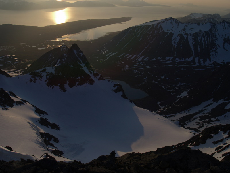 Jeg har bodd i Tromsø noen år nå, men jeg må innrømme at jeg har vært alt for lite i Lyngsalpene, eller Lyngen som det sies på kortversjonen. Jeg har hatt noen småturer både høst og vår, men en skikkelig fottur med flere overnattinger hadde jeg ikke hatt fram til nå. Lyngen forbindes jo med rette kanskje mest for bratte fjell og heftige skinedkjøringer, og ikke fullt så mye for fotturmulighetene. Men det finnes mange flotte fotturmuligheter der man kan bruke en hel helg eller mer. Mange åpne hytter finnes det også for de som foretrekker tak over hodet framfor telt. Liker man topper er jo toppturmulighetene tilnærmet ubegrensa i Lyngsalpene. Jeg vil tro mange av Jotunheim-ranglerne her inne på forumet hadde storkost seg i Lyngen (såfremt ikke 2000-metere er det eneste målet da)... Turen vi hadde denne helga gikk fra ferjekaia på Svensby, 1 time og 10 min busskjøring og ferjetur fra Tromsø. Etter en liten gåtur oppover lia fredag kvel slo vi opp telta våre ved Trollvatnet, rett under Isskardtindane. Lørdag våkna vi til skyfri himmel. Vi gikk innover Stortinddalen opp til skardet mot Russedalen. Øverst i skardet la vi fra oss sekkene og hadde planer om å komme oss opp på nordtoppen av Skáidevárri. Det var bratt og stort sett bare store steinblokker oppover fjellsida. Snøen lå på ca 800-900 meter, og isen gjorde det glatt. Bare tre av seks kom opp til eggen, de andre snudde før vi kom så langt. Eggen var bratt, isete og glatt, så vi ga opp å komme til toppen da det gjensto ca 20 høydemeter. Jeg vil tro at mange folk med mer tinderangling-erfaring enn meg kanskje hadde fortsatt det siste stykket, men det gjorde altså ikke vi. Utsikten var flott fra eggen også. Vel nede igjen gikk vi ned Russedalen og Fastdalen til Fastdalshytta, ei åpen hytte eid av et grendelag. Her tilbrakte vi kvelden og natta før vi la avgårde igjen på søndag. Søndag var været mer overskya men fortsatt greit. Skydekket var litt lavt og dekket toppen av de fleste fjella i området. Dette letta litt utover dagen. Vi fulgte fjellsida øst for Fastdalstinden sørover, et veldig lettgått terreng. Ved Rottenvikvatnet la vi fra oss sekkene og begynte stigningen på rundt 700 høydemeter opp mot Fastdalstinen (1275). Snøen lå her på rundt 1000 meter. Det var forholdsvis mye snø oppe på denne toppen, og jeg vil ikke tro det er så alt for lenge før den første toppturentusiasten vil kjøre noen svinger med skia nedover dette fjellet. Oppe på toppen fikk vi nokså bra utsikt selv om skydekket ennå ikke hadde letta fullt så mye som vi hadde håpa på. Turen videre ned til Lyngseidet fortsatte i lettgått terreng.