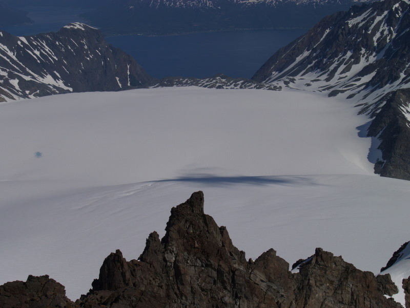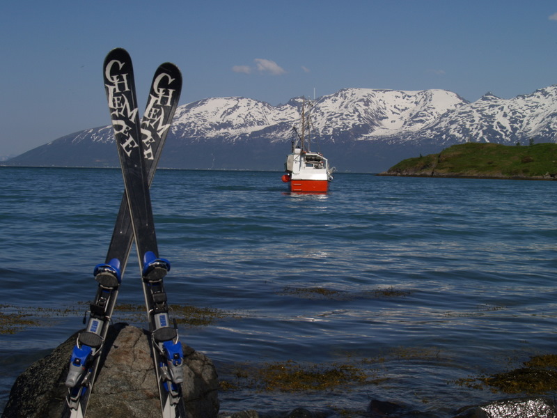 Endelig fikk jeg sett Lyngens imponerende østside fra båt. De to toppene var en navneløs topp mellom Austre og Vestre Vaggasblåisen på 1175 moh. Denne toppen er i Lyngenmålestokk "enkel", mens den andre toppen var Norde Vaggastinden på 1092 moh, denne toppen så på avstand vanskelig ut og det er neppe så alt for mange som har vært på denne. Fra Koppangen hadde vi bestilt oss båtskyss og båtturen langs Lyngens østside var fantastisk! Med det grønne vannet i Strupen etter brevannet fra Lyngens største isbree: Strupbreen og den vanvittige østveggen på Støvelen som stuper 800 moh rett ned i havet som to av høydepunktene. Etter ca 20 minutter ble vi satt på land i Vakkasnjarga, her er det neppe så alt for mye menneskelig kvalitet og de første ca 200 høydemeterne gikk i tett skog før det etterhvert flatet litt ut og vi kunne følge dyretråkk videre inn mot Austre Vaggasblåisen. Austre Vaggasblåisen viste seg å være en overraskende snill isbre, med bare en synlig sprekk, så vi krysset breen uten bruk av tau. Den siste biten opp mot skardet som skiller Austre og Vestre Vaggasblåisen hadde en ca 40 grader bratt snøbakke før vi var oppe mellom isbreene. Fra skardet var det en enkel spasertur i steinur mot toppen av denne navneløse toppen på 1175 moh. Fra toppen er det fantastisk utsik mot de fleste spisse tindene på den nordlige delen av Lyngenhalvøya. Fra topp nr 1 måtte vi gå ned til Austre Vaggasblåisen på ca 650 moh før stigningen startet igjen. Den bratte snøbakken egnet seg bra som akebakke med goretexbuksa mi. Opp mot skardet mellom Nordre og Store Vaggastinden var det en ca like bratt snøbakke før den siste biten gikk i usedvanlig løs stein/grus. I skardet ble klatreselene tatt på og vi startet på den luftige eggen på ca 350 meter og ca 165 høydemeter. Etter ca 100 meter møtte vi turens crux, der vi måtte ta i bruk tau noen høydemeter. Det skal sies at ingen av oss lider av noe særlig høydeskrekk , så det er vel enkelte steder andre også ville foretrukket bruk av tau... Etter at tauet ble tatt igjen var det grei klyving den siste biten mot toppen av Norde Vaggastinden, som til vår skuffelse hadde en liten varde. Sannsynligvis noe som er etter Engelske geologer på 70-tallet? Turen var på ca 11 kilometer og ca 1600 høydemeter. Vi brukte ca 7 timer på noe som må være tett mot årets tur. Flere bilder og turbeskrivelse http://kugo.no/2011/07/massiv-mellom-vaggasblaisene-1175-moh/