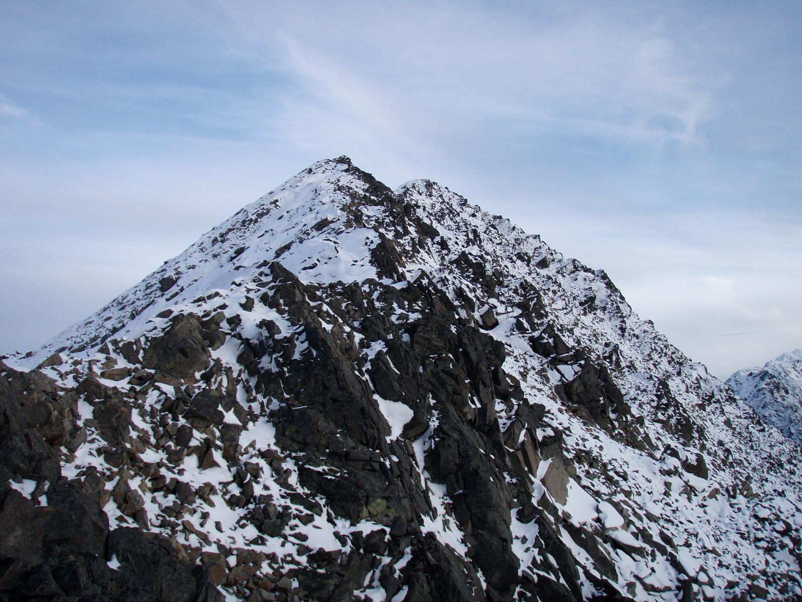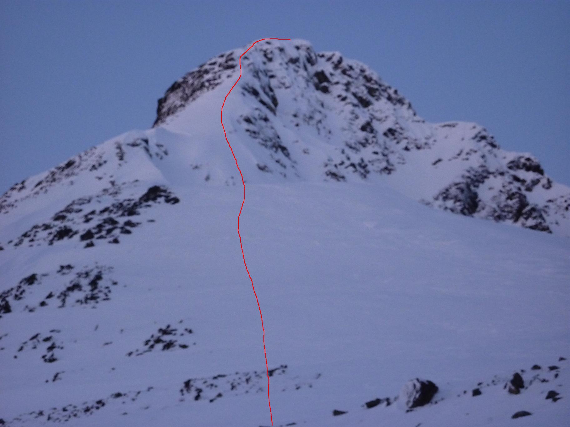 Piggtinden er kanskje fylkets mest majestetiske topp og samtidig en av de vanskligste toppene. Piggtinden ble førstegangsbesteget i 1920, og første vinterbestigningen var så sent som i 1971. Piggtinden er kanskje mest kjent for Petter Wessel Zappfe sin beretning om sine 4 forsøk på å nå Piggtinden i “Fire korstog til Piggtind” fra Barske Glæder. Vi gikk vestryggen hele veien til toppen. Startstedet mellom Fjellås og Heimdal i Lakselvdalen ligger en liten times kjøretur unna Tromsø, parkering finnes ved brua som går over Storelva. Den første kilometeren går etter god skogsvei inn mot noen reingjerder på venstresiden av Storelva, etter reingjerdene blir skogsveien gradevis sti de ca 4 kilometerne opp mot ryggen mot Piggtinden. Over noen myrer er det vanskelig å se stien, men der er den merket med vegstikker. Med såpass god sti som det er inn mot ryggen er det en effektiv anmarsj til Piggtinden. I starten av ryggen på ca 600 moh er den ganske bred og det er slitasje i terrenget man kan følge oppover, likevel er det en del småklyving i starten. Litt løs stein og grus må man nesten også regne med. De første par hundre høydemeterne er det en del gress og grus, men lengre opp er det stortsett bare stein og noen partier med bart berg, noe som gjør at man helst bør besøke Piggtinden i tørt vær, men Piggtinden er vel ikke akkuat noe man gjør i lavt skydekke og regn uansett…. Vestryggen var egentlig forholdsvis grei å gå opp til ca 1300 moh, litt klyving og noen partier på svaberg var de “eneste” utfordringene på turen til 1300 moh. Ryggen ble smalere hele veien, og spesielt nordsiden var luftig, men ryggen var såpass bred at vi konkluderte med at det hadde vært greit å gått så langt. Fra den “siste” fortoppen ble det en noen luftige partier på eggen der det var langt og bratt ned både på nord og sørsiden, og det var et såpass stort hakk i eggen at vi tok en rapell på ca 2.5 meter ned på eggen igjen, der var det en bolt i fjellet som vi brukte som feste i tillegg til ei kile. Akkurat på det punktet var eggen veldig luftig, så det fristet ikke noe særlig å klatre ned…. Videre oppover måtte vi ut av eggen en gang for å traversere oss rundt ett luftig parti, ellers fulgte vi ryggen slavisk opp mot skardet mellom toppen på >1440 og hovedtoppen der klatringen startet. Før vi kunne starte klatringen måtte vi vente ut tåka, så det ble en god pause og noen besøk på yr.no for å sjekke siste nytt på værfronten. Når tåka endelig lettet fikk vi en liten “wow-opplevelse” da den gjennstående biten til toppen så bratt ut… Vi begynte å sjekk noen forskjellige altarnativer for klatringen videre opp, 3 altarnativer ble fort til 1 og vi gikk for renna i midten. Noe som nok er normalveien da vi litt lengre opp fant hugde spor i fjellet. Vi kunne klyve opp ca 10 meter fra renna som blir brukt ved vinterbesøk fra Piggtindskardet. Der laget vi en standplass før Bjørn klatret videre opp. Klatringen som kunne vært unnagjort med ett 30 meterstau med riktig rutevalg er grad 4-5, vi startet på venstresiden av renna og måtte krysse renna på slutten av taulengden. Renna var helt fri for noen form for tak, så der hadde noen hyggelige klatrere med stor hammer hugd spor i fjellet. Etter vi kom på høyresiden av renna var det bare klyving videre i renna til toppen. Renna var overfylt av rapellfester i forskjellige varrianter etter mange besøk tidligere. Topplatået var i overkant av 100 meter langt og relativt flatt, østtoppen som skal være tilgjengelig uten klatring fra Piggtindskardet ble ikke besøkt da det ikke fristet noe særlig å klatre ned fra vesttoppen på den smale eggen som var snødekt i særdeles bratt terreng mot nordog en skavel som hang utfor kanten på sørsiden…. På nedturen var 30 meter tau litt i underkant, så vi måtte dele rapellen inn i to etapper, første etappen gikk ut mot skardet på nordveggen der vi fant en hylle som vi kunne lage ny standplass fra. Første rapellen var fra en stor stein med ca 10 slynger som lå igjen, mens andre rapellen var i en bolt og ei kile. Rapell nr2 førte oss ned i skardet mellom >1440 og Piggtinden med ca 1,5 meters margin… Resten av returen fulgte samme veien som vi gikk opp langs eggen. På slutten var det noen slitne bein etter 14 timer på tur.... Flere bilder: http://kugo.no/2010/08/piggtinden-1505-moh-3/