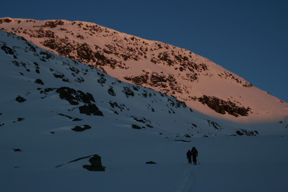 Sist helgs snøfall i høyere strøk skapte alvorlig kribling i skifoten Det gjaldt og få "putta" inn en tur før nasjonaldagen, som jo er booka når en har familie. Etter studier av værprognoser og øvrig "timeplan" falt valget på en morgentur, dagen før dagen. Vårnatt under åpen himmel Mandag kveld satte vi derfor kursen mot Eresfjord og Kanndalen. En og annen byge sveipa over fjordstrøka. Rett før setra i Kanndalen støtte vi på ei litt for stor snøfonn, men vi var nå uansett nesten ved vegs ende. Soveposene blei rulla ut på vegskulderen, og til snøbygenes siste krampetrekninger falt vi til ro. Da jeg våkna ut på natta var det til klar himmel, fuglekvitter og elvesus. Våren er ei flott tid å ligge ute på. Studerte stjernene og tenkte på morgenens tur. Nye jaktmarker Vi hadde tenkt å utforske Skjorta, (som er vanligst å bestige fra vest og nordvest), sin østside. Terrenget her er akkurat passe nordvendt til snøen får være i fred, og akkurat passe østvendt til at vi ville få rikelig med morgensol. Terrenget oppover mot Skjorta fra denne sida ser litt ugjestmildt ut, men kartet forteller at det trolig finnes gjemte skatter her...... Litt før 04.30 var vi klar til avmarsj. Siste dagers snøfall hadde smelta og frosset og skapte et perfekt snødekke inntil vi traff gammelsnøen litt lenger inne. Turens største utfordring var å ta seg tørrskodd over Dokkelva. Opp i høyden Straks vi forlot elva begynte skaren å svikte Temperaturen hadde vært litt for høy, men ikke høy nok dagen før. Dette avtok gradvis et stykke lenger opp og på rundt 950 m tråkka vi plutselig i 20-25 cm laussnø, samtidig som de første solstrålene nådde oss. På turen videre opp til skaret under Skjortas topp satt superlativene løst... Det sitra i kroppen med tanke på nedkjøringa. Morgenstund har.... Oppe ved skaret tok vi en rast i solsida, mens vi tenkte på dem som var på veg til jobb, spiste frokost eller krangla med vekkeklokka.... De siste par hundre høydemetrene tok vi i Skjortas vestside. Her var det mye stein under snøen, og en kald trekk, full vinter. I 7-tida nådde vi toppen. Flott utsikt til alle retninger. Vi konstaterte at et par andre skiklassikere gjerne kunne fått besøk denne dagen... "Nedturen" For å unngå stein i øverste partiet drog vi ned sørvestflanken fra toppen. Prima snø her også. Deretter runda vi rundt til skaret nord for toppen igjen. Øverst i østsida ligger et par breer som danner et fantastisk skiterreng. Hvilken vei skulle vi velge ? Helst skulle vi kjørt alle steder på engang Vi fant det nydeligste føre ned til snaue 1000 m, og sklei raskt videre ned mot setra. En "ny" topp Etter 5 timer var vi igjen nede ved bilen, og en ny arbeidsdag var i emning, litt roligere i kroppen, litt trøttere en vanlig, men med en nye kremtur i minneboka. Alle tre har vært på Skjorta mange ganger, men ved å velge ei ny rute til et uvanlig tidspunkt , var det akkurat som å gå på en ny topp....