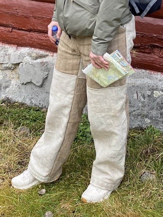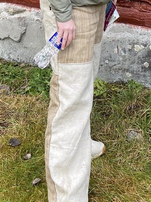 Tenkte jeg skulle en tråd etter oppfordring av @ost, men også mtp at jeg har lett etter lignende informasjon og ikke funnet det. Jeg anser meg selv som nybegynner innen både søm og tur, men har lenge hatt interesse for klær, historie og teknologi. Selv om plast har bidratt enormt til å både få ned kostnadene og vekten på turutstyr og bekledning, er det noen baksider. Man har det åpenbare; påvirkning på miljøet. (Og før folk kommer og kverulerer, jeg er klar over at produksjon av plast ikke er det eneste som forurenser, slik verden er i dag vil alt vi konsumerer ha et visst klimaavtrykk.) I tillegg kan man snakke om komfort, uansett hva slags teknologi man har i klær med plast vil naturmaterialer alltid puste bedre. Se gjerne MyLifeOutdoors sin video om gore-tex (ignorer clickbait-tittelen): I tillegg er plast mindre holdbart i den forstand at naturmaterialer er enklere å fikse og vi har vel alle opplevd å ha treningsklær vi må kaste fordi vi ikke får svettelukten ut av dem. Så til mitt første prosjekt: turbukser/«skallbukser». Beklager dårlige bilder, skal få lastet opp bedre når jeg får mulighet. Mønsteret er modifisert puff and pencil versa pants kjøpt på selfmade. Hovedstoffet (det mørke stoffet) er neslestoff kjøpt på Oslo Middelalderfestival for noen år siden. Buksen er flatlined med et ull/silkestoff (70/30) kjøpt på Rainbow Tekstil. Det lysere stoffet er forsterkningspaneler av den tykkeste linen de selger på Rainbow Tekstil. Tråden brukt er ubleket Gütermann sytråd i silke, med unntak av noe bruk av lintråd. Begge kjøpt på Rainbow Tekstil. Buksa har lukning i begge sider med hempe og knapper i metall fra henholdsvis Selfmade og Sømsenteret. Hensikten her er å bruke materialets naturlige egenskaper til å oppnå det vi oppnår med plaststoff og impregnering. (Jeg er kun lekmann, ta høyde for at noe feilinformasjon kan forekomme.) Ref det jeg har lært meg om disse stoffene er buksa vannavstøtende, temperaturregulerende, den er resistent mot mugg og bakterier, den er slitesterk og enkel å lappe. Jeg forsøker også, så langt det er mulig, å bruke ublekede/ufargede stoffer. Fra bruk vet jeg at den er sykt komfortabel. Jeg ville ha en vid bukse, så jeg har mulighet til å bruke den med stillongs på vinterstid. Den er tung, ja. Det er del av grunnen til at jeg gikk bort fra snøring i livet. Siden den sitter godt inntil i livet kjennes den ikke tung på. Vasking er også komplisert, men vi mennesker vasker klærne våre for mye når de ofte kun trenger en runde i fryseren og/eller litt «spot cleaning». Jeg holder på med en slags anorakk nå, så blir mitt neste prosjekt sannsynligvis undertøy eller innerlag.