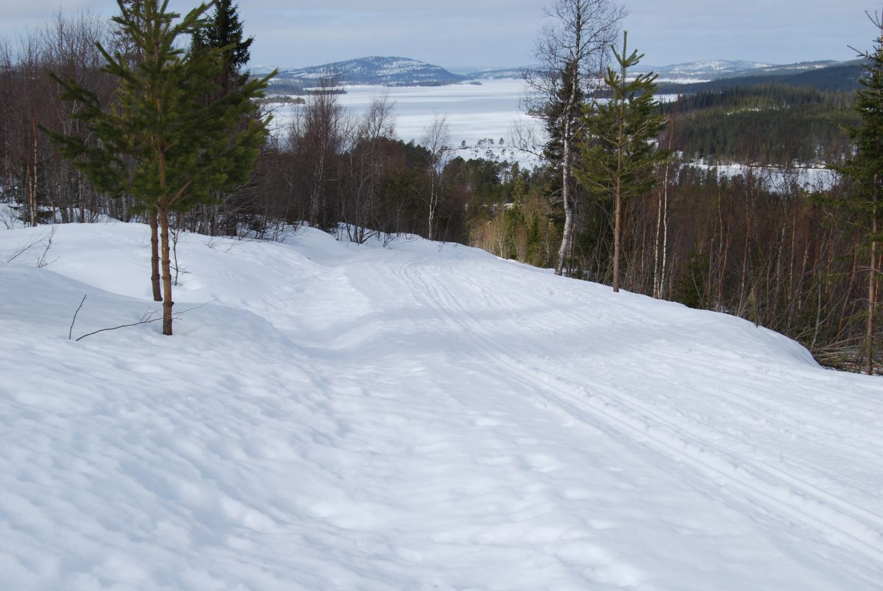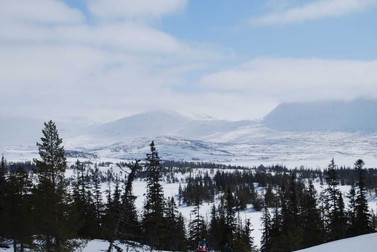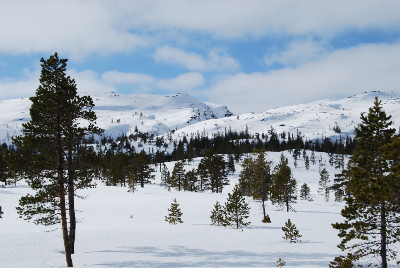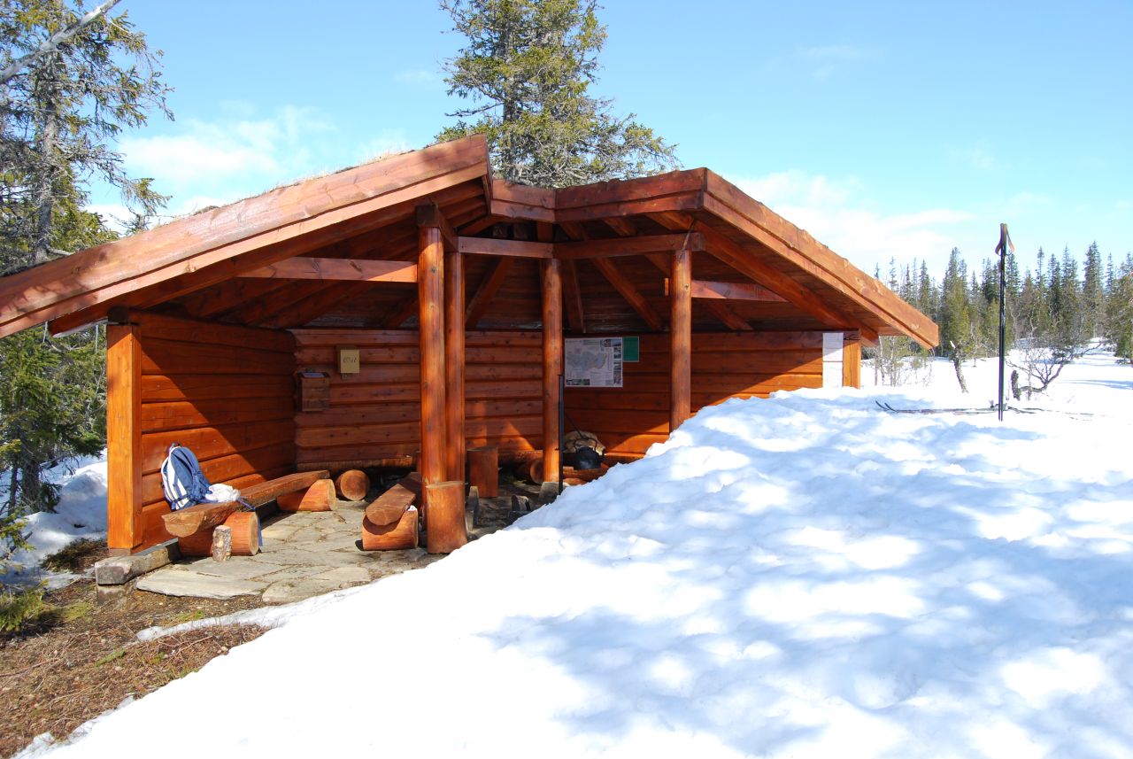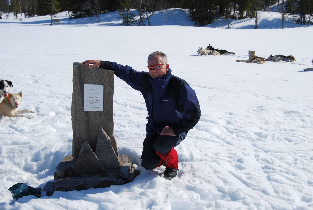 Planen var klar; I dag skulle turen gå til norges geografiske midtpunkt som ligger i Steinkjer kommune ikke langt fra Skjækervatnet og Skjækerfjella. Men været var langt fra oppløftende da jeg sto opp grytidlig i dag morges. Disen hang tung over Bymarka i Trondheim og min sedvanlige morgentitt opp mot Storheia og Gråkallen var negativ, ikke mulig å se disse toppene. Men Yr var standhaftig og meldte blå himmel over midtpunktet på formiddagen. Valget ble da; Skulle jeg dra dit, eller til Snota hvor meldingen også var god? Etter som det er mer sannsynlig at føret varer lenge ennå på Snota, dro jeg innover i retning Steinkjer. Men vidusviskerne på bilen var i aktivitet til etter Stjørdal. Og instillingen var klar: "Det er ingen skam å snu." Det ble etter hvert noen gløtt av blå himmel, og turen innover Ogndalen fra Steinkjer gikk greit, lite trafikk, og veien var forbausende god. Jeg tok en liten pause for litt fotgrafering da jeg så en reinflokk som spasserte over et jorde. Det siste stykket var det grusvei og teleløsningen hadde tatt tak, men det var greit å komme frem. Det er en stor fin betalingsparkering på Litjfjordhalla ved Lustadvatnet og bilen ble plassert der. På parkeringsplassen kom jeg i prat med en fra Snåsa som drev med guidede turer med hundespann m.m. han var en trivelig kar, og ga meg mange tips for fremtidige turer i området. Han hadde tenkt seg lenger enn jeg skulle og forsvant oppover bakkene før jeg var helt klar. Starten var jevnt oppover, men da det flatet ut var det et flott terreng for skigåing. Det er tydeligvis stor trafikk med snøscootere innover den strekningen jeg gikk og spredningen var slik at jeg av og til følte det som å gå på en motorvei. På hele turen møtte jeg bare en scooter, og med både mange hytter og reindrift i området er vel ikke det så ille. Som sagt; Terrenget er lettgått etter de første oppoverbakkene, og før jeg visste ordet av det var jeg ved et kjempeflott gapahuk som er satt opp 500 meter før midtpunktet. Nistepakka ble inntatt i solskinnet i gapahuken, og hadde det vært kaldere hadde jeg kanskje tent opp et bål av ved som var tilgjengelig på stedet. Kjempeflott tiltak av skogeiere og kommunen?. De siste metrene frem til punktet gikk som en lek etter mat og drikke og vel framme traff jeg en gjeng som var på tur med trekkhundene sine. Trivelige folk og en hyggelig prat der midt ute i myra. Og etter prat og fotografering gikk turen tilbake til bilen. Skulle gjerne tatt en tur oppover i lia for å få bedre utsyn over Skjækerfjella, men som vanlig var det noe som presset på der heime. Har etter hvert kommet til at det er bedre men en litt stressete tur enn ingen tur