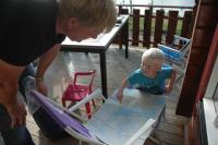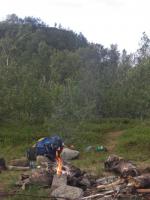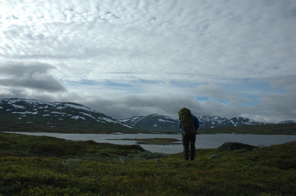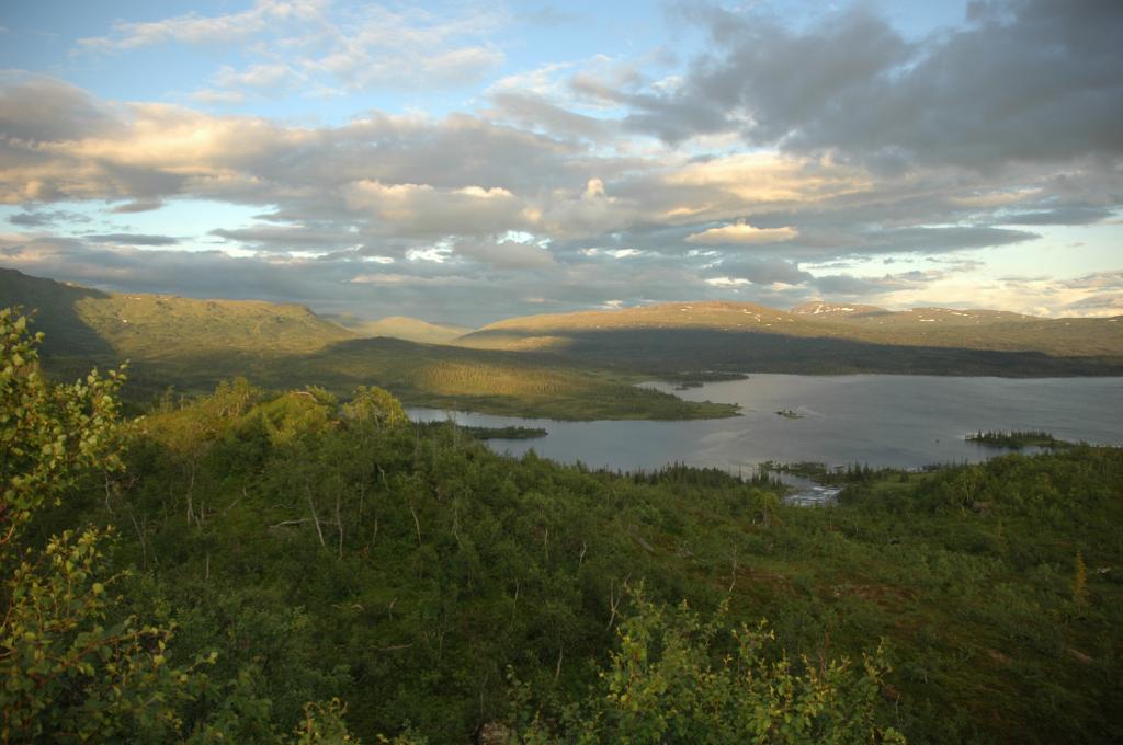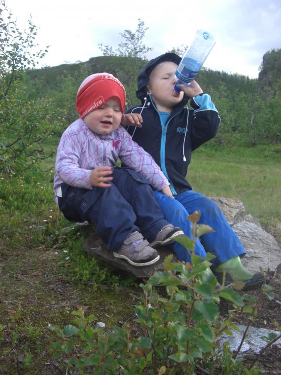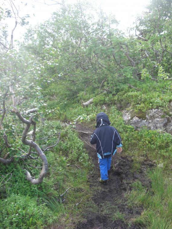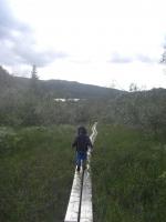 Vi har hytte ved Børgefjell og har veldig mye tid i området ved Simskaret - altså vestsiden av nasjonalparken. Vi bruker også området veldig mye - også steder som er villmarkspreget utenfor NP - lett tilgjengelig via veier og sånn. Ungene har 11 netter i telt i år, og stortrives med teltlivet. Allikevel har det sittet litt langt inne dette med å gå "langt" med de. Hvilke utfordringer kan man ikke møte når man er ute med så små unger? Eldstegutten er 3 og jenta er 2 - og spesielt dette med myggen har vært et tema for oss - og det skulle også vise seg at det skulle bli hovedutfordringen denne turen. Jeg har selv hatt ymse planer om langtur i Børgefjell, og har aldri startet ved Namsvatnet. Kunne det være en mulighet å starte min "lange" fjelltur, med alle sammen på slep? Etter noe spekulering, ble det til at vi skulle ta båten fra Namsvatnet i lag alle sammen. Der står en åpen hytte - Virmahytta, som vi kunne benytte om myggen eller forholdene ble for dårlig. Vi tar båten utpå ettermiddagen - etter at skyssmannen hadde vært inne der med en del turfolk og fiskere som også skulle ut i villmarken. Selv om det er en frisk nordlig vind på Namvatnet, er det ganske rolig nede i skogen ved Gapahuken og ved hytta. Jeg bestemmer meg for å finne ut hvordan stien er oppover - er det gangbart for en treåring? 2 åringen skal uansett sitter i sela. Selv om hun absolutt ønsker å gå, er det for mye hun er nysgjerrig på underveis til at hun kan få gå særlig mye uansett. Jeg finner fort ut at stien er god å gå for han - delvis klopper og lite myr, og går kjapt ned igjen til hytta. I mens har ungene utforsket hytta, klatrert i det som kan klatres i, og fått ut litt energi - samt fått i seg middag Så da blir det bare å hive innpå middagen, før vi legger avgårde oppover lia. ca 1 km å gå - 100 høydemetre Ikke mer - til første vannet. Jeg bærer uhorvelig tungt selv, og må delvis gå 2 turer. Både en stor 135 liters North face bag samt hennes og min ryggsekk med diverse for som man trenger på en slik tur. Gutten langer godt avgårde og her går han inn i Nasjonalparken fra sør for første gang Klopper gjør det lett langs de mest myrlendte stedene.. Ikke lenge etter ankomst får vi fyrt opp bålet. Vinden begynner å roe seg og myggen er påtrengende - selv om det er kjølig. Vi legger gutten i teltet og det blir rimelig fort stille. Erfaringsmessig er jenta den som er vanskeligst å roe ned, men vi legger henne inn i teltet så fort han har roet seg, og det tar ikke så lang tid før det er stille hos henne også. Jeg tar meg en tur i nærområdet for å ta bilder på kveldingen. (Dette stedet blir ikke så langt i fra Reiret og kristi Krybbe) Det blåser en del om natta, men allikevel er myggen fremtredende. Teltet er heldigvis tett, og det kommer ikke en mygg inn der, men allikevel er myggen er plage på morningen. Ikke for meg - gamlefar er innsmurt med alskens DDT.. Jenta vår blir myggspist både her og der, og bøffen vil hun ikke ha på hodet heller. Myggstikkene ser allikevel ikke ut til å plage henne nevneverdig, men hun blir helt rød i hodebunnen og i ansiktet av stikkene. De myggene vi knekker i mot telttaket er fulle av blod.. de lever gode dager ja.. Selv om det er mye nordavind er det ikke annet å gjøre enn for de å returnere tilbake der de kom i fra. Vi pakker alt ned i sekkene igjen og ned til båten igjen med alt - unntatt det jeg skal bruke på min ferd i gjennom NP de neste dagene. Jeg slipper selvsagt å ta med teltet - det bomberommet (North face VE-25) skal jeg bære med meg resten av uka. Mye styr for en så liten tur. Mye pakking, mye planlegging. Men jeg tror at ved å gjøre slike ting kanskje skaper et grunnlag for turlyst senere. Ikke den store turrapporten, men jeg fikk inntrykk av at det ikke var så helt vanlig med så småe unger der inne og at det vi gjorde kanskje var litt uvanlig. Jeg har litt troa på dette med en back-up plan om ting skjærer seg - altså en hytta e.l. når ungene er så små som dette.. Så trasker jeg alene i gjennom Nasjonalparken - til hytta vår, men det er en annen historie.