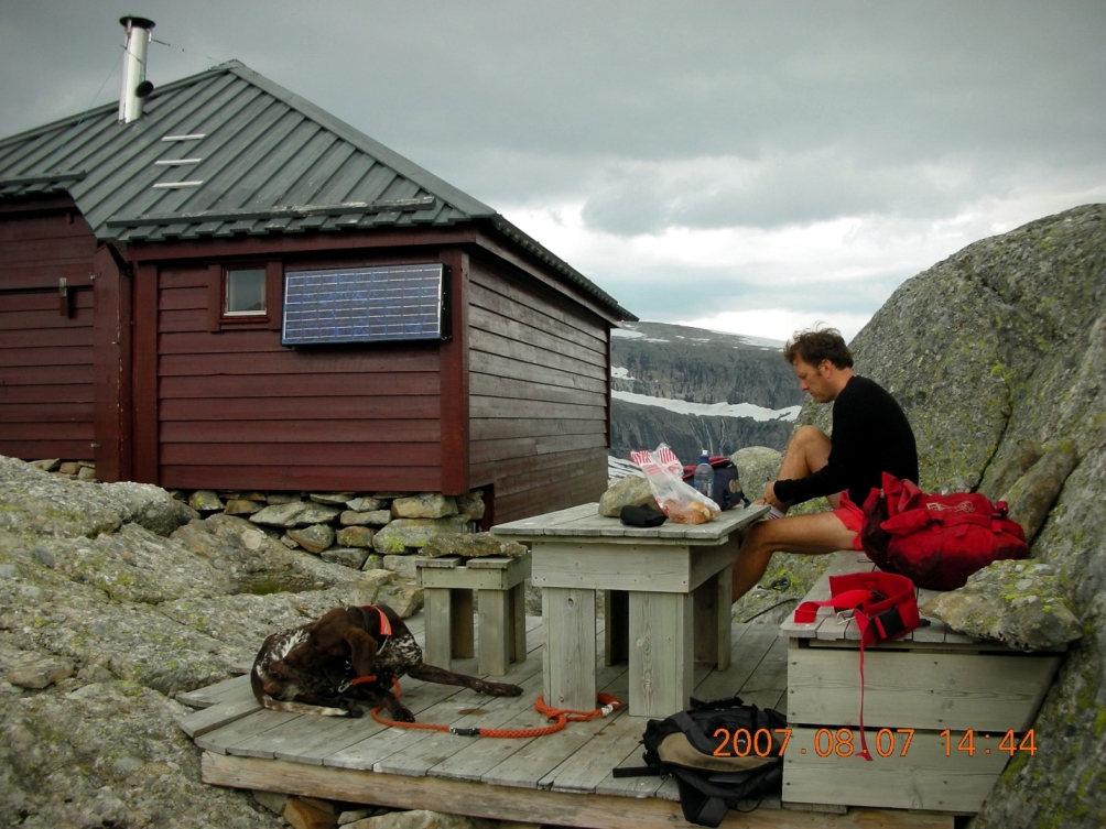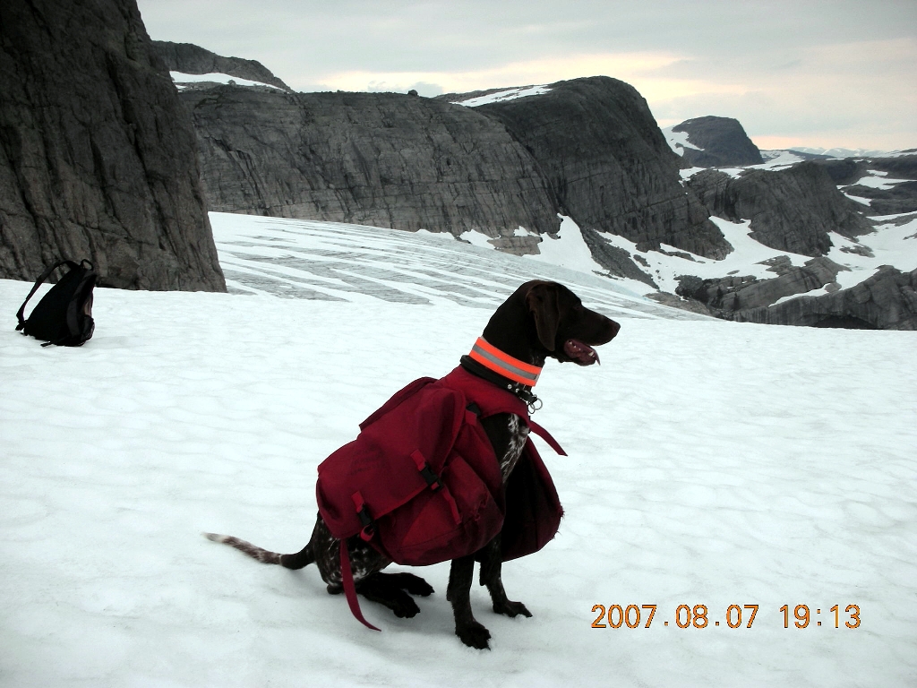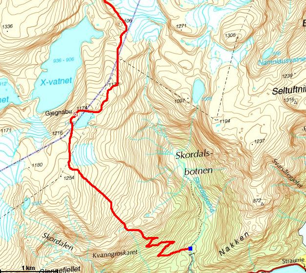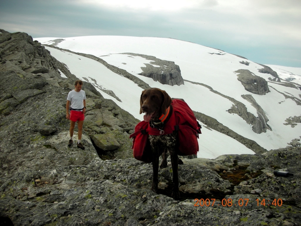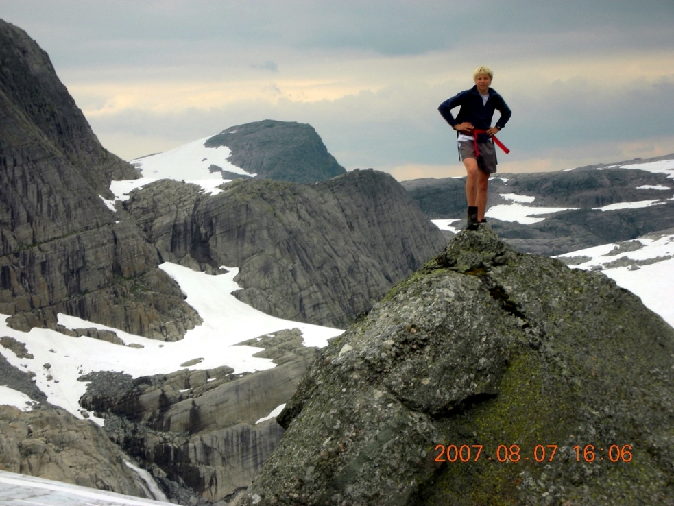 Den 8. august 2007 kjørte jeg og onkelen min med bikkja fra hytta vår i Stryn til Hope som ligger rett vest for Hyen i Nordfjord. Vi hadde etter to års planlegging bestemt oss for å bestige den toppen vi ser i det fjerne fra Strynefjella, nemlig Gjegnen/Blånibba som ligger i kommuneskillet mellom Bremanger kommune. Det er den høyeste og mest majestetiske av fjellene i Ytre Nordfjord. Og området er helt vilt med vann som heter X, Y og Z-vatnet!! Dette er en topp som flere bør prøve seg på, og jeg ønsker å lage en rapport fra turen slik at folk kanskje vil finne veien fram;) Det finnes to hovedruter fra Hope, en via Skordalen om Skordalsbotnen. Den er ofte utsatt for skredfare, og om sommeren kan ruta være vanskelig å finne og man kan fort havne ut på svaene. Vi prøvde oss på en ganske ny rute som går opp den vestlige skråningen av Skordalen. Parkerte bilen ved en tømmerplass langs Skordalselva, det er egentlig privat vei opp hit og vi klarte så vidt å komme oss opp med Yarisen. Det er en ganske ekkel skogsbilvei opp dit med bil, men alternativet må vel være å parkere ved Hopsvatnet et sted. Med oss i sekken hadde vi godt med niste, og ”Forsvarets nødproviantpakke” som jeg enda ikke har fått brukt. Den hadde vi med oss om vi skulle overnatte på Gjegnabu, hvis turen ble for lang. Hadde ikke tenkt at det skulle bli overnatting, og bikkja hadde vi ikke mat til. Vi la i vei opp en godt synlig skogsbilvei, og når vi kom litt oppe i bakkene så vi en annen tømreplass som det går an å kjøre opp til, men ikke med vår bil. Etter noen høydemetre til, og like etter den øverste svingen ligger det en stor stein på venstre side som det vokser trær på. På høyre side ligger to steiner og en rødmerket pinne. Rett over den går det en liten bratt sti rett opp i den tette bjørkeskogen. Denne fulgte vi helt til terrenget begynte å åpne seg og vi møtte på en bekk som vi fylte vannflaskene i. Lenger oppover var det vanskelig å tyde hvor folk hadde gått, og vi møtte på noen sauer (Obs! for de som har hunder). Terrenget gikk over til mer sva og store snøfonner, og vi gikk egentlig på måfå oppover mot pkt. 1254. Det viste seg å være bedre å følge mer mot høyre (slik som streken, fulgte den ned). Veien vi fulgte opp ble bare bratte snøfonner og glatte sva Anbefaler å gå mot høyre og følge en morenerygg som er bar, feilen vi gjorde var å forlate stien for tidlig (som også er vanskelig å se etter hvert). Klarte uansett å karre oss opp på pkt. 1254. Her var det storslagen utsikt mot Gråfjellbreen og Gjegnalundsbreen! Gikk i vilt terreng i retning Gjegnabu, det var litt vanskelig for bikkja (med kløv) å passere små hammere og kampesteiner. Før vi ankom Gjegnabu fulgte vi en snøfonn bort til hytta, og vannet var islagt. Gjegnabu er plassert helt vilt, på kanten av en skråning ned i X-vatnet og er festet med stålvaiere. Tok en rast, hytta var åpen og man kan kalle det en koselig hytte. Det er Flora Turlag som eier den, og de har gjort en god dugnadsjobb med å bære ved og varer opp (kanskje det er helikopter som ble brukt). Tanken ble mer og mer aktuell ved å ta en overnatting på hytta. Veien videre gikk under og til høyre rundt toppen nord for 1147 vannet. Fulgte terrenget i retning 1106 toppen ved brefoten. Det var ganske plundrete å ta seg fram, man måtte improvisere rutene over småtoppene selv. Fra punkt 1106 bestemte vi oss for å følge den midterste hylla ovenfor fossefallene. I starten ville vi ta ruta som gikk nesten ned til X-vatnet, men det var vi glad for at vi slapp. Fra Gjegnabu så vår rute verre ut enn den var, i grunn en veldig lett steinur, og man kan også følge snøen. Deretter fulgte vi snøen opp mot toppryggen til varden! Møtte på noen folk som hadde gått fra Mettenes og opp, men de hadde båt. Og deres rute krevde breutstyr for å krysse Gjegnalundsbreen. Det hadde dessverre begynt å sky seg til vi kom opp, og vi fikk ikke øye på havet jeg har hørt en kan se derfra. Men vi så langt nok, til gamle bravader som Snønipa, Slogen og Førdeområdene. Der og da ble det bestemt at vi skulle ta en natt på Gjegnabu. Vi tok en tur nedom stupet mot Bjørndalsvatnet (1100 meter nesten rett ned!). Her er det en utstikker i fjellet som kalles Galleriet. Virkelig flott utsikt og natur, vi måtte passet på stupet for det var løse fjellsteiner vi sto på. Gikk nesten samme rute tilbake til hytta, alternativet tilbake var ned Skordalsbotnen. Den ruta kan man lese om i boka Opptur – 267 fotturar i Sogn og Fjordane av Anne Rudsengen, der står min rute også godt beskrevet. Skrenten ned fra pkt. 1170 tror jeg det var, hadde bikkja mi problemer å finne riktig rute ned. En må passe på selv for å ikke dette ned 10-15 meter! Vel framme ved hytta ryddet vi oss til. Redde sengene og åpnet nødprovianten, der var det pannekakemiks, rosiner, buljong, sjokolade, real turmat og mye mer. Jeg tror aldri buljong har smakt bedre før. Det var fint at hytta hadde propanapparat der Når vi var nokså mette og lyttet på nattønsket på radioen, så vi at noen hadde lagt fra seg litt nødmat under benken. Vi tok en pannekakemiks og hermetisk pære (la dette også inn på giroen, selv om dette er en ubetjent hytte). Doen var bygd veldig fint til i en steinrøys 20 meter fra hytta. Og det var en stor seng med plass til 10 stykker i. Vi sov veldig tungt og godt denne natta. Neste dag var været dårligere. Vi kunne ikke se toppen eller Ålfotbreen ut av vinduet lenger (forresten svært kule vinduer). Det var tåke og vi kunne se ca. 150 meter foran oss, tåka lå opp til 700 moh. Nå var GPSen svært god å ha, med innlagt kart, i tillegg hadde jeg boka Opptur med en god beskrivelse. Vi var bekymret for returen da vi tok feil opp, i klar sikt! Vi spurte oss selv hvor vi ville gått uten GPS, det hadde blitt i retning Gråfjellet, og vi hadde ikke kart og kompass . Nedturen i tåke, ble overraskende mer vellykket enn oppturen. J