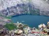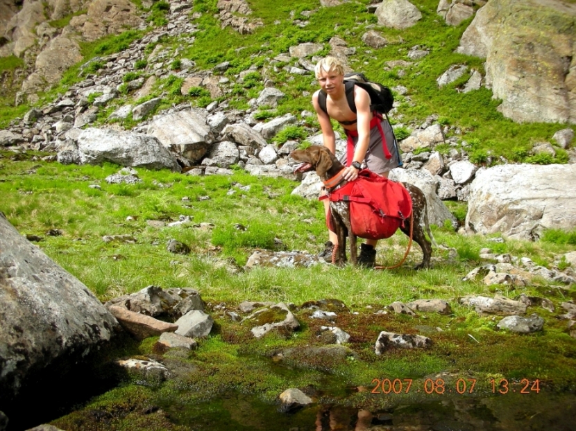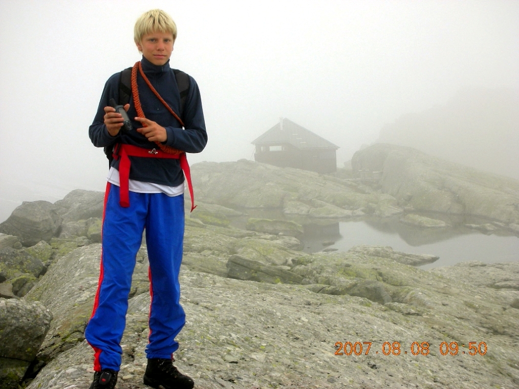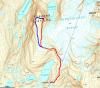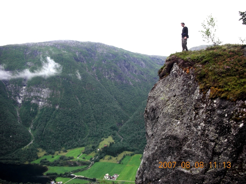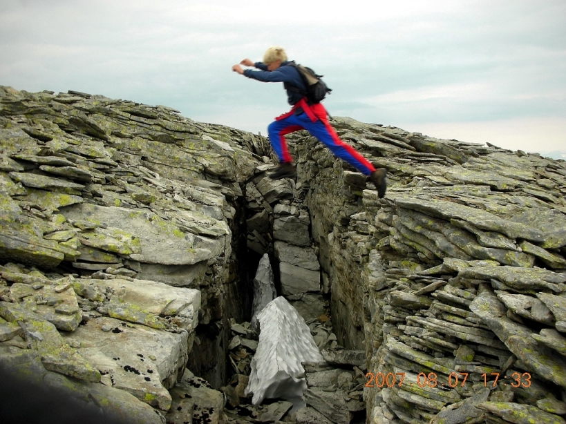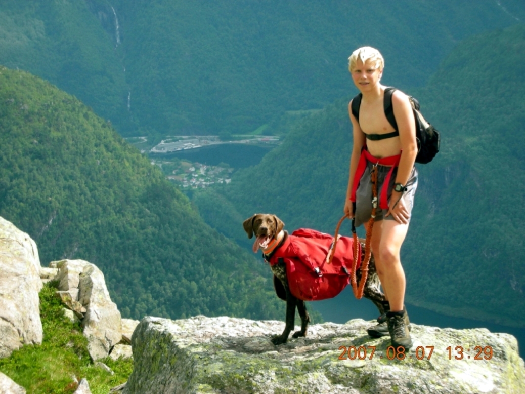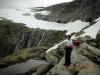 Den 8. august 2007 kjørte jeg og onkelen min med bikkja fra hytta vår i Stryn til Hope som ligger rett vest for Hyen i Nordfjord. Vi hadde etter to års planlegging bestemt oss for å bestige den toppen vi ser i det fjerne fra Strynefjella, nemlig Gjegnen/Blånibba som ligger i kommuneskillet mellom Bremanger kommune. Det er den høyeste og mest majestetiske av fjellene i Ytre Nordfjord. Og området er helt vilt med vann som heter X, Y og Z-vatnet!! Dette er en topp som flere bør prøve seg på, og jeg ønsker å lage en rapport fra turen slik at folk kanskje vil finne veien fram;) Det finnes to hovedruter fra Hope, en via Skordalen om Skordalsbotnen. Den er ofte utsatt for skredfare, og om sommeren kan ruta være vanskelig å finne og man kan fort havne ut på svaene. Vi prøvde oss på en ganske ny rute som går opp den vestlige skråningen av Skordalen. Parkerte bilen ved en tømmerplass langs Skordalselva, det er egentlig privat vei opp hit og vi klarte så vidt å komme oss opp med Yarisen. Det er en ganske ekkel skogsbilvei opp dit med bil, men alternativet må vel være å parkere ved Hopsvatnet et sted. Med oss i sekken hadde vi godt med niste, og ”Forsvarets nødproviantpakke” som jeg enda ikke har fått brukt. Den hadde vi med oss om vi skulle overnatte på Gjegnabu, hvis turen ble for lang. Hadde ikke tenkt at det skulle bli overnatting, og bikkja hadde vi ikke mat til. Vi la i vei opp en godt synlig skogsbilvei, og når vi kom litt oppe i bakkene så vi en annen tømreplass som det går an å kjøre opp til, men ikke med vår bil. Etter noen høydemetre til, og like etter den øverste svingen ligger det en stor stein på venstre side som det vokser trær på. På høyre side ligger to steiner og en rødmerket pinne. Rett over den går det en liten bratt sti rett opp i den tette bjørkeskogen. Denne fulgte vi helt til terrenget begynte å åpne seg og vi møtte på en bekk som vi fylte vannflaskene i. Lenger oppover var det vanskelig å tyde hvor folk hadde gått, og vi møtte på noen sauer (Obs! for de som har hunder). Terrenget gikk over til mer sva og store snøfonner, og vi gikk egentlig på måfå oppover mot pkt. 1254. Det viste seg å være bedre å følge mer mot høyre (slik som streken, fulgte den ned). Veien vi fulgte opp ble bare bratte snøfonner og glatte sva Anbefaler å gå mot høyre og følge en morenerygg som er bar, feilen vi gjorde var å forlate stien for tidlig (som også er vanskelig å se etter hvert). Klarte uansett å karre oss opp på pkt. 1254. Her var det storslagen utsikt mot Gråfjellbreen og Gjegnalundsbreen! Gikk i vilt terreng i retning Gjegnabu, det var litt vanskelig for bikkja (med kløv) å passere små hammere og kampesteiner. Før vi ankom Gjegnabu fulgte vi en snøfonn bort til hytta, og vannet var islagt. Gjegnabu er plassert helt vilt, på kanten av en skråning ned i X-vatnet og er festet med stålvaiere. Tok en rast, hytta var åpen og man kan kalle det en koselig hytte. Det er Flora Turlag som eier den, og de har gjort en god dugnadsjobb med å bære ved og varer opp (kanskje det er helikopter som ble brukt). Tanken ble mer og mer aktuell ved å ta en overnatting på hytta. Veien videre gikk under og til høyre rundt toppen nord for 1147 vannet. Fulgte terrenget i retning 1106 toppen ved brefoten. Det var ganske plundrete å ta seg fram, man måtte improvisere rutene over småtoppene selv. Fra punkt 1106 bestemte vi oss for å følge den midterste hylla ovenfor fossefallene. I starten ville vi ta ruta som gikk nesten ned til X-vatnet, men det var vi glad for at vi slapp. Fra Gjegnabu så vår rute verre ut enn den var, i grunn en veldig lett steinur, og man kan også følge snøen. Deretter fulgte vi snøen opp mot toppryggen til varden! Møtte på noen folk som hadde gått fra Mettenes og opp, men de hadde båt. Og deres rute krevde breutstyr for å krysse Gjegnalundsbreen. Det hadde dessverre begynt å sky seg til vi kom opp, og vi fikk ikke øye på havet jeg har hørt en kan se derfra. Men vi så langt nok, til gamle bravader som Snønipa, Slogen og Førdeområdene. Der og da ble det bestemt at vi skulle ta en natt på Gjegnabu. Vi tok en tur nedom stupet mot Bjørndalsvatnet (1100 meter nesten rett ned!). Her er det en utstikker i fjellet som kalles Galleriet. Virkelig flott utsikt og natur, vi måtte passet på stupet for det var løse fjellsteiner vi sto på. Gikk nesten samme rute tilbake til hytta, alternativet tilbake var ned Skordalsbotnen. Den ruta kan man lese om i boka Opptur – 267 fotturar i Sogn og Fjordane av Anne Rudsengen, der står min rute også godt beskrevet. Skrenten ned fra pkt. 1170 tror jeg det var, hadde bikkja mi problemer å finne riktig rute ned. En må passe på selv for å ikke dette ned 10-15 meter! Vel framme ved hytta ryddet vi oss til. Redde sengene og åpnet nødprovianten, der var det pannekakemiks, rosiner, buljong, sjokolade, real turmat og mye mer. Jeg tror aldri buljong har smakt bedre før. Det var fint at hytta hadde propanapparat der Når vi var nokså mette og lyttet på nattønsket på radioen, så vi at noen hadde lagt fra seg litt nødmat under benken. Vi tok en pannekakemiks og hermetisk pære (la dette også inn på giroen, selv om dette er en ubetjent hytte). Doen var bygd veldig fint til i en steinrøys 20 meter fra hytta. Og det var en stor seng med plass til 10 stykker i. Vi sov veldig tungt og godt denne natta. Neste dag var været dårligere. Vi kunne ikke se toppen eller Ålfotbreen ut av vinduet lenger (forresten svært kule vinduer). Det var tåke og vi kunne se ca. 150 meter foran oss, tåka lå opp til 700 moh. Nå var GPSen svært god å ha, med innlagt kart, i tillegg hadde jeg boka Opptur med en god beskrivelse. Vi var bekymret for returen da vi tok feil opp, i klar sikt! Vi spurte oss selv hvor vi ville gått uten GPS, det hadde blitt i retning Gråfjellet, og vi hadde ikke kart og kompass . Nedturen i tåke, ble overraskende mer vellykket enn oppturen. J