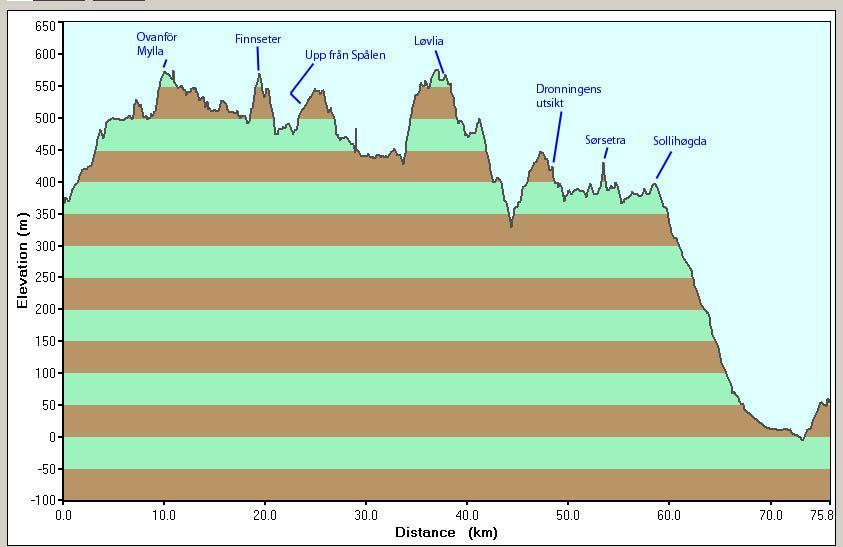 Så, nu var det dax för den tur som skulle ha blivit förra söndagen, om tillräckligt många hade haft vett att boka upp sig på cykelbussen som skiföreningen har. Märkligt nog ofta tunnt med folk på hösten, som är bästa tiden, men fullt mitt i sommaren när det egentligen är på tok för varmt för långa cykel turer. Nåväl, ingen buss = tåg. Och till Grua istället för Ringkollen ger ca 25 km extra + 400 extra höjdmeter. Turen började i ett dimmigt och frostigt Grua. Lite kyligt, men så fort man kom ut i solen ca 50 meter upp så blev det varmt. Asfalt väg upp, knak och knirr i min gamla velociped. Knakande spåras till främre fästet till bakdämparen. Vilket åtgärdades på plats, snabbt och enkelt. Sjön låg om en spegel när jag kommer fram vid Mylla damm. Jag körde vidare på nordsidan för att få mer sol. Det finns en väg på sydsidan också, jag antar att den är plattare. Efter en massa uppförsbacke så stannade jag på ett ställe för att ta en bild. När jag vände mig om för att fortsätta så såg jag att ovanför vägen, liksom lite undangömt, så fanns bord och sittplats. Tydligen fler som tyckte det var bra utiskt här. Fram med köket och test av min nya Soto 4dl bränsleflaska. Man behöver inte pumpa så in i h-e med denna lilla flaskan, men luftfjädern inuti tappar snabbt trycket (liten luftvolym) så man måste ge den några tryckare då och då. Helt OK med tanke på platsen man sparar i packningen. Färden gick vidare söder ut förbi Sindersetra. Kör ut i skogen för tidigt, men hittar sedan stigen som leder mot Tversjöstallen. Fortsätter där vidare söder ut. Orkar inte köra över Ringkollen, tar det en annan gång. Gör istället en rekognosering och hamnar så småningom i Finnseter (testar ny väg till Sinnerdammen). Massor av uppförsbacke på vägen dit. Eftersom det är naturreservat mellan Finnseter och Sinnerdammen var jag tvungen att rulla ihop cykeln och stoppa ned den i ryggsäcken och gå till fots hela vägen till Sinnerdammen. Framme vid Sinnerdammen kunde jag snabbt konstatera att man huggit ned en del skog så nu lyser solen på stugan! Trevligt. Upp från Sinnerdalen mot Storflåtan. Här har jag två val. Antingen en 7-jäkla uppför från vägen söder om Hägglivattnet, eller en 7-jäkla uppför till Lövlia med option på Sörsetra + att jag får med mig den mycket fina nedkörningen från Lövlia på sydsidan. Bestämmer mig för att köra via Løvlia. Lunch i solen vid Storflåtan. Jag skulle gärna stannat här längre, men det är långt kvar hem, så jag måste fortsätta. Det är vad jag saknar på sådana här långturer: Möjligheten till långa pauser. Det går ju inte, man måste ju komma hem någon gång. Vidare till Løvlia. Stort ståhej med någon barnaktivitet. Fantastiskt fin körning ned trillestien, den bästa körningen jag gjort här någon gång. Hög fart, bra flyt. När jag svängt vänster ned till Lommedalen, så kommer jag på krönet upp till en plats där det står en karl och viftar med ett gevär (riffle) och pillar med området där man har amunitionen (kammarstycke?). Bäst att hålla sig bakom honom tänkte jag. Han hade en hund med sig, och den verkade också nervös. Handhavandet med vapnet såg inte förtroendeingivande ut och det tyckte nog inte hunden heller. Såg ut som ett vapen för älgjakt. Knasboll, det finns ju inga älgar i det där området, det vet alla som rör sig där. Det duger inte att sätta sig i bilen och åka ut i skogen en gång om året och tro att man kan skjuta älg från grusvägen. Särskilt inte i ett område som kryllar av hytter, marka-gåere, cyklister mm. Nåväl, vid korsningen Lommedalen - Kleivstua blev det Kleivstua. Jag ville få med mig stigen från Sørsetra och söder ut. Ovanligt tort där nu. Och faktiskt så är den här vägen inte dirket så mycket längre än att köra via Lommedalen, men man får en rejäl uppför till Dronningens utsikt. + några backar fram till Sørsetra. Exiten via Lommedalen är bra, men stigen söder ut från Sörsetra är bättre. Jag skippade att svänga förbi PG-landningen vid Solfjellstua, utan tog bestemor-ruta hem, dvs asfaltsvägen. Hade haft mitt av uppför den här dagen... Starten i Grua... ----------------------------------------------------------------------------------------------------------------------------------------------- Vid Mylla damm ----------------------------------------------------------------------------------------------------------------------------------------------- Kaffeplats. Tyvärr bara mobil med istället för riktig kamera. Jag kan i alla fall snobba med 4dl flaska till Soto Muka Stove, troligen den enda i Norge. ----------------------------------------------------------------------------------------------------------------------------------------------- Spålen ----------------------------------------------------------------------------------------------------------------------------------------------- Lunch vid Storflåtan. ----------------------------------------------------------------------------------------------------------------------------------------------- Vid Dammtjern. På plats så såg Gaustatoppen nära ut, närmare än någonsin. Ser inte riktigt så ut på denna bilden... ----------------------------------------------------------------------------------------------------------------------------------------------- På HG-rampa vid Sundvollen/Dronningens utsikt, vy mot kongens. ----------------------------------------------------------------------------------------------------------------------------------------------- Sørsertra. En favorit i repris. ----------------------------------------------------------------------------------------------------------------------------------------------- Profilen på själva resan från Grua och hem.