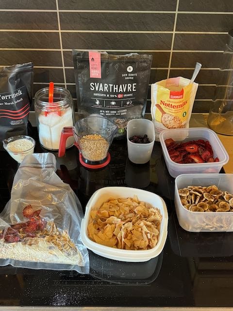 Mat må vi ha, og frokosten forberedes. Havregrøt med nøttemiks, jordbær, blåbær, eple, banan (økologisk for den smaker best) og blåbær.