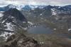 Hermed en turraport for en tur op på Sjogholstind med start og slut på Olavsbu. Hjemmefra havde jeg forberedt at gå een eller flere tinderne omkring Olavsbu sidst i juli, men det blev kun til Sjogholstind. Forberedelsen bestod bl.a. i at kigge nogle turrapporter her. Jeg har det med at gå langsomt, nyde turen og tage en del fotos, så jeg vælger normalt ikke særligt lange topture. Der har været nogen diskussion om navnet på denne top. Sjogholstind er mest anvendt her på forum, men Sjogholstinden, Snøholtind, Snøholstind, Snøholtinden, Snøholstinden og Snøhøltinden er også set anvendt. Der var meldt godt vejr for dagen, søndag den 26. juli, men om morgenen og formiddagen var der dog overskyet, og toppene lå indhyllet i skyer det meste af tiden. Bl.a. på den baggrund valgte jeg at gå op på Sjogholstind fra sydsiden, så der gik længere tid med at komme op, og jeg håbede på bedre vejr i løbet af dagen, hvilket heldigvis også blev en realitet. Ruten taget efter hukommelsen er vist på billede 1. Resten af den detaljerede beskrivelse vil komme i tilknytning til fotos. Jeg prøver at give navne på tinder i fotos – og hjælp mig gerne. Men ellers vil jeg her knytte nogle generelle kommentarer til turen. Opgangen langs æggen mod syd er klyvning i en lidt stejl rende, men efter min opfattelse er dette sted mindre udsat end en del punkter ved æggen mod nordvest. Alt afhænger naturligvis af forholdene på dagen (tåge, regn eller sne) og forholdene på denne tur var tørt og med god sigt. Det sidste stykke af turen gik ned af nogle snefaner mod nord og ind mellem søerne 1444 og 1448, og det var ikke noget problem at komme over elven her. Generelt er turen rimeligt let gået, men jeg anbefaler at have været på omkring 5 lettere topture inden denne. Æggen mod nordvest er nogle steder lidt smal, og man skal klyve en del steder, så man skal være lidt vandt til dette og ikke lide af højdeskræk. Man omgår nogle hamre 4 steder langs æggen, hvor der samtidig er sat varter, hvor man kan gå ud til siden. Ved den største hammer er anvist ruter på begge sider – jeg gik her den sydlige rute. Turen er ganske underholdene og med flot udsigt til tinder i Jotunheimen. Til sammenligning gik jeg æggen fra Tverrbotntindane til Tverrbotnhornet nogle dage senere, og den tur synes jeg er lidt mere vanskelig på grund af løst fjeld, og at ruten ikke på den måde er anvist med varter. /Viggo
