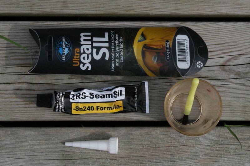 Jeg brukte "Ultra seam SIL" til å tette sømmene med. Har gått over alt på oversiden, bortsett fra sømmene rundt lufteluker og glidelåser i forteltet. Jeg tenkte at det er bare knot, og det blir ikke tettere en glidelåsene uansett(?)