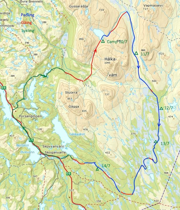 Denne turen er sterkt inspirert av turrapporten til Anders Eriksen. Jeg valgte å bruke packraft, og bar fra enden av veien som går inn i skytefeltet på Porsangermoen og over til Luostejohka, via Guollejavri og Guollejohka. Siden Luostejohka er grunn og steinete øverst, prøvde jeg å plotte inn tidspunktet slik vannføringa skulle være høy nok til at mest mulig kunne padles. Våren i Nord-Norge har vært ekstremt sein i år, og jeg utsatte starten på turen flere uker. Likevel var jeg nok for tidlig ute, siden isen ikke var gått på Guollejavri. Vannstanden øverst i vassdraget var egentlig grei, jeg kunne padle alt uten å måtte bære. Lenger nede i elva ble vannføringa litt vel stor etter min smak. Elva var "fylt opp", slik at det var vanskelig å finne bakevjer for å stoppe, og bortsett fra noen få km med stilleflytende vann, gikk elva i stryk og glattstrøm med ei fart på mellom 5 og 12 km/t. Et velt der båten seilte av gårde kunne fått alvorlige konsekvenser, og padlingen ble nok litt preget av dette. Utenom litt høy vannstand, svarte turen til forventningene. Padleøktene mellom overnattingene var korte, og jeg gikk mange turer til omkringliggende vann. Terrenget var mindre preget av myr enn hva jeg hadde trodd, og det var stort sett lett å ta seg fram. Fisket i vannene var tidvis eksepsjonelt godt, og enkelte steder var det tydeligvis mye stor fisk. I elva fisket jeg lite pga sterk strøm, fikk heller ikke noe, selv om det skal gå stor ørret her. Til og med myggen var lite plagsom, sannsynligvis var ikke klekkingen kommet riktig i gang. Ved å bruke elva som ferdselsvei kommer en lett til et utall av fiskemuligheter. Ved normal sommer-vannstand må man sannsynligvis regne med noen bæringer øverst i elva, og ellers mye stein og grunn elv. Nederst er det 2 partier med fosser og grove stryk som må bæres, til sammen på 6-7 km. Jeg vil likevel anbefale en tur hit, i den midtre delen av elva er det mange fine fiskeplasser og mange muligheter for godt fiske i vannene som ligger tilgjengelig fra elva. Flere bilder finnes her