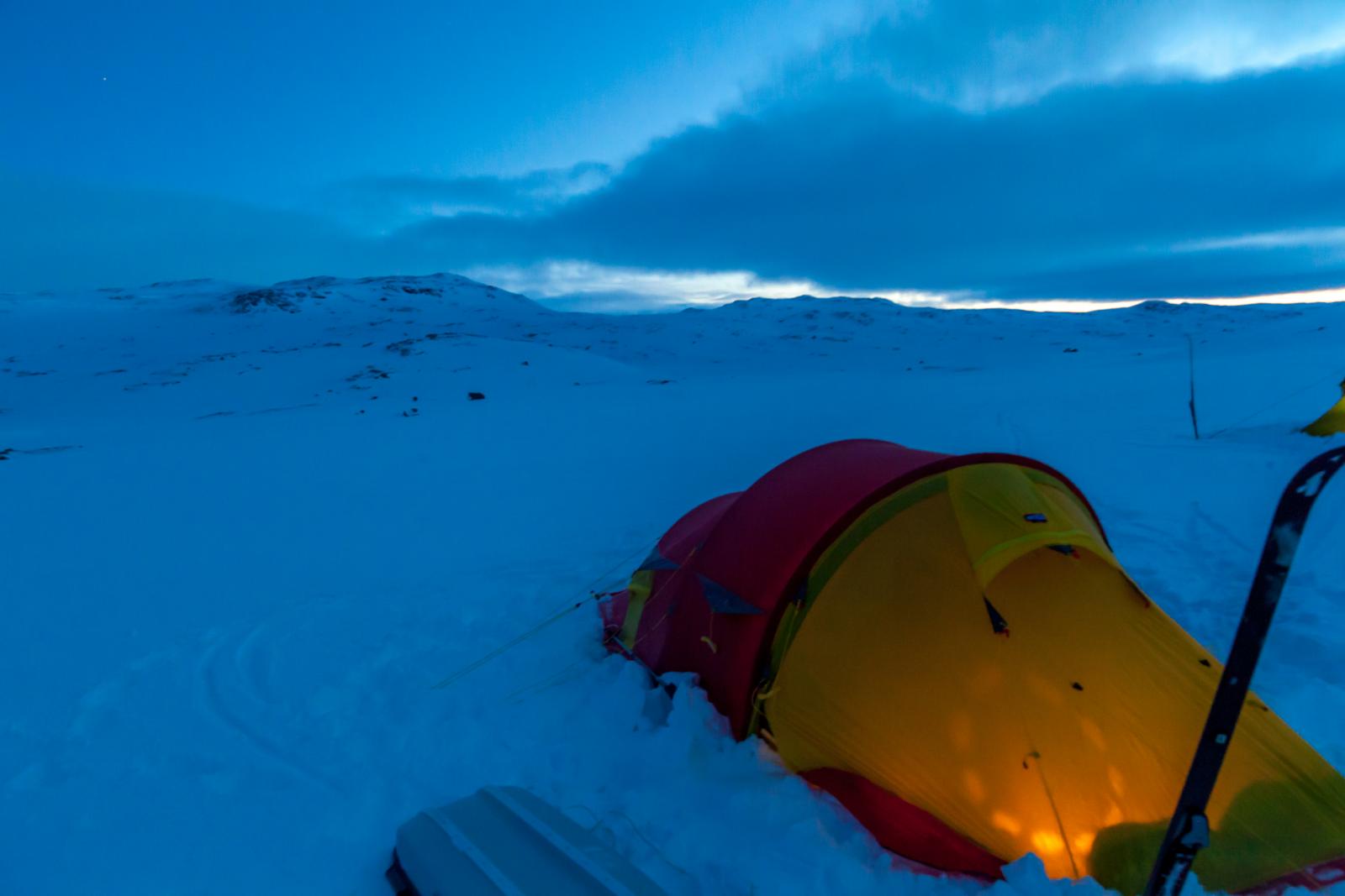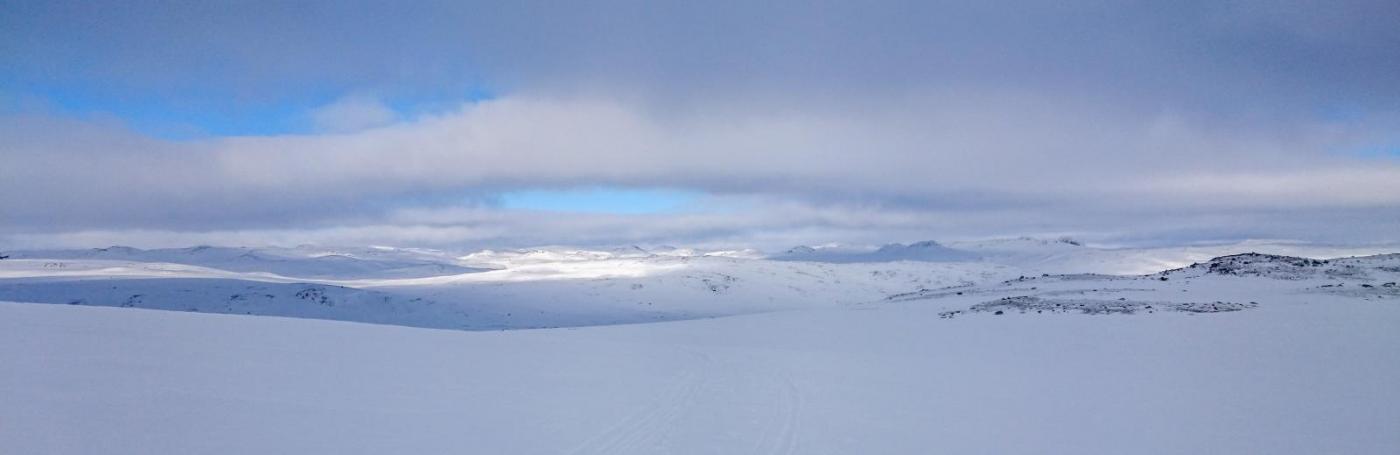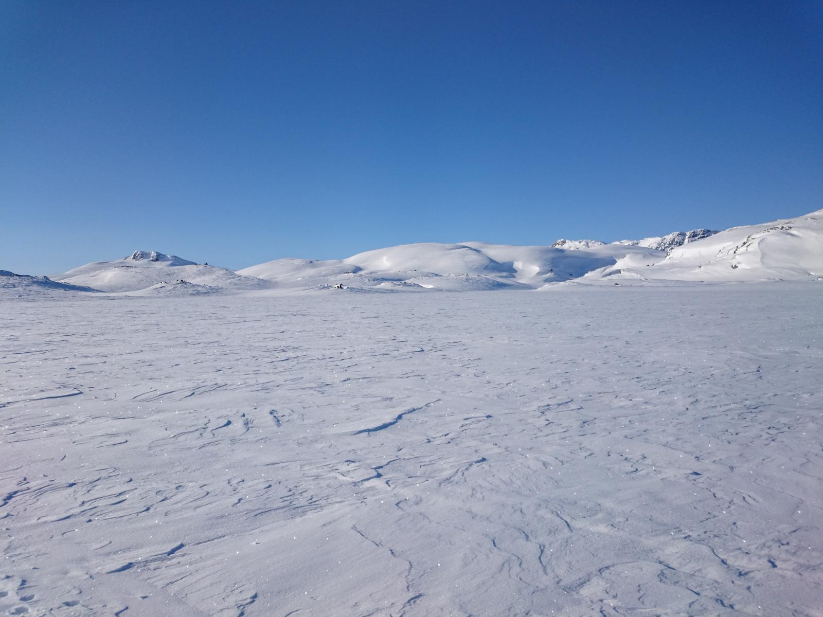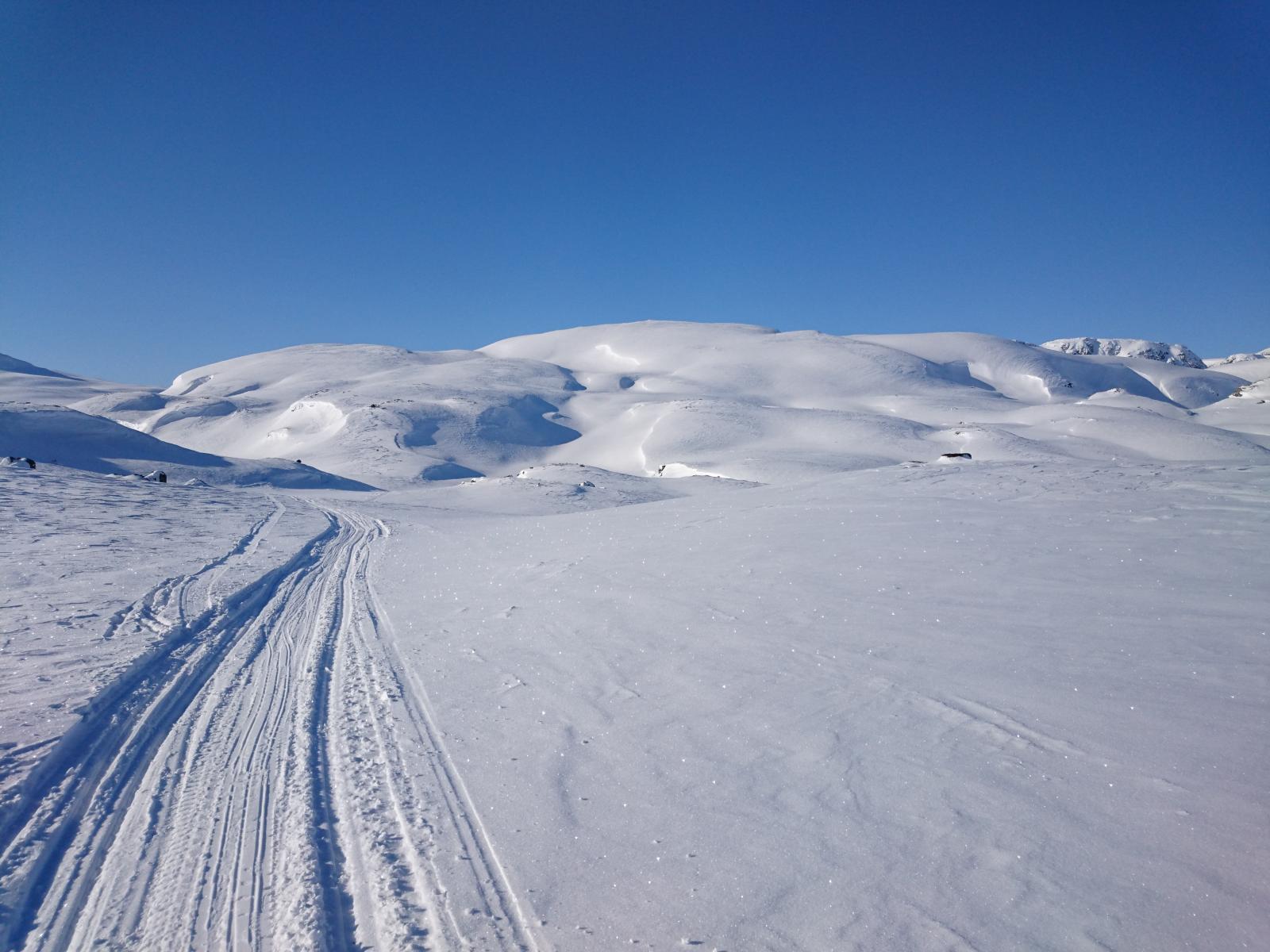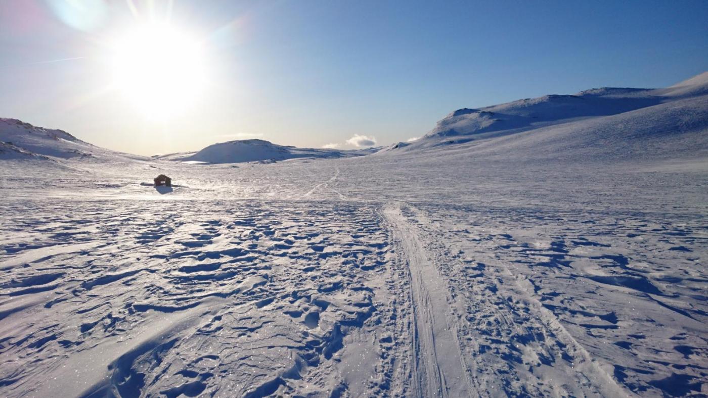 Finse - Haukeli februar 2016 Turen var allerede bestemt i fjor, men pga dårlig vær gikk uka jeg hadde satt av fiseføyka. Nå hadde det kriblet i hele vinter i skibeina, og pulken hadde følt seg ganske så ensom på boden litt vel lenge nå. Ruta ble mer eller mindre ferdig rundt juletider, og mye tid hadde blitt brukt rundt kartene for å bestemme ruta. Ettersom jeg skulle reise alene, ønsket jeg å få litt følelsen av "ensomhet", og å gå stier alle andre ikke fulgte. Dette hadde sammen med rotasjonen min på arbeid mye av skylden for at det ble nettopp denne tiden av året. En tid da de fleste løypenett ennå ikke er kvistet, og det fortsatt er skikkelig vinter! Kartene ble skrevet ut fra tjenesten her på forumet. Skrev ut i A4, laminerte og hadde da ett pasende format som passet i jakkelomma som var vanntett. Av de siste forberedelsene, var det å lage 60cm teltplugger av brøytestikker. Dette var den sorte typen, som ikke er helt hul, men har forsterkninger innvendig. Angrer på at jeg ikke lagde flere, for dette var genialt i sterk vind, og for kalde fingre. Litt kjapt om utstyret jeg benyttet på turen. Fjellpulken 144 Åsnes Nansen m/kortfell Artic bedding 2 posesystem. Syntetisk Ytre, dun innerst. OmniTi m/ Silencer og Coleman 550B Toaks 2L Titankjele m/hjemmelaget cosy Kart, kompass og GPS Inreach SE 2 batteribanker, 10W solcellepanel, AA og AAA Litium batterier 1 Gravlykt Kindle Helsport Patagonia Exped 7LW og skumunderlag Leke plastspade til snøsmelting Snøspade 2x hodelykter 5L Bensin Oakley Googles Skismøring Førstehjelpsutstyr, (strips, sportstape, tensoplast osv) Speilrefleks og Gopro Klær: Bergans Antartic Expedition Jakke (fantastisk!!!) Norrøna Recon Gtex bukse 2x tykke ullsokker 2x linere 1x tynnere ullsokker (ble ikke brukt) Brynje netting (satt på hele turen) 2x ull Lag 2 1 tynn fleecegenser 1 tykk fleecejakke 1 Marmot dunjakke (UL) Balaclava 2x ansiktsmasker 1x Ullvangsgenser Mat: 6 Real middag 6 Real frokost 2x Bixit 2x skivet brunost Rett i koppen Sjokolade og Solbertoddy 3x Hot Imago øl pølser 3x komaposer med sjoko og salte nøtter 3x store sjokoladeplater 4x poser sølandschips Jeg kommer mere tilbake med noen av utstyrs erfaringene jeg gjorde på turen, og hva jeg angrer på. Endel av oppsettet er jeg fornøyd med, andre ting var fullstendig bortkastet. Men ha i bakhodet, at dette var en solo-tur i februar, og hvor jeg setter sikkerheten uten tvil i første rekke. Og JA, dette resulterte i en kanskje unødvendig tung pulk Finse - Krækja Jeg kom hjem fra arbeid på vestlandet tirsdag kveld, og håpet var å rekke morgentoget mot Finse onsdag morgen. Men det ble litt vel tight, så ble nattoget isteden. Fikk en kamerat til å kjøre meg til Larvik togstasjon da dette gjorde transport av pulken noe lettere. Selvom jeg ikke hadde bestilt plass til pulken ordnet dette seg fint. Men fikk beskjed om at ikke alle tog var satt opp til å ta med gods, slik at man egentlig ikke kunne forvente dette. Pulken veide da i underkant av 50kg, og var ikke særlig håndterbart for en person heller, som også var kravet. Det store spm var om jeg rakk å komme fra spor 1 til spor 5 innen de 16min overgangen min var i Drammen. Det gikk med nød og neppe, etter litt tigging om hjelp Som andre før meg, gikk jeg trøtt i trynet av på Finse stasjon 04:04 og fant frem til postbua. Lite ante jeg at Finsehytta lå nesten vegg i vegg. Da hadde jeg nemlig gått dit for å tømt ryggen, isteden for å trippe rundt på 3kvm i villrede over hva jeg skulle gjort. I panikken gikk jeg bortover stasjonen for å se om det kunne være ett åpent toalett. En dør var åpen, og rett på innsiden lå den en død rev å kikket på meg.... Ja jeg slapp faktisk nesten å leite videre etter ett toalett...Men bare nesten..... I påvente av litt lys, gjorde jeg de siste forberedelsene før avreise. Fylling av drivstoff på primusene, pakke dunjakke og votter i Artic beddingen lett tilgjengelig, og satt på fellene på skia. Når det endelig lysnet så jeg Finsestua, og gikk bort dit for tømming av rygg, og en bedre frokost før turen startet rundt 0930. Må si jeg hadde litt sommerfugler i magen når ski og pulk var spent på, og det føyket snø rundt ørene mine. Jeg har vært endel på tur før, både vinter og sommer, men dette ble liksom litt annerledes. Marginene virket liksom litt mindre der man plutselig sto og skulle ta sine første stavtak.... Som sagt så blåste det som vanlig på Finse, og det var frem med GPS allerede ved Finsevatnet. Det skulle være kvistet løype opp til Midtnutvatnet, og etter hvert havnet jeg inn på denne løypa. Må jo innrømme at det er ganske behagelig å følge disse kvistene, selvom det var heller dårlig med spor å følge. Jeg kjente at det var uvant å dra pulk igjen, er jo snart 20år siden sist. Og å dra pulk er ICKE som å sykle, det glømmer man....Iallefall muskelaturen Mot slutten av dagen løyet vinde, og det ble ett nydelig vær. Jeg bare gikk der og nøt omgivelsene. Det var bare så ufattelig vakkert over alt!! Jeg var nå på veg ned mot Finsbergvatnet, og her fikk jeg min første lille lærepenge. Egentlig gammel enkel lærdom, men man glemmer fort litt på vinteren, da alt liksom er vasket over. Alt ser liksom så glatt å fint ut, med unntak av en eller annen stein som stikker opp. Jeg stopper litt opp over en liten kul. Lurer på om det bare er å sette utfor. Heldigvis for meg, så er jeg såpass dårlig på ski, at jeg faktisk vurderer nedkjøringene mine.... Jeg syns det virker i bratteste laget, og velger å gå litt tilbake og å ta en annen rute ned. Da jeg kommer mer ut på siden, ser jeg at rett nedenfor der jeg i stad vurderte å kjøre, var en skavel, og ett fall på ca 3m. 3m er ikke mye, men alene med pulk kan det fint være nok til ett brekt bein eller arm. Dette fikk meg til å innse det innlysende, at mye står uskrevet mellom høydekotene på 20m på kartet!!! Her gjelder det å følge med.... (ja jeg veit...N
