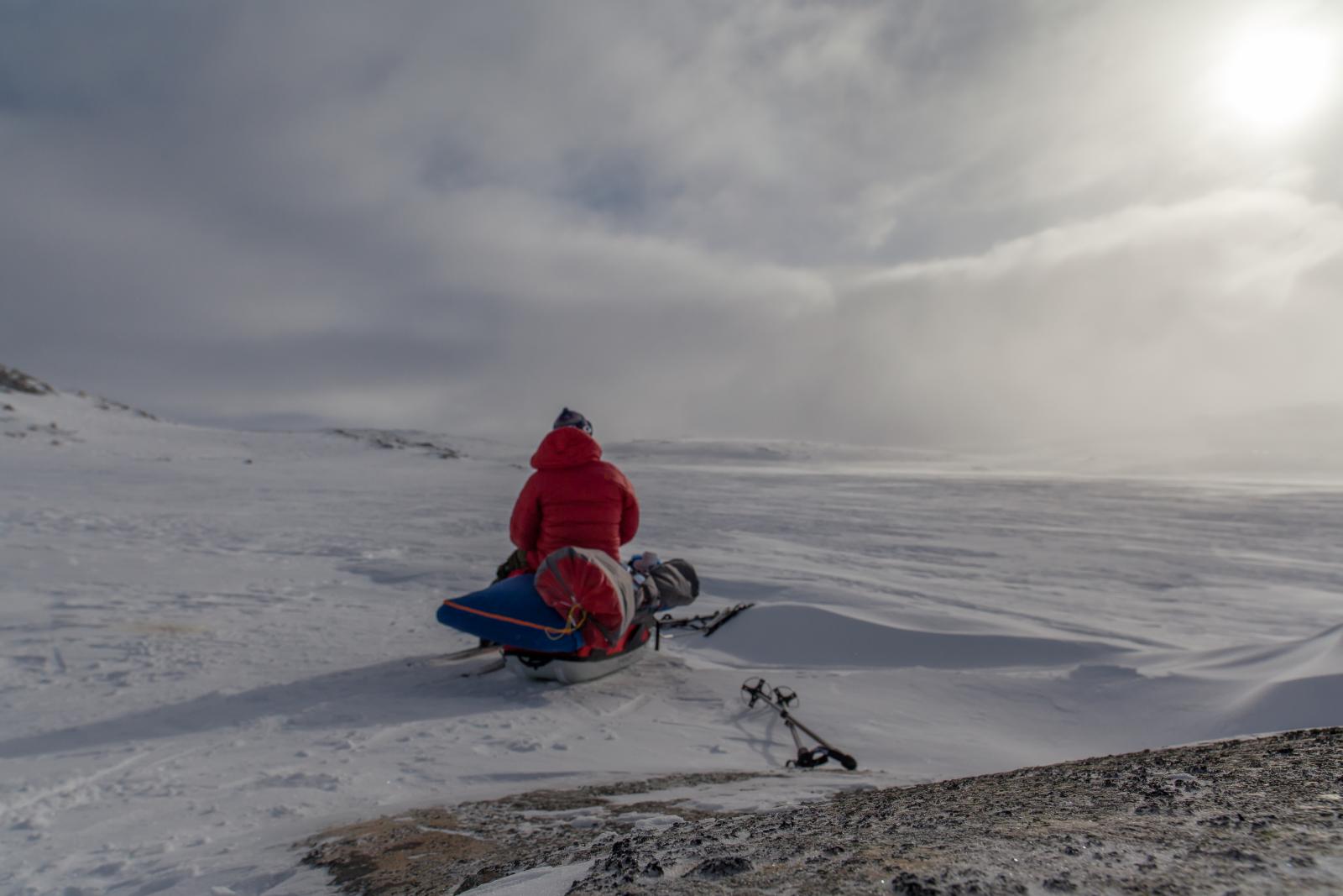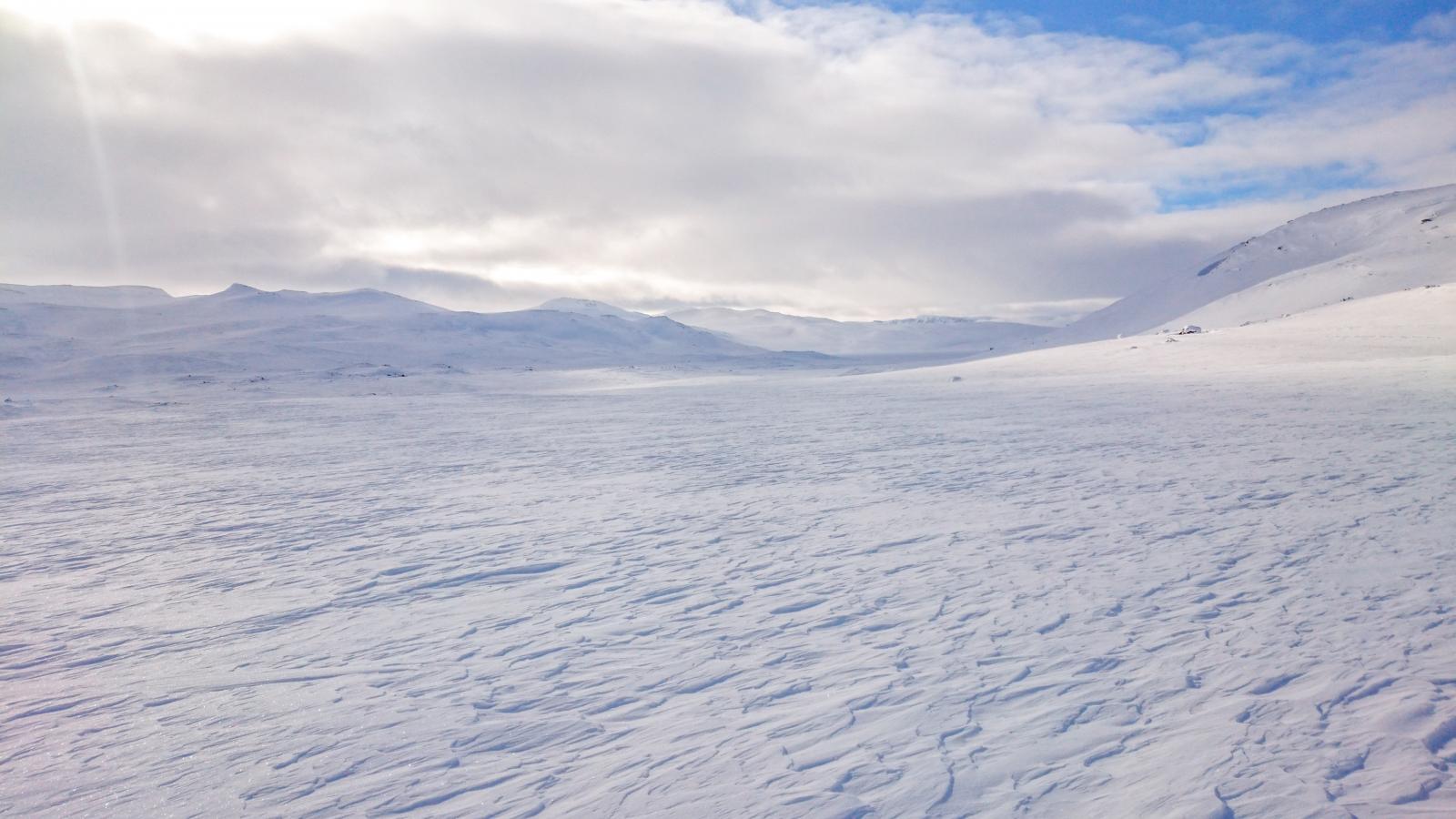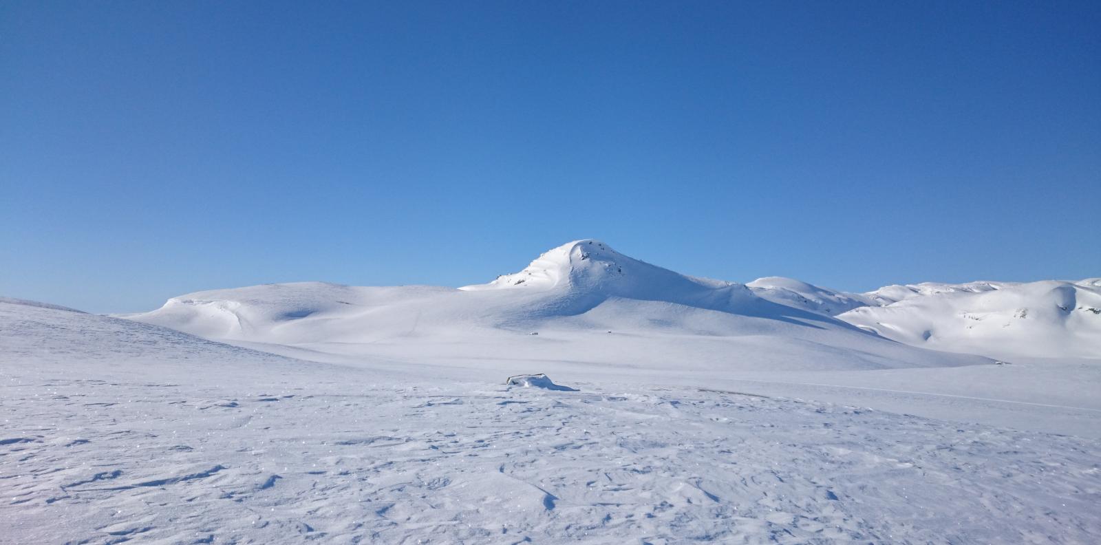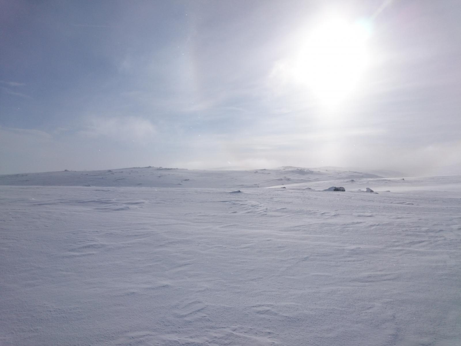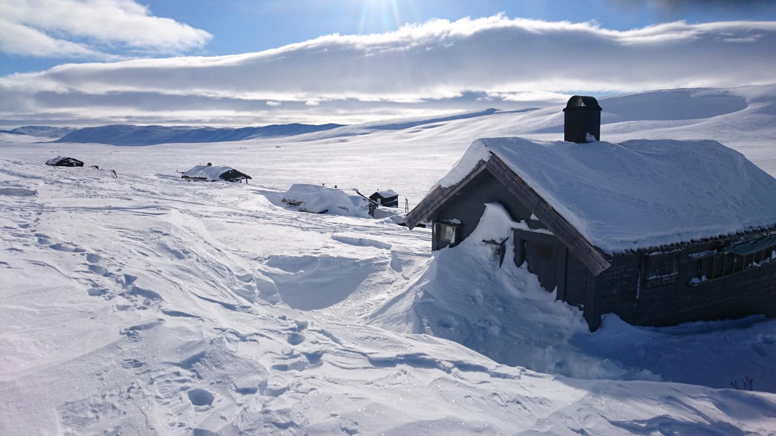 Finse - Haukeli februar 2016 Turen var allerede bestemt i fjor, men pga dårlig vær gikk uka jeg hadde satt av fiseføyka. Nå hadde det kriblet i hele vinter i skibeina, og pulken hadde følt seg ganske så ensom på boden litt vel lenge nå. Ruta ble mer eller mindre ferdig rundt juletider, og mye tid hadde blitt brukt rundt kartene for å bestemme ruta. Ettersom jeg skulle reise alene, ønsket jeg å få litt følelsen av "ensomhet", og å gå stier alle andre ikke fulgte. Dette hadde sammen med rotasjonen min på arbeid mye av skylden for at det ble nettopp denne tiden av året. En tid da de fleste løypenett ennå ikke er kvistet, og det fortsatt er skikkelig vinter! Kartene ble skrevet ut fra tjenesten her på forumet. Skrev ut i A4, laminerte og hadde da ett pasende format som passet i jakkelomma som var vanntett. Av de siste forberedelsene, var det å lage 60cm teltplugger av brøytestikker. Dette var den sorte typen, som ikke er helt hul, men har forsterkninger innvendig. Angrer på at jeg ikke lagde flere, for dette var genialt i sterk vind, og for kalde fingre. Litt kjapt om utstyret jeg benyttet på turen. Fjellpulken 144 Åsnes Nansen m/kortfell Artic bedding 2 posesystem. Syntetisk Ytre, dun innerst. OmniTi m/ Silencer og Coleman 550B Toaks 2L Titankjele m/hjemmelaget cosy Kart, kompass og GPS Inreach SE 2 batteribanker, 10W solcellepanel, AA og AAA Litium batterier 1 Gravlykt Kindle Helsport Patagonia Exped 7LW og skumunderlag Leke plastspade til snøsmelting Snøspade 2x hodelykter 5L Bensin Oakley Googles Skismøring Førstehjelpsutstyr, (strips, sportstape, tensoplast osv) Speilrefleks og Gopro Klær: Bergans Antartic Expedition Jakke (fantastisk!!!) Norrøna Recon Gtex bukse 2x tykke ullsokker 2x linere 1x tynnere ullsokker (ble ikke brukt) Brynje netting (satt på hele turen) 2x ull Lag 2 1 tynn fleecegenser 1 tykk fleecejakke 1 Marmot dunjakke (UL) Balaclava 2x ansiktsmasker 1x Ullvangsgenser Mat: 6 Real middag 6 Real frokost 2x Bixit 2x skivet brunost Rett i koppen Sjokolade og Solbertoddy 3x Hot Imago øl pølser 3x komaposer med sjoko og salte nøtter 3x store sjokoladeplater 4x poser sølandschips Jeg kommer mere tilbake med noen av utstyrs erfaringene jeg gjorde på turen, og hva jeg angrer på. Endel av oppsettet er jeg fornøyd med, andre ting var fullstendig bortkastet. Men ha i bakhodet, at dette var en solo-tur i februar, og hvor jeg setter sikkerheten uten tvil i første rekke. Og JA, dette resulterte i en kanskje unødvendig tung pulk Finse - Krækja Jeg kom hjem fra arbeid på vestlandet tirsdag kveld, og håpet var å rekke morgentoget mot Finse onsdag morgen. Men det ble litt vel tight, så ble nattoget isteden. Fikk en kamerat til å kjøre meg til Larvik togstasjon da dette gjorde transport av pulken noe lettere. Selvom jeg ikke hadde bestilt plass til pulken ordnet dette seg fint. Men fikk beskjed om at ikke alle tog var satt opp til å ta med gods, slik at man egentlig ikke kunne forvente dette. Pulken veide da i underkant av 50kg, og var ikke særlig håndterbart for en person heller, som også var kravet. Det store spm var om jeg rakk å komme fra spor 1 til spor 5 innen de 16min overgangen min var i Drammen. Det gikk med nød og neppe, etter litt tigging om hjelp Som andre før meg, gikk jeg trøtt i trynet av på Finse stasjon 04:04 og fant frem til postbua. Lite ante jeg at Finsehytta lå nesten vegg i vegg. Da hadde jeg nemlig gått dit for å tømt ryggen, isteden for å trippe rundt på 3kvm i villrede over hva jeg skulle gjort. I panikken gikk jeg bortover stasjonen for å se om det kunne være ett åpent toalett. En dør var åpen, og rett på innsiden lå den en død rev å kikket på meg.... Ja jeg slapp faktisk nesten å leite videre etter ett toalett...Men bare nesten..... I påvente av litt lys, gjorde jeg de siste forberedelsene før avreise. Fylling av drivstoff på primusene, pakke dunjakke og votter i Artic beddingen lett tilgjengelig, og satt på fellene på skia. Når det endelig lysnet så jeg Finsestua, og gikk bort dit for tømming av rygg, og en bedre frokost før turen startet rundt 0930. Må si jeg hadde litt sommerfugler i magen når ski og pulk var spent på, og det føyket snø rundt ørene mine. Jeg har vært endel på tur før, både vinter og sommer, men dette ble liksom litt annerledes. Marginene virket liksom litt mindre der man plutselig sto og skulle ta sine første stavtak.... Som sagt så blåste det som vanlig på Finse, og det var frem med GPS allerede ved Finsevatnet. Det skulle være kvistet løype opp til Midtnutvatnet, og etter hvert havnet jeg inn på denne løypa. Må jo innrømme at det er ganske behagelig å følge disse kvistene, selvom det var heller dårlig med spor å følge. Jeg kjente at det var uvant å dra pulk igjen, er jo snart 20år siden sist. Og å dra pulk er ICKE som å sykle, det glømmer man....Iallefall muskelaturen Mot slutten av dagen løyet vinde, og det ble ett nydelig vær. Jeg bare gikk der og nøt omgivelsene. Det var bare så ufattelig vakkert over alt!! Jeg var nå på veg ned mot Finsbergvatnet, og her fikk jeg min første lille lærepenge. Egentlig gammel enkel lærdom, men man glemmer fort litt på vinteren, da alt liksom er vasket over. Alt ser liksom så glatt å fint ut, med unntak av en eller annen stein som stikker opp. Jeg stopper litt opp over en liten kul. Lurer på om det bare er å sette utfor. Heldigvis for meg, så er jeg såpass dårlig på ski, at jeg faktisk vurderer nedkjøringene mine.... Jeg syns det virker i bratteste laget, og velger å gå litt tilbake og å ta en annen rute ned. Da jeg kommer mer ut på siden, ser jeg at rett nedenfor der jeg i stad vurderte å kjøre, var en skavel, og ett fall på ca 3m. 3m er ikke mye, men alene med pulk kan det fint være nok til ett brekt bein eller arm. Dette fikk meg til å innse det innlysende, at mye står uskrevet mellom høydekotene på 20m på kartet!!! Her gjelder det å følge med.... (ja jeg veit...N
