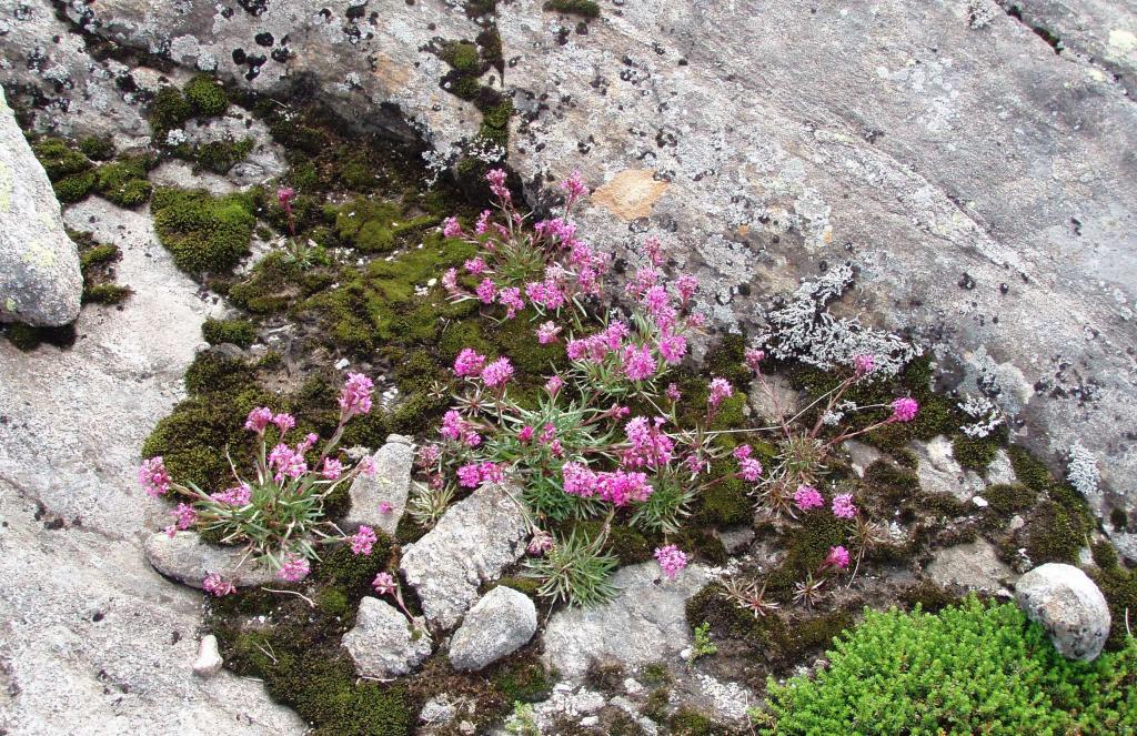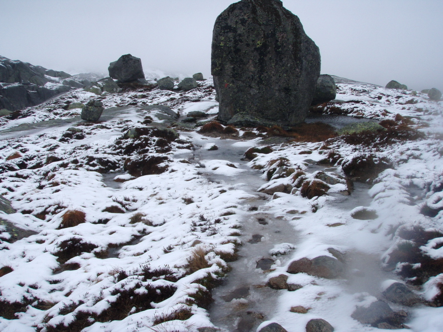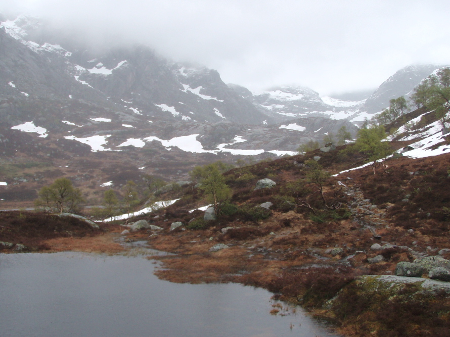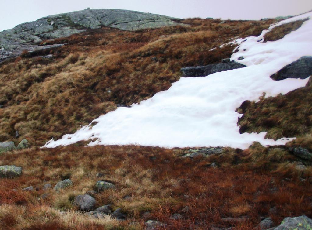 Forrige uke var været strålend, og akkurat riktig for den årlige første turen opp Fidjadalen, men forpliktelser i heimen.... Denne uka hadde jeg bestemt meg for å prøve inn til Blåfjelenden fra Hunnedalen. På lørdagen var det bare litt regn og helst lite vind. Selv om det ikke var mange gradene, så ble det en fin tur innover heia i medvind. Det ligger fortsatt en god del snøfenner, men ikke mer enn det pleier på den første turen. Jeg har opplevd med snø i juni noen år. Snøen ligger selvsagt forskjellig fra år til år. I år er det lite snø i høyden, men fortsatt en del nedover liene. Det hadde gått folk innover, men de hadde snudd ved første bekk. (Som ikke var større enn vanlig, når det regner.) Det var også spor av folk fra uka før. Mens vi snakker om spor, så var det også spor av elg nesten øverst (og de var rimelig ferske) og spor av et mindre dyr. Jeg mener det liknet på rein, men kan langtfra være sikker. Sporene var gamle og hadde litt nysnø over seg. Det blir fra andre kanter av landet rapportert om mengder av lemen. Så ikke snurten av lemen, hverken død eller levende. Spor av rev derimot.... Det jeg fik se var greplyng med blomst. Jeg kan ikke huske å ha sett det så tidlig noen gang. Det var, som nevnt, regn innover. Utover dagen og kvelden gikk det mer og mer over til sludd. Temperaturen kom aldri under null, men det ble hvitt nedover fjellsiden. Om morgenen på søndag ventet jeg en stund med å ta ut. Selv midt på dagen var det ikke mye av nysnøen smeltet over 800moh. Det var litt surt en stund, men det er uansett fint å få startet sesongen. (Det merkelige er at jeg ikke syntes at været spilte noen rolle for om jeg skulle ta ut. Skulle turen gått på ski, hadde jeg syntes det var ille.)