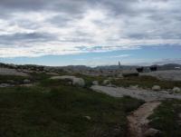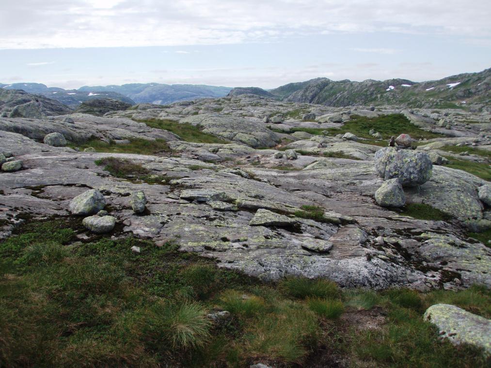 Med gårsdagens tur i beina - og i friskt minne, kan jeg tenke meg å dele - nettopp minnene - med andre. Det er såvist ikke ofte værgudene har vært så snille i år, som i denne helga. Ikke mye vind, sol og en passe temperatur. Stutaheiå ligger mellom Stavanger Turistforenings hytter Sandvatn og Blåfjellenden. Turen er "normert" til 4 timer. Hytten i Frafjordheiene ligger så tett at de blir mye brukt av familier. Så selv om turen går over snaue heia i over 1000 moh og kan være utsatt for både tåke, vind og snø tidlig i sesongen, så blir stien tråkket opp av familier med unger ned i 6 års alderen - og av ungdom på sin første tur alene. Nå er ikke turen så lang at dette medfører problemer. Jeg hadde ikke med barn, og hører definetivt ikke til kategorien "ungdom", så jeg startet ved Lortabu i Hunnedalen, noe som gir en 6-7 "normerte" timer til Blåfjellenden. En passe tur i slikt nydelig vær. Det litt spesielle med disse turene over heiene, er at det vide utsyn og at det ikke er mye som stenger for utsikten. "Høy himmel" er det uttrykket jeg selv bruker. Det er omtrent det samme du ser uansett retning. Fjell og topper. Dalene viser som mørke revner i all steinen. Det er ikke lett å orientere seg i dette terenget utenom stien. Det er ingen lettvindte ruter, og du er avhengig av å finne "rette" nedgangen til de smådalene som du må over uansett i hvilken retning du går. For ikke å snakke om at det ikke er mange plasser du kommer ned til vannene i bunn av de større dalene. Men noe som lyser opp i all steinen er fjelltjæreblommen. Det blir påstått at den trives best i områder med tungmetaller. Det skulle vært interesant å vist hvilke tungmetalle som ligger i granitten her. Men det kjekkeste med turen er tross alt det vide utsyn, det gir perspektiv på turlivet. Og det er litt spesielt å kunne se fjelltoppen du skal nedunder i noen timer før du i det hele tatt begynner på bakken ned.