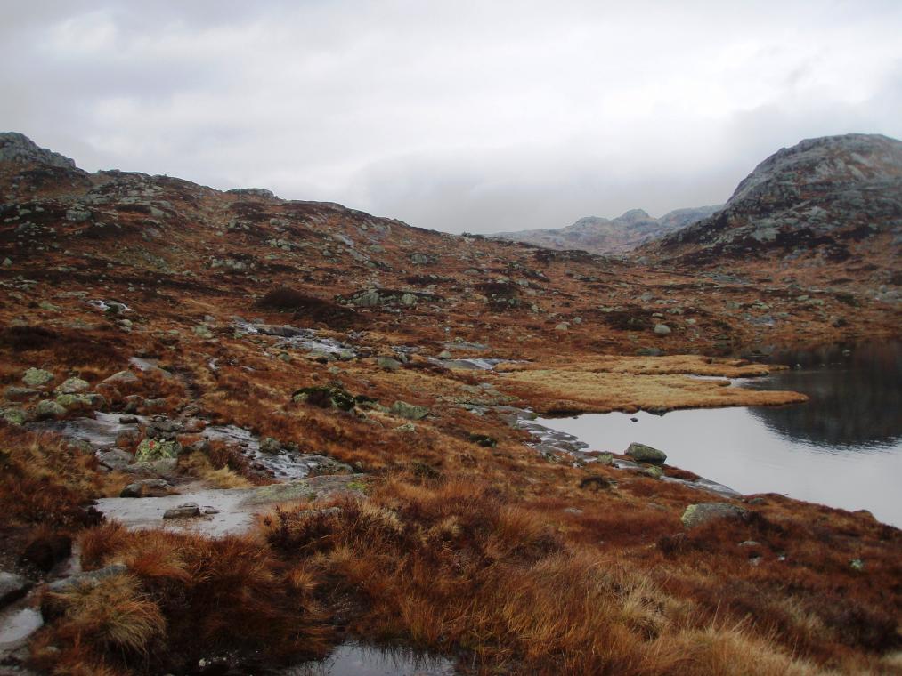 Det ble til at jeg tok turen innover heia på fredags ettermiddag for å bli til søndag.Fredagen var det overskyet, uten regn og plussgrader. Det er i grunnen det beste været på denne årstiden. Er det klart, blir det ofte frost. Det lille som er igjen av farger er dype høstfarger. Det er en egen stemning på disse høstturene. Det er litt mer ”ensomt”. Naturen er klar for vinteren, og det er ikke så mange timene med skikkelig dagslys. Det var ikke lenge etter ankomst til hytta at tussmørket kom snikende. Det er nok gålys ute en stund etter at stearinlysene tennes inne, men det blir likevel kveldsstemning i hytta. Det var ikke antydning til frost. Det lå noen snøflekker i nordhellingene. De tinte godt på lørdagen i yr/regn og en del plussgrader. Men til forskjell for mange andre. Skiene står fortsatt ubrukt. Jeg håper det vil fortsette noen uker til.