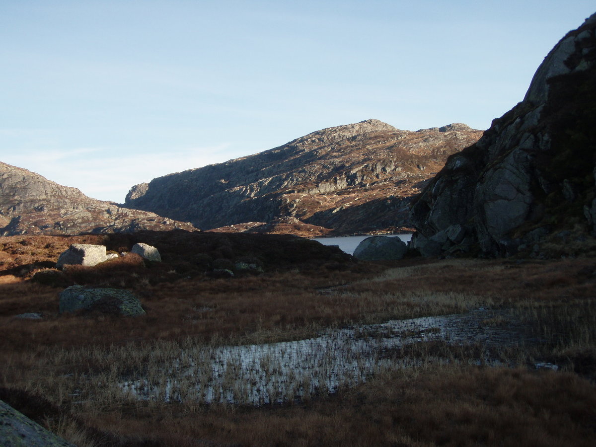 Det ble en båsende tur i sterk motvind inn fra Hunnedalen og nordover. Det var ikke spor i sorpa, og jeg så heller ikke en kjeft. Det var ikke mange gradene over 0 og det lå litt snø oppover liene. Det er slike dager det er godt å kunne ta seg inn i en hytte for å få varmen i kroppen. I dette tilfellet en av Stavanger turistforenings hytter i området. Vinden tok skikkelig i hytta, og det regnet bra. Men på veien tilbake hadde jeg ikke en dråpe, og med vinden i ryggen (og litt lettere sekk), ble det en fin tur. Søndagen tur gikk på andre siden av dalen. Været var helt motsatt av lørdagens. Nesten ikke vind og sol fra skyfri himmel. Til gjenngjeld var det et tynt frostlag, som var en utfordring i bakkene. Det ble sabla glatt, og jeg tok ikke mange sjangser. (Buksa trenger uansett en vask...)