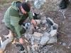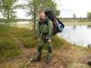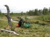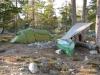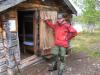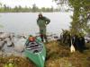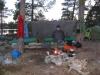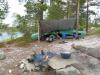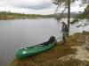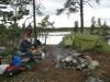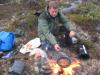 Jeg luftet også planen for Tore, min stesvigerfar som tidligere har vært med meg på flere eventyr - blant annet Orreleik i Myklandsvatna, utflukt på Andørja i Troms og fjellrangling på Hovden. Han fyller 70 år i år og tiden var moden for at han skulle å komme seg til Femundsmarka hvor han aldri har vært før. Men nå trengte vi en sistemann, en som kunne være padlemakkeren til Simen. Vi spurte mange av vennene våre, men det passet ikke for noen av dem. Så kom Simen på at kanskje svigerfaren hans Hugo ville være med, som for anledningen også hadde jubileum i år - 60 vintre gammel skulle han bli. Han var vant til turlivet med skiekspedisjoner over Finnmarksvidda, Hardangervidda, Pasvik samt turer hit og dit i det ganske land. Han brukte cirka 2 minutter på å bestemme seg for å fly ned fra Tromsø til Gardermoen for å bli med på denne fantastiske turen Det ble det mange av disse kaffebålene med litt attåt Avreisedagen er kommet og vi pakker med ekstra godsaker i fast og flytende form, slikt kan man unne seg når man skal bruke en svær kano som transportmiddel inn i villmarken. Tore ringer meg klokken halv to på natten, og forteller at han er på utsiden av døra. Steike så tidlig han var pån da tenker jeg, han har kjørt fra Arendal opp til meg i Sandefjord - så det blir en ekstra lang tur for han opp til Käringsjön i Sverige. Storsekken og løsøre er pakket og klart i garasjen, vi hiver alt inn i bilen og brenner på nordover mot Trysil for så å ta inn i Sverige. I Tännäsdalen møter vi på Rudolf og gjengen som er ute å strekker på beina om morran, et uvanlig syn for oss østlendinger. Etter endel timer er vi fremme ved Käringsjön turisthytte, der møter vi Per-Roger som slår av en prat og noterer seg at vi har ankommet. Han forteller at kanoene står klare nede ved den lille kanalen som renner ut i Käringsjön vannet. Vi løser ut et fiskekort hver for Rogen og fyller kanoen med sekker og hund, klare for eventyr. Simen og Hugo kommer oppover senere og vi har planlagt å møte dem ved leirplassen inne i vika på Kleppnäset uti Rogen. Vi har bestemt oss for å krysse Rogen idag ved Rødviken fordi det er meldt mye vind de neste dagene. Det skal allerede begynne å blåse opp utover kvelden, så vi håper på at Simen og Hugo kommer seg trygt over idag og møter oss til bålkaffe på den riktige siden. Mye skal med i kanoen Vi padler oss over Käringsjön og går to vendinger over til Håen som vi igjen krysser og går iland for å ta den lange bæringen ned til Rogen. Det er en oppgave som jeg tok litt for lett på, vi oppdager fort at dette blir et skikkelig pes med en kano som veier over 35 kg. Men vi tar tiden til hjelp og tar hyppige pauser når underarmen begynner i svi og skulderen rister av ubehag. Etterhvert kommer vi til et myrlandskap som vi kan dra kanoen etter oss nedover i tau, da går det lekende lett og om ikke mange straksene er vi nede ved Rogens bredder. Men det ser ikke veldig koselig ut å krysse Rogen idag med tanke på bølgene i sjøen og været som truer over oss, vi vurderer frem og tilbake og finner ut at vi kjører på mens det ennå er mulighet. Vi finner smaleste punkt for kryssing og vender snuten mot Kleppnäset med presise padletak, det blåser fra nordvest og vi får bølgene inn fra siden. Det er litt huskete, men det går greit. Idapelsen piper litt og liker seg ikke, men hun legger seg ned som en liten ball nedpå reinsdyrskinnet i bunnen av kanoen og holder ro etterhvert. Mot kryssningspunktet i ruskevær Vi kommer oss over på andre siden med svette panner og runder odden så fort vi kan, langs land glir vi mot den etablerte leirplassen som viser seg der fremme. Deilig å være fremme etter en lang dag med kjøring, padling og bæring. Nå skal det bli godt med et skikkelig bål og finne noe godt i matsekken som man kan tygge på, vi pakker ut og finner et par teltplasser - som det forøvrig ikke er for mye av på denne plassen! Det er satt ut flotte tørre bjørkestokker som man kan forsyne seg av til ved og det er lagd egen bålplass iform av en firkantet metalkasse rammet inn av treverk. Nå er det bare å slappe av og vente i spenning på Simen og Hugo Tore er kjapt ute med å få igang bålet og setter over en svartkjele med kaffe Maten fortært og kaffen nytes mens kvelden kommer sigende, vi er stadig oppe ute på fjelltuppen for å se etter de to andre eventyrerne som vi håper på skal vise seg når som helst rundt odden der ute, men ser ingen. Tiden går og vi begynner så smått å bli litt urolig, vi lurer på hvor de kan være hen. Har de gjort leir nede ved Rogen pågrunn av været og mistet luken for å krysse over idag, eller er de på vei. Vi har ingen dekning på telefon så vi kan ikke gjøre annet enn og vente og se utover Rogen. Plutselig begynner Ida å småbjeffe og ørene løfter seg, et eller annet dyr eller menneske er i nærheten... vi ser ingenting. Men så hører vi noen som roper nede ved vannkanten og der ser vi Simen og Hugo nærme seg land med kanoen sin, for en lettelse det er Ida løper ned for å møte dem og vi følger på, de kom seg over før det ble skikkelig mørkt og før vinden ble verre. Vi hiver flere kubber på bålet, finner frem det gjeveste vi har av edle dråper i sekken og sitter rundt flammene til de sene timer mens praten og latteren går. Frokosten er snart klar De neste to dagene er vi værfaste på Kleppnäset pågrunn av mye vind. Store bølger med hvite topper gjør det til et enkelt valg å holde seg på land, vi gjør det beste ut av det og utforsker området rundt med dagsturer opp på nærmeste topp og med fiskestangen i nærliggende vann. Vi prøver å fiske i Rogen, men med dårlig resultat - eneste fisken som biter på her blir en pen kilos ørret som klarer å gå av kroken i et hopp rett ved land. Ergerlig.. Tore, Hugo og Ida oppe på toppen av Kleppnäset for å få oversikt og utsikt Simen fant seg en gris som han kunne ri på oppover Ikke all