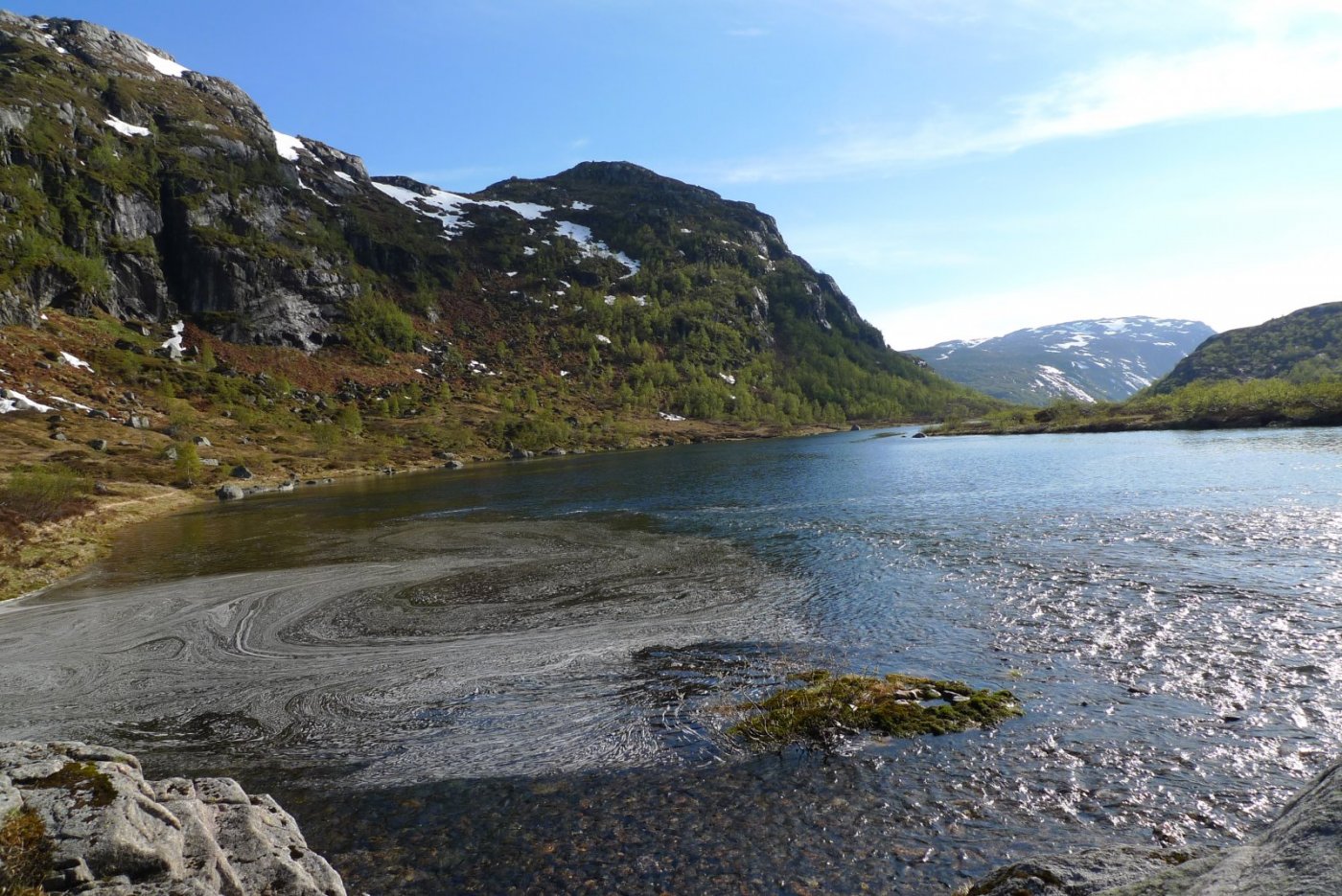 Har benyttet de to siste ukene nå etter Pasvikturen til å fylle på med topper i Indre Agder. Pasvik i en uke kan bli noe flatt og kjedelig. Dagens tur gikk til Sirdal. Målet var Ommundsknuten-764, 400 høydemeter opp fra Feed. Svingte også oppom Viraksskardknuten, Gleinfjell og Nonsknuten. To timer opp, to timer på toppen og en snau halvtime ned att. Totalt antall navnsatte topper i boka ble da 995. Så det nærmer seg et av friluftslivets mange mål og motivatorer. Opp fra Feed i den glisne lia i midten: Deretter slakt innover før det går bratt opp mot slutten: Rene påskestemningen ved toppvarden: I siste del av nedkjøringa. Skyggefult og kort avstand mellom portene: