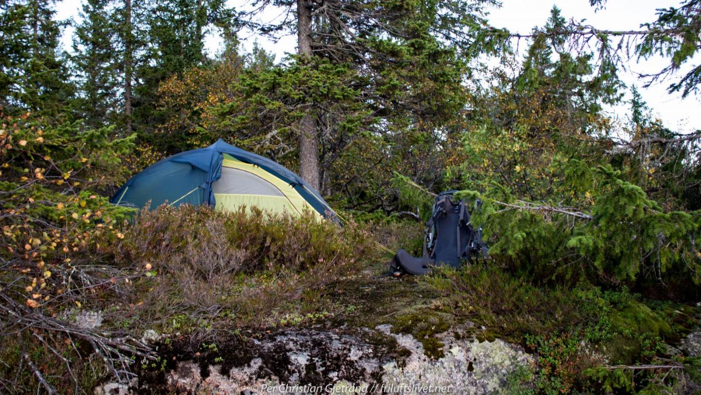 Kort helgetur på Skrim med Tintin Klikk her for å lese hele innlegget på bloggen! Fredag 9. September hadde jeg tatt meg fri for å dra på tur alene. Bare Tintin og jeg på en skikkelig kosetur. Eneste plan var å gå noen kilometer for å komme litt bort fra det meste trafikerte området. Utrolig deilig å kunne reise ut fredags morgen og komme frem midt på dagen i stedet for å etablere leir i mørket. Jeg reiste opp til parkeringen på Omholt og rundt halv elleve var jeg i gang. Planen var å ikke ha noen stor plan, men jeg hadde på forhånd tenkt å gå litt utenfor de merkede stiene. Det er et godt merket stinett på Skrim og det er ganske sølete og stor slitasje. Det bærer rett og slett preg av at mange bruker dette området. Her er det mange hytter, mange dagsturister og ettersom friluftslivet har fått seg et kraftig oppsving de siste årene også mange med vandresekk på ryggen. Fredag formiddag var det imidlertid ikke så mange å se. De eneste jeg traff var et par med en hund som satt og spiste ved Omholtseter. Vel oppe den egentlig eneste stigningen satte jeg meg ned og slappet av litt ved minnesmerket fra andre verdenskrig. Vi hadde god tid og det var godt og varmt. Passet derfor fint med en liten vannpause her. Minnesmerke hedrer Tor Stenersen som ble skutt etter et fluktforsøk fra Akershus Fengsel. På plaketten kan man lese: "Hoppet ned i fallskjerm her på Skrim den 17. nov. 1943 kl. 2 natt med de første flybårne våpenlaster til Mil.org. distr. 15 Vestfold. Arrestert efter heltemodig kamp med gestapo. Skutt under fluktforsøk fra Akershus fengsel den 2-4-1944". Fint å kunne minnes våre falne helter på denne måten. Minnemerke for Tor Stenersen, fra andre verdenskrig Etter minnesmerket ligger vanna på rekke og rad. Først ut er Fjellsetertjernet som jeg har vært ved flere ganger tidligere. Fin leirplass der, men den ligger litt nær stien. Denne helga ville jeg være i fred og nyte stillheten. Jeg tråkket videre og kom forbi Øyungen. Også her ligger det fine leirplasser vet jeg, men jeg fortsatte mot Krokvannet og hadde vel egentlig bestemt meg for å forlate stien her for å se hvordan det var i den sørøstre enden av vannet. Dette er det største vannet på Skrim og jeg tror den sørlige enden er lite besøkt, ettersom det ikke går merket sti nedover. Jeg vil gjerne ha en litt bortgjemt, men vestvendt plass slik at jeg får nyte sola helt til den gikk ned. Først fulgte jeg vannet sørover, men det ble fort vanskelig å ta seg frem. Jeg søkte derfor litt opp i høyden og gikk sørover på høyden på østsiden av vannet. Flott utsikt og ikke et menneske å se! Varm i toppen! Det er 20 grader i lufta og sekken er velfylt Etter litt opp og ned og gjennom ganske tett kratt finner jeg en flott plass på en liten høyde over vannet. Her har det vært folk før, men bålrestene viser at det må være en god stund siden. Jeg tar raskt avgjørelsen om at leitingen er over. Her blir jeg. Det er fin bålplass og minst tre fine steder jeg kan sette opp teltet. Klokka er bare ett, sola steiker og livet går i slow motion. Teltet kan vente litt. Jeg setter opp Helinox-stolen, tar av støvlene og setter meg godt til rette med en kald halvliter. Skal si det smaker i varmen! Hva smaker vel bedre enn en kald halvliter i varmen? Her blir jeg sittende et par timer og bare nyte sol og varme. Utrolig deilig og varmt til å være godt ute i September. Tintin koser seg også I firetida finner jeg frem brenneren og koker opp vann til en middag. Jeg gjør det enkelt på solotur. Frysetørret funker helt fint og er lett å bære. Jeg bytter på litt og har vel snart prøvd de fleste rettene fra REAL, Mountain House og Adventure Foods. Alle har retter som smaker godt, men noen er definitivt bedre enn andre. Denne gangen har jeg tatt meg meg en såkalt "Jegergryte" fra Trek ´n Eat. Ny variant jeg ikke har prøvd før, så det kan jo slå begge veier. Gryta består for det meste av pasta, litt storfekjøtt, krydder og tørket fersk champignon i generøse, store biter. Smaken var overraskende god og mengden var passe til at jeg ble god og mett. Disse skal jeg helt klart prøve flere av. Forholdsvis rimelige er de også. God og mett er det tid for å få opp teltet. Alltid greit å ha det oppe før mørket nærmer seg. I tillegg ble jeg døsen av pils og middag. Jeg er jo på kosetur, så jammen skal jeg og Tintin ta en time på ryggen før kvelden kommer. Finfin teltplass i lyngen med utsikt over vannet Det blir ikke bare en, men to hele timer før vi våkner. Sola står lavere på himmelen og det er tid for å sanke litt ved til bålet. Det er tydelig at dette ikke er den mest besøkte plassen ved Krokvannet. Her er det rikelig med tørr furu å forsyne seg av. Etter en kort halvtime med saga har jeg nok ved til kvelden. Jeg finpusser litt på bålplassen som allerede er etablert. Ingen grunn til å lage en ny når det allerede er en fra før. Jeg stabler bare opp noen steiner rundt for å unngå spredning til lyngen. Veden er knusktørr og vi har raskt et fint lite furubål. Deilig! Kvelden går raskt med bålkos og litt fotografering utover kvelden. Det skyer dessverre litt på og det blir ingen spektakulære solnedgangsbilder denne gangen. Uansett er det deilig å bare være tilstede. Høre på stillheten og nyte varmen fra bålet. Bålkos! Rundt halv elleve begynner det å blåse opp ganske kraftig. Vi rydder sammen og trekker inn i teltet. Fiskingen får vente til i morgen. Lørdag morgen våkner jeg av den umiskjennelige lyden av regn på teltduken. Pokker og! Det var ikke meldt før til kvelden og jeg hadde håpet på en rolig dagstur i området, fisking og bålfyring. Jeg åpner teltdøra og ser ut i en vegg av tåke. "Uværet" må ha kommet tidligere enn meldt. Jeg og Tintin gjør vår fornødne raskt før vi trekker tilbake i teltet. Morgenkaffen blir definitivt innendørs. Jeg rydder et av forteltene og tar sjansen på å fyre opp bensinbrenneren inne. For å gjø