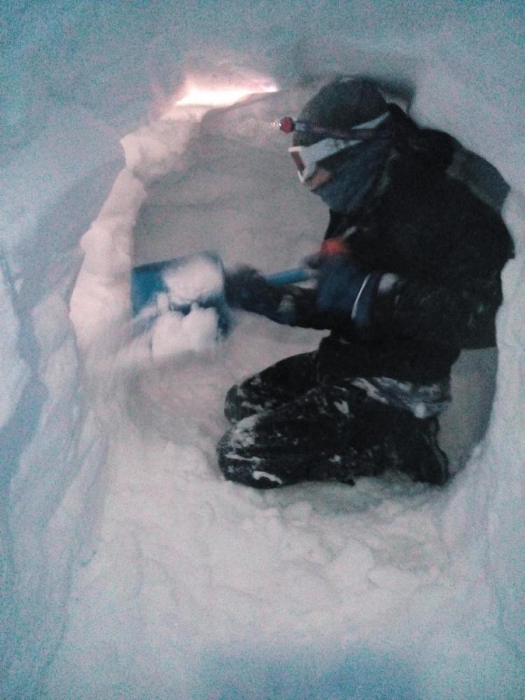 Tirsdag 29. desember reiste jeg og ungene til Hallingskeid i 4 dager. To gutter på 12 og 16. Vi la oss inn på Dnt hytten og hadde som plan å gå litt på ski, samt at guttene skulle grave sin egen snøhule og overnatte i den. Været var langt fra det beste, med ca. 22-25 m/s og snøflyk. Men onsdagen begynte vi å grave på omgang inn i en stor snøskavl nedenfor hytten. Han på tolv var svært entusiastisk og spadde i vei mens han planla hvordan hulen skulle bli. Vi erfarte at det var tre forskjellige hardhetsgrader på snøen vi gravde ut, og at vi hele tiden måtte være to som spadde. En inni hulen og en i utgangen som spadde snøen videre ut. Det ble et par timers graving som fortsatte nyttårsaften. Og etter pinnekjøttet var spist, kort var spilt og snop fortært tok de med seg soveposene, liggeunderlag, pute og varmeflakser og la seg i snøhulen. Jeg dekket åpningen 3/4 med et snøbrett og forseglet det med snøblokker. Endelig skulle de sove i snøhule, noe de hadde gledet seg til lenge. Stormen raste utenfor, men inni snøhulen var det nesten helt stille. Veldig rart. Hodelykt og noe isolerende å ha under knærne når du graver er smart. Photos (1).zip
