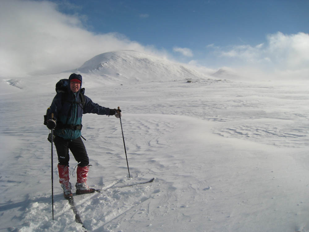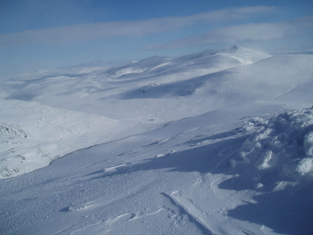 Etter å ha kikket på yr.no hele uken så det ut som om det var en mulighet for bra vær på fredag. Planene var at Odd Arne skulle få sin første nye topp dette året. Han nærmer seg slutten på samlingen sin og Ryggjehøe sto igjen i dette området. Jeg hadde heller ikke denne toppen og jeg så også en mulighet for å lure med meg han videre opp til Leirhøe og Spiterhøene...ikke helt uvillig faktisk. Etter å ha ankommet Spiterstulen i snøvær og vind,- så var ikke akkurat optimismen veldig stor. En av fjellvettreglene sier jo at "Det er ingen skam å snu". Vel, - vi ville gjøre et forsøk og langet i vei oppover nær den vanlige ruten mot Glitterheim. Det snødde og vi hadde vinden rett i mot. Heldigvis sluttet det å snø da vi nærmet oss toppen av den første lange stigningen. Optimismen steg og vi rundet sørover og fikk vinden i ryggen. Solen kom også selvom den ikke varmet så mye.... Vi så Ryggjehøe langt der framme og det så rimelig vindfullt ut der oppe. Selv følte jeg, da sikten ble bedre, at kanskje vi skulle gjøre et forsøk også på den opprinnelige planen. Det var å fortsette mot Veoskardet etter å ha vært på Ryggjehøe. Den muligheten så også Odd Arne positivt på, men etter å ha møtt diverse "djevler" på vei opp mot Ryggjehøe slo vi dette fra oss. Vinden var svært kraftig på vei mot toppen og vi holdt på å bli kastet i bakken et par ganger. På selve toppunktet var faktisk vinden noe spakere, men intet sted for lunch...... Vi valgte derfor å returnere til Spiterstulen og hele turen tok ca 6 timer. Det var trått føre og med en god del nysnø som hadde samlet seg i små fonner hele veien som gjorde det noe tungt å gå. Likevel...vi nådde toppen og hadde en frisk tur i vinterfjellet. MEN, nå savner vi vårsola og muligheten for å sette seg ned å kose seg med mat og drikke. Det var ikke lett idag!