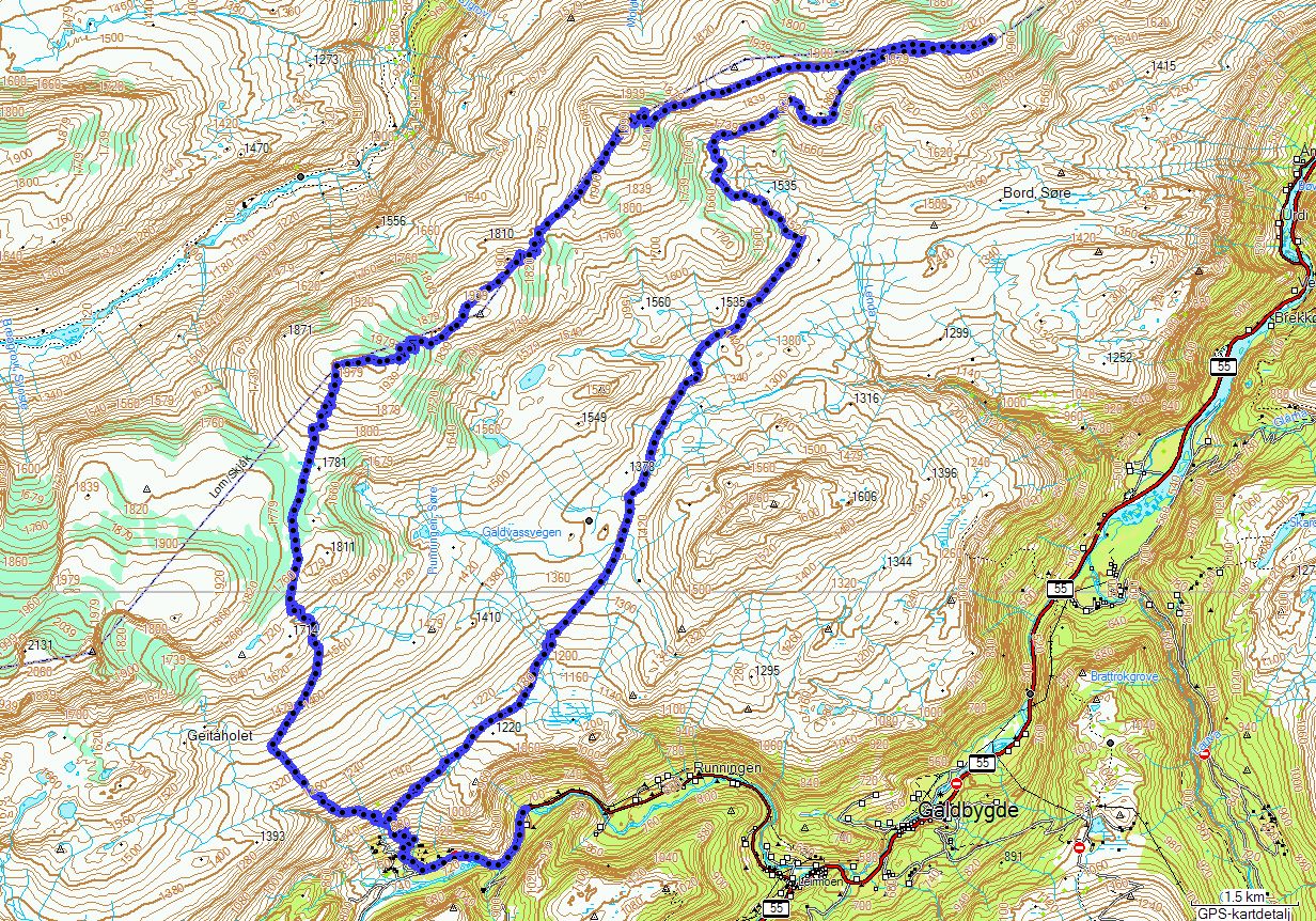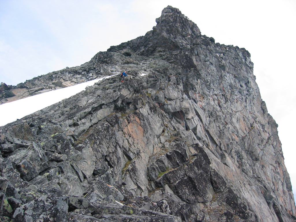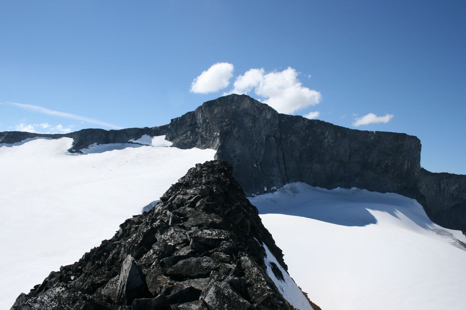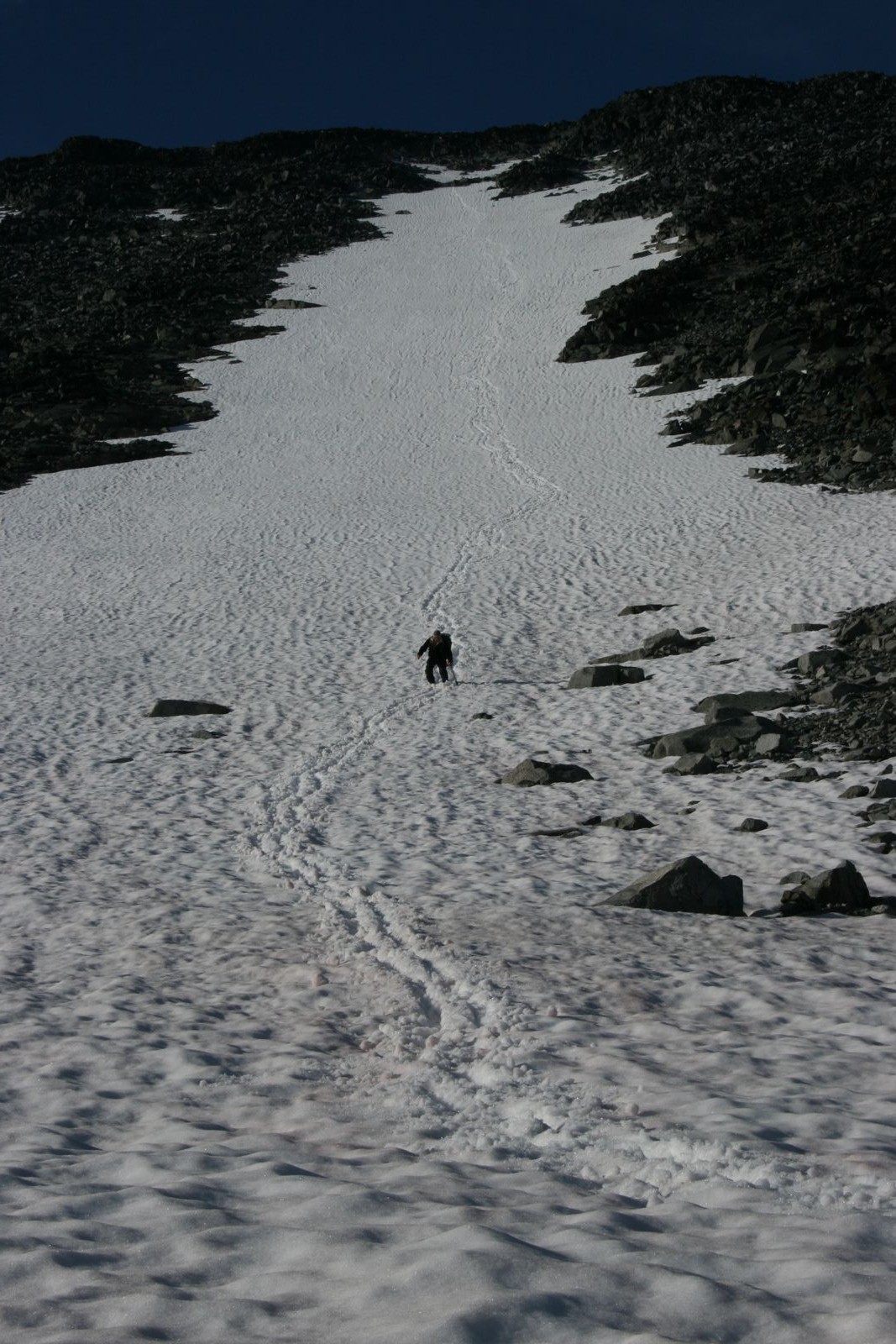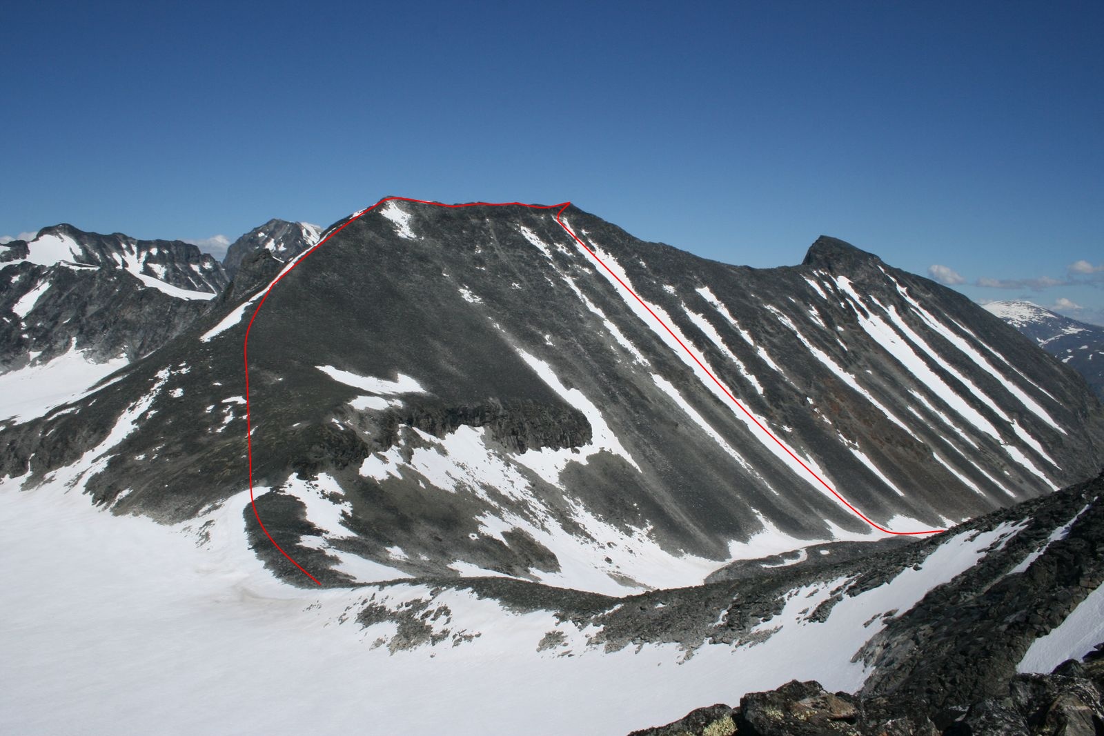 Fordi det ikke ble noe av vårskituren til disse toppene, ble det bestemt at denne traversen skulle tas i ferien. Askogvoll og jeg hadde planlagt denne turen i lang tid og vi hadde foretatt noe research vedrørende brepassasjer, hamre osv. Den "normale" ruta er vel å gå fra Leirvassu og inn Kyrkjeglupen for så å gå opp på Søre Bukkeholstind. Derfra plukker man topper som perler på en snor og avslutter traversen med Bukkehøe og Bukkehøe Nord for så å gå ned mot Geitsetri. Denne ruta er lang nok den....men vi ville gjerne ha med oss de Nørdre Bukkeholstindene og avslutte med Stygghøes to topper! Altså hele 18 topper med smått og stort. Startstedet vårt ble derfor Spiterstulen for så å avslutte med topp 47.1 Stygghøe Øst (2200moh) for så å gå ned ved Bukkeholsbekken. En drøy tur dette og innerst inne var jeg usikker om det ble for langt... Vi startet litt etter kl 0600 fra Spiterstulen og gikk raskt innover den lange Visdalen. Etter ca 1,5 time sto vi ved elva der vi skulle krysse over for å begynne oppstigningen til Søre Bukkeholstind. Lang transportetappe inn hit...hele 8km. Været var meget bra og litt svak vind som gjorde godt i sola. Likevel svettet vi fælt mens vi slet oss oppover kneikene mot toppen. Askogvoll er halvparten så gammel som meg så jeg måtte stå på for å si det slik...en utålmodig 24 åring Høydemeter etter høydemeter ble forsert og snart ble det bare gøy klyving bortetter ryggen. Askogvoll var rastløs så lange pauser ble det ikke på denne turen. Topp etter topp ble besteget på denne artige ryggen nodvestover. Etter å ha kommet til topp 74.1 Bukkeholstind V1 (2166moh) må jeg si at det så jævlig langt ut til Bukkehøe og vi skulle enda lenger...200 høydemetere ned til Bukkehøe Nord. Jeg var nesten bestemt for å droppe disse toppene og gå kun på de Nørdre Bukkeholstindene. Mat og drikke ble fortært og beina føltes bra og det var bare å trå til... Sekken ble lagt igjen da været var bra og kun rompetaske med ei flaske ble tatt med. Turen til Bukkehøe Nord og faktisk helt ut til punkt 2078 moh nord for denne og tilbake tok faktisk 3t45m. Bakkene opp mot Bukkehøe var tunge, men kroppen fungerte faktisk veldig bra. Vi gledet oss nå faktisk til de Nørdre Bukkeholstindene. Stigningen opp mot Stygghøe så hard ut fra avstand, men skulle vise seg og bli en meget artig og trivelig avslutning på en tur med mange bakker... Vi "listet" oss over brepassasjen mellom topp 74.1 og topp 87.0 Nørdre Bukkeholstind. Traversen videre østover var veldig grei ved slike tørre fine forhold vi hadde denne dagen. Den bratte hammeren opp mot topp 87.2 Nørdre Bukkeholstind Ø2 ble for sterk kost for oss, og vi rundet denne ut på breen for så å gå lett opp fra sør. Denne hammeren så nesten utoverhengende ut . Det så ut som det var greie tak, men greit å gå rundt synes nå vi da... Klyvingen opp mot Stygghøe var overrskende moro og satt en ekstra spiss på turen. Det kan jo ha noe med at det var de siste høydemeterne denne lange dagen. Hele 2800 høydemetre kjentes i beina. Heldigvis fikk vi akt oss ned på snøen ned fra Stygghøe Øst ned mot Visdalen. Det å krysse elva var ikke greit, men suget etter en kald øl var stort og vi tok bare sats og vasset raskt over elva. Våt helt oppå til låra, men hva gjør vel det når det blir hviledag dagen etter? Etter 15,5 timer og ca 3,5 mil var vi tilbake til Spiterstulen. En lang og spennede tur med mye artig klyving på tørt fjell! Anbefales!!! -