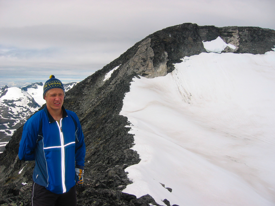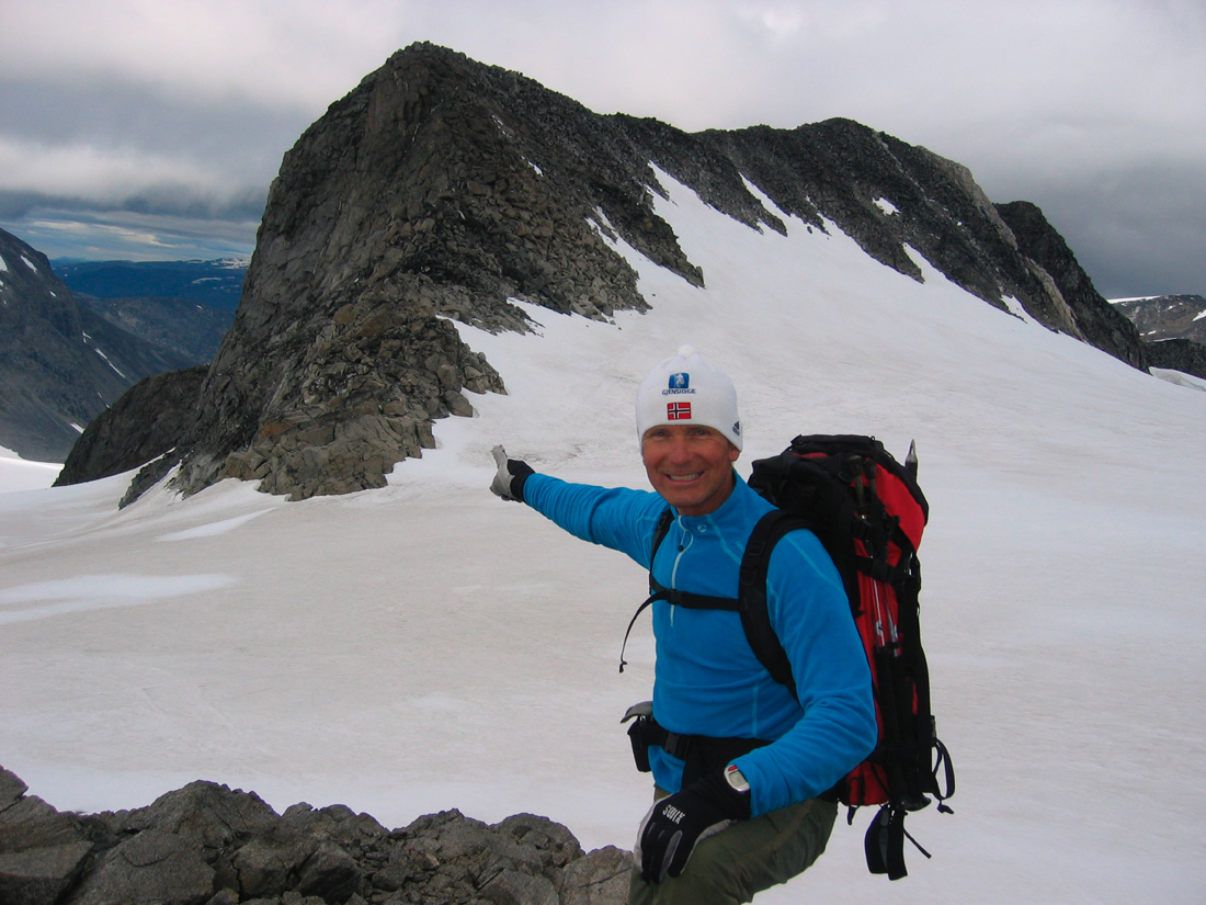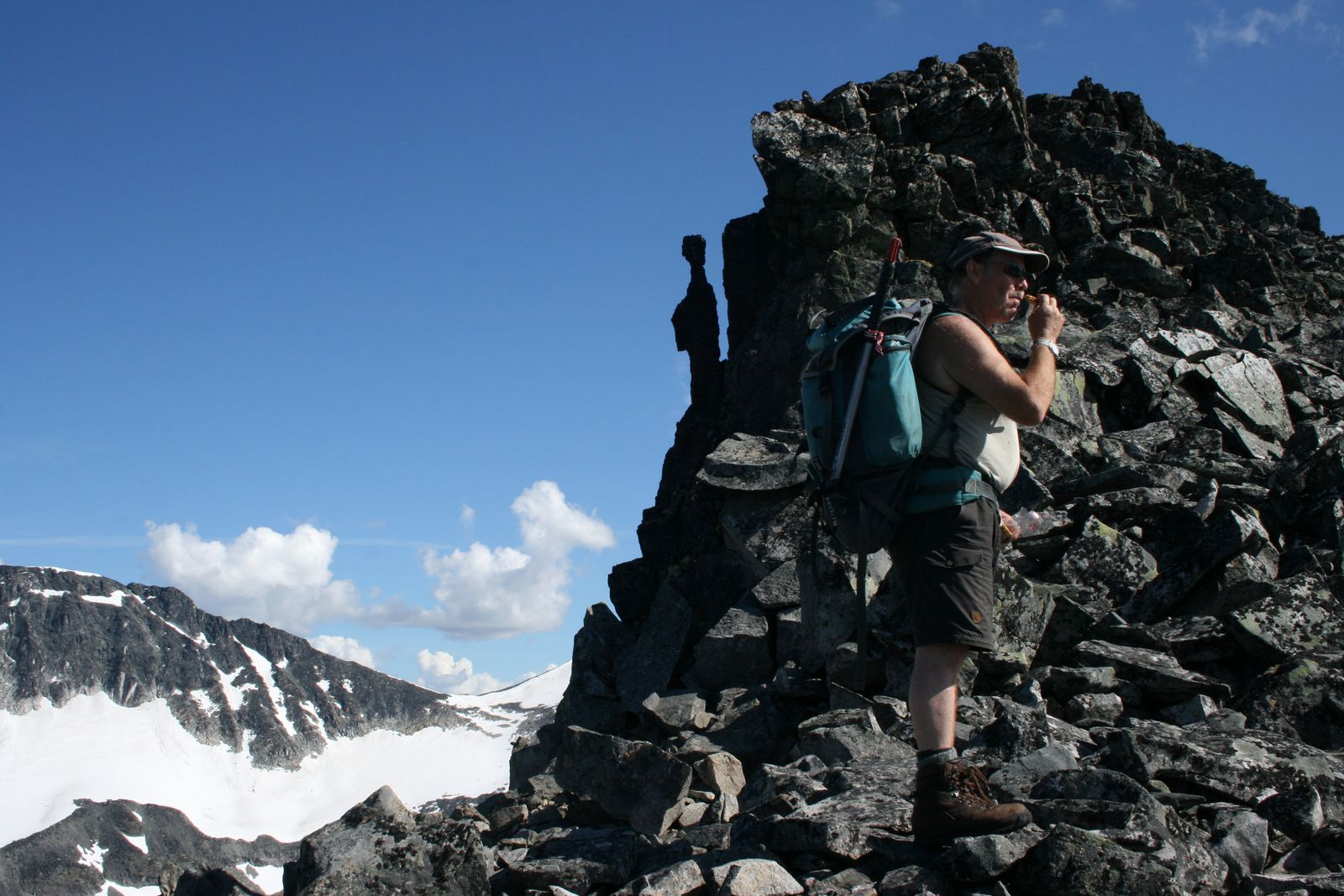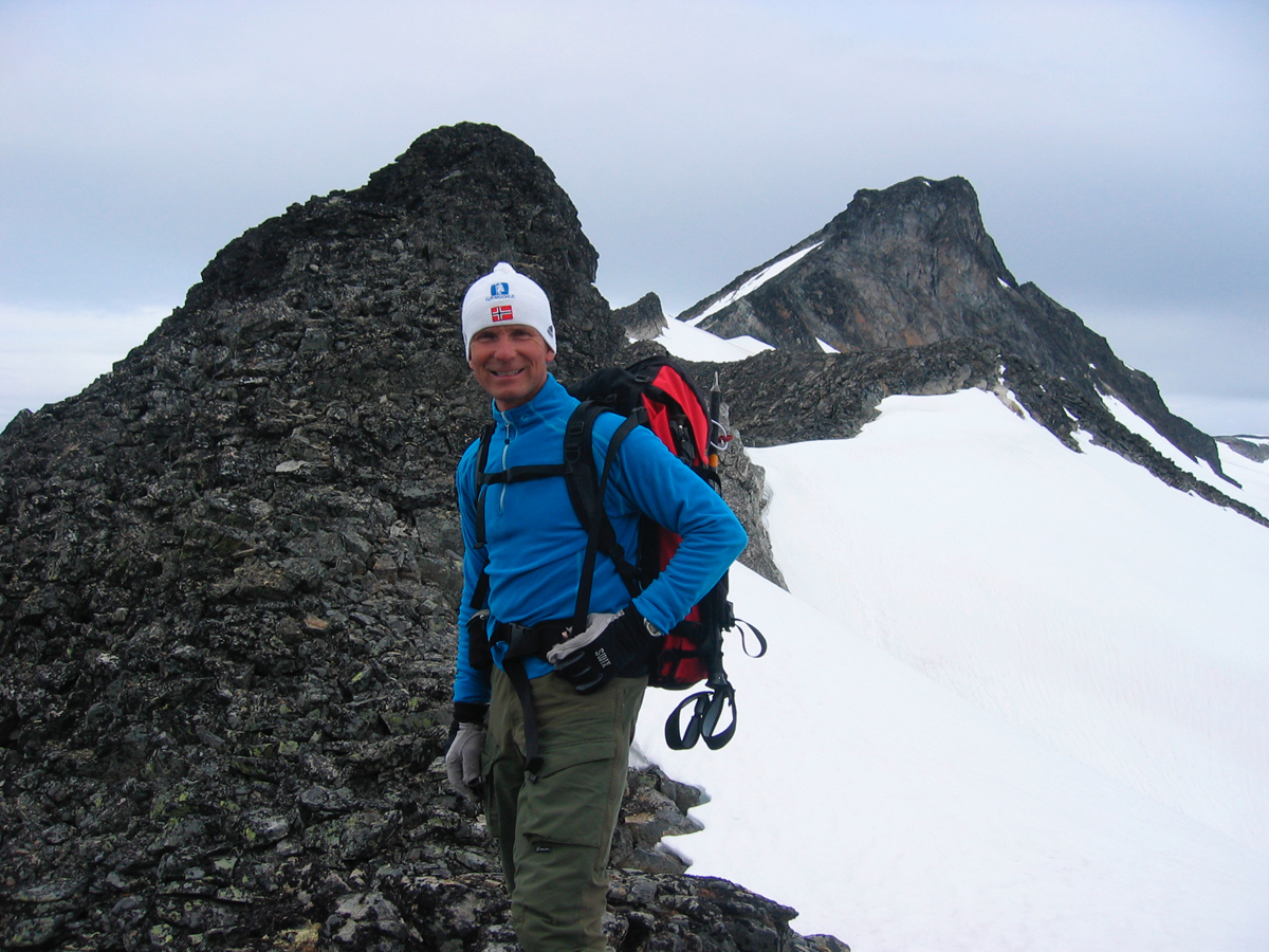 Endelig ble det tid for årets ferietur, noe som betydde nye fjellopplevelser, og forhåpentligvis nye 2000-metre. Planen var at jeg, sammen med foreldrene mine, skulle tilbringe en ukes tid i Visdalen i Jotunheimen, med et telt oppe i dalen som base. Herfra skulle vi gå på så mange topper som formen og været tillot. Vi hadde ingen klare planer for hver dag, og ingen tidsrammer, bortsatt fra at vi måtte begynne å snu nesen hjemover etter en ukes tid. Etter å ha studert værmeldinga nøye i tida før vi dro, viste det seg at dette kom til å bli ei uke med knallvær. På tirsdag ble bilen pakket, og vi satte kursen sørover i solskinnet. Vi nådde Spiterstulen rundt kl. 6, og etter to transportetapper (hadde jeg da visst hvor lite av utstyret jeg kom til å få bruk for hadde vi nok greid det med én) fram og tilbake fra bilen, hadde vi etablert leiren i lia ovenfor Gamelsætre. Onsdag: Leirhøe Den første turdagen opprant nokså gråere enn dagen før, med skydotter rundt de høyeste toppene, men etter hvert ble det mer og mer blå himmel. Vi ble enige om å starte med en enkel topp som alle tre ble med på: Leirhøe. Det ble avgang litt over kl. 9, og vi begynte å trave opp den bratte lia langs Leirgrove. Denne ble etter hvert krysset, og vi fortsatte opp til ca. 1600 moh, før vi svingte til høyre og fulgte den brede ryggen opp mot Leirhøe. Hittil hadde været vært fint, men nå begynte skodda å komme sigende, og når vi kom opp i 2000 meters høyde, var det lite sikt å snakke om. Her var det også snø hele veien til toppen. Vi hadde brukt god tid opp, og nådde ikke toppen før kl. halv 2, med bare snø og skodde å se rundt oss. Videre ble vi enige om å gå via Veoskardet ned igjen. Her måtte vi forsere en nokså bratt snøbakke, før jeg tok en avstikker opp på Leirhøe Sør. Denne lå under skodda, så jeg hadde en fin utsikt mot Veobrean, Veodalen og toppene rundt. Deretter gikk vi ned steinura til Hellstugubreen og fulgte stien langs Hellstuguåe tilbake til leiren. Oppsummering: 2 nye 2k-topper etter 8 t. og 15 min. på tur. Torsdag: Urdadalsryggen Denne dagen våknet vi til blå himmel over Visdalen - nydelig turvær! Vi ble enige om å prøve på første del av Urdadalsryggen i dag, altså opp til Store, videre til Midtre og retur via Semelholet. Det ble forholdsvis sen start i dag; kl. 9.45 begynte fader’n og jeg å traske opp dalen langs DNT-stien. Vi passerte Urdadalsbekken før vi begynte å skrå oss opp mot ryggen til Store Urdadalstinden. Det ble etter hvert mange høydemeter, og det ble nokså slitsomt i varmen. Vi kom etter hvert til ei bratt snøfonn, som vi lett kunne ha gått rundt i steinura, men, mest for å få prøvd utstyret, tok vi på stegjern og isøks og gikk strake veien opp. Etter hvert ble det bedre og bedre utsikt mot Hellstugutinder, Bukkeholstinder, Kyrkja og selvsagt Visdalen. Videre opp på ryggen, omtrent der den begynner å svinge mot sør-sørøst, ble det smalere, så vi holdt oss en god del på vestsiden av ryggen her, hvor vi måtte ta hendene til hjelp flere steder, men det var langt fra vanskelig under de optimale forholdene vi hadde. Toppen ble nådd kl. 14.30, og vi kunne nyte den flotte utsikten i hjertet av Jotunheimen. Videre fortsatte vi greit ned ryggen mot Midtre. På vei ned ryggen fikk vi plutselig høre et brak, og fikk se noen store steiner i full fart på vei ned noen snøfonner ned mot Semelholet! Forskrekkelsen ble enda større da vi oppdaget at det gikk folk like ved der steinene stoppet!! De fikk seg sikkert en real støkk etter den opplevelsen… Dette skjedde et godt stykke foran oss på ryggen, så jeg antar at vi kan renvaske oss selv for å ha utløst det, men etter dette ble vi langt mer oppmerksomme på hvor vi plasserte føttene. Før vi begynte stigninga opp til Midtre, traff vi på den etter hvert så kjente karen som står her med ryggsekk og lue. Det tar vel ei stund før han finner veien til toppen... Videre til Midtre ble det en del klyving, men også her var det greit nok å komme til toppen, og vi ble belønnet med nok en nydelig utsikt. Klokka nærmet seg nå 17, og vi begynte på returen ned til Semelholet, hvor isen på Semelholstjønne så ut til å ha sprukket opp betydelig mer i løpet av denne varme dagen. Nedi steinura var det, som raset tidligere på dagen hadde vist, en god del løst, men med en god porsjon forsiktighet gikk det bra. Vi benyttet oss også av noen snøfonner, som sparte oss for mye tid. Nede i Semelholet gikk det greit ned til Visdalen, og vi gikk derfra tilbake langs stien til leiren. Under kryssinga av Urdadalsbekken presterte jeg å skli på en av steinene, med det resultat at skoene ble søkkblaute til resten av returen. Oppsummering: 2 nye 2k-topper etter 11 t. og 10 min. på tur. Fredag: St. Tverråtind Fortsatt finvær, så dagens plan var å gå over Tverråtindene, fra Midtre til Store. Også i dag ble det sen start: kl. 10.15 begynte vi å gå og krysset kloppa over Visa, som ikke lå lenger enn 300-400 meter unna leiren. Herfra gikk vi et stykke nedover dalen før vi fortsatte inn i Tverrådalen langs Tverråe. Denne skulle vise seg å være veldig stor, og etter flere forsøk på å steingå den, måtte vi endre planen. Vi baserte nå på å krysse elva lenger oppe i dalen, for så å sette kursen for Store Tverråtind. Men vi fant raskt ut at å steingå elva ikke ble noe enklere lenger oppe, så det ble til at vi måtte vade den like under brekanten, hvor den er splittet i flere løp og har forholdsvis lite strøm. Det var en heller kald opplevelse! Etter å ha fått tørket føttene på en solvarm stein på den andre siden, bega vi oss opp mot Nedre Tverråbandet. Noen steder tok vi sjansen på å gå et lite stykke ute på breen, da spor fra den samme dagen gikk her. Like før Tverråbandet bestemte jeg meg for å gå oppom Lindbergtinden, mens fader’n gikk opp til Tverråbandet. Her var det ei nokså bratt snøfonn, men snøen var veldig grei 