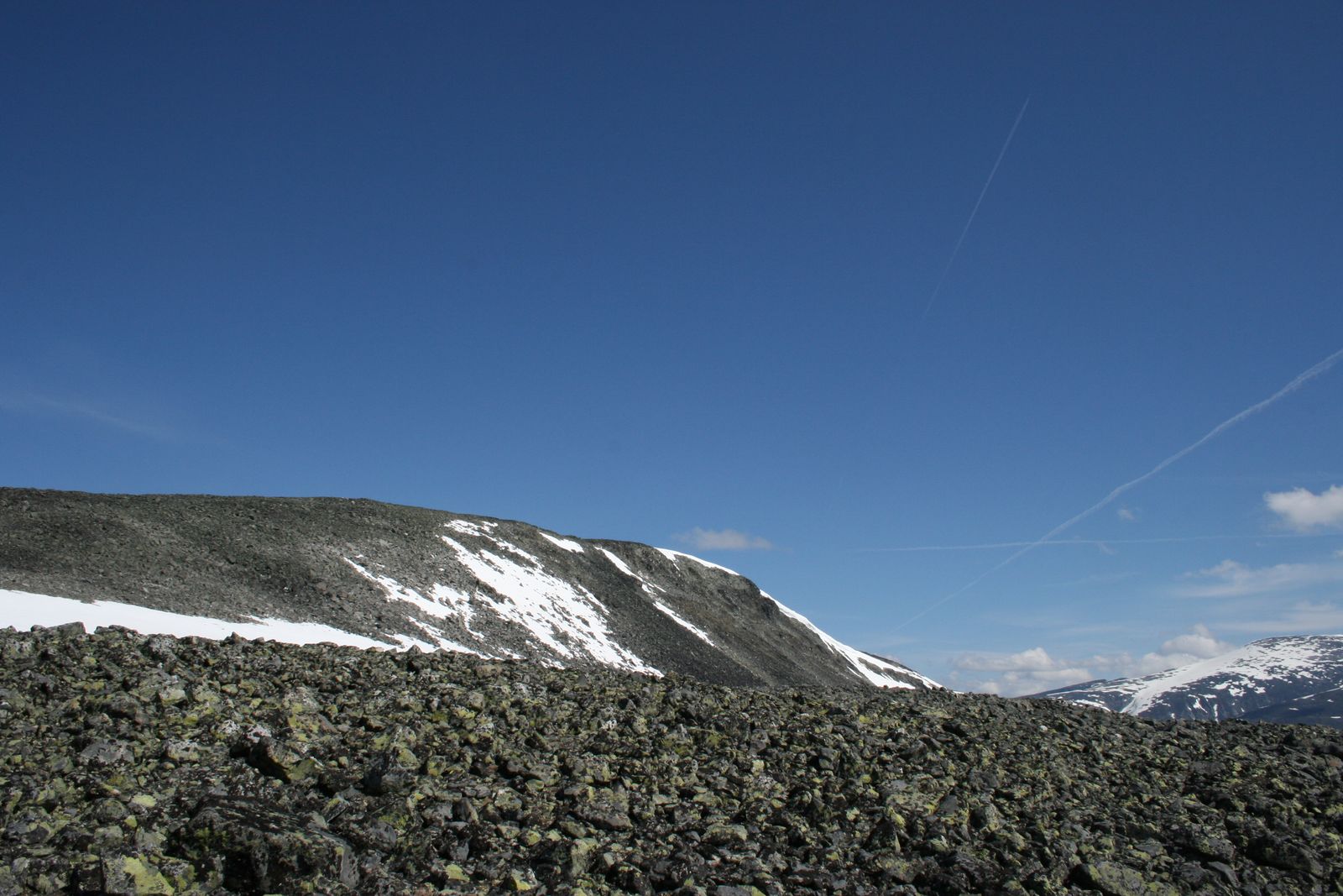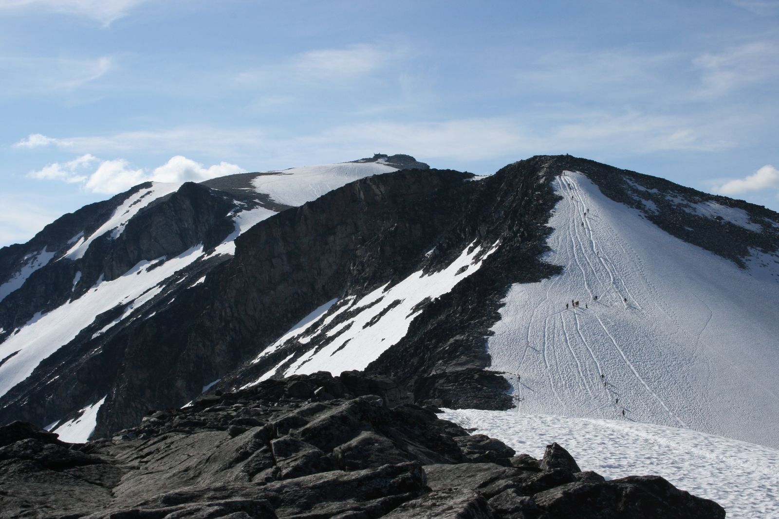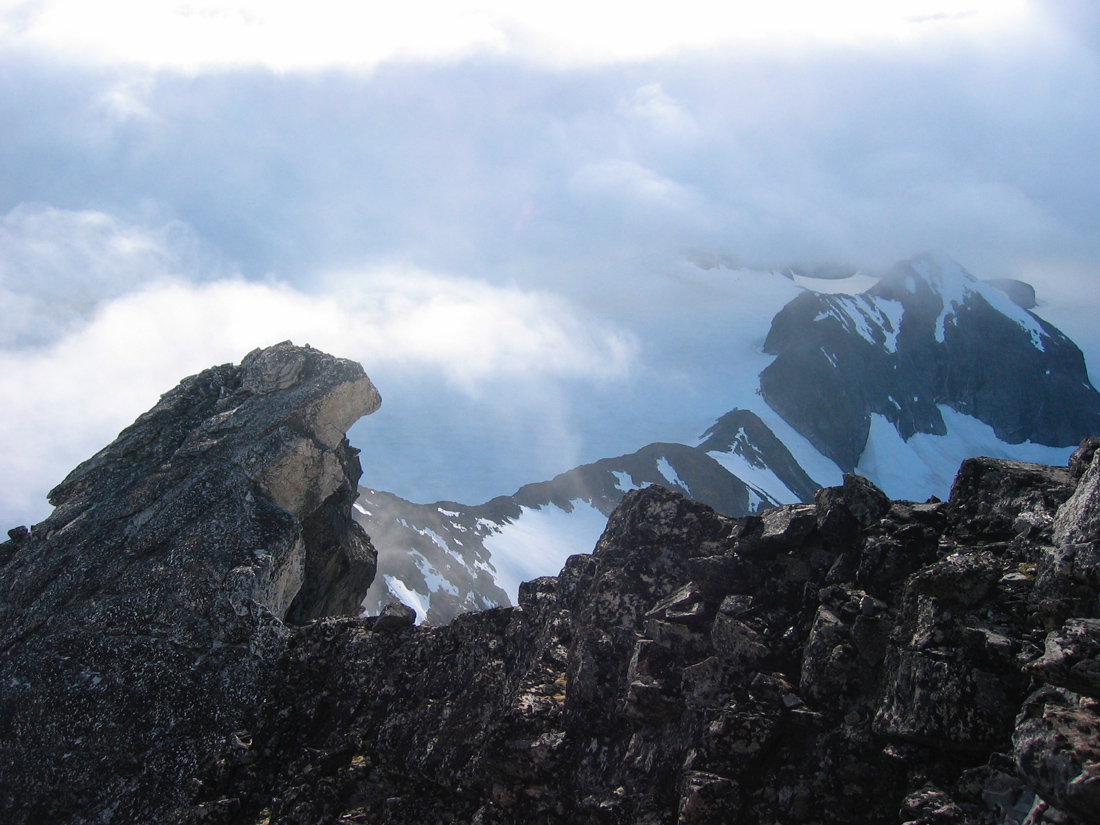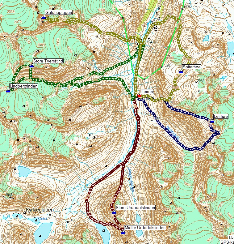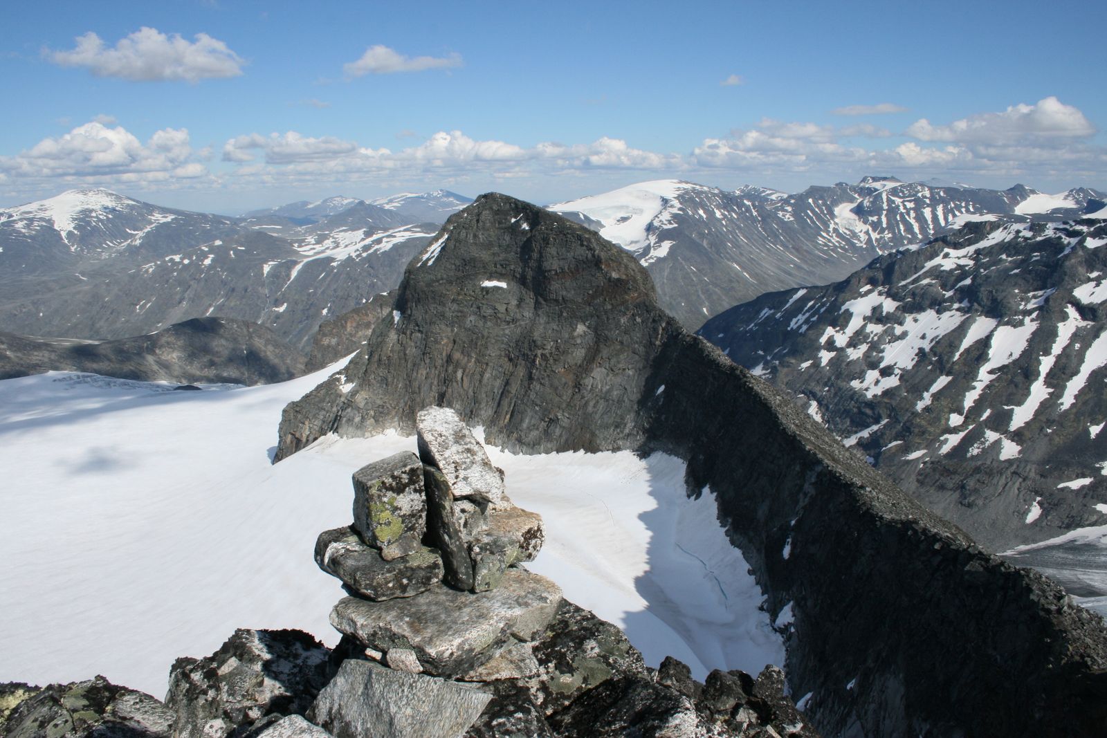 Endelig ble det tid for årets ferietur, noe som betydde nye fjellopplevelser, og forhåpentligvis nye 2000-metre. Planen var at jeg, sammen med foreldrene mine, skulle tilbringe en ukes tid i Visdalen i Jotunheimen, med et telt oppe i dalen som base. Herfra skulle vi gå på så mange topper som formen og været tillot. Vi hadde ingen klare planer for hver dag, og ingen tidsrammer, bortsatt fra at vi måtte begynne å snu nesen hjemover etter en ukes tid. Etter å ha studert værmeldinga nøye i tida før vi dro, viste det seg at dette kom til å bli ei uke med knallvær. På tirsdag ble bilen pakket, og vi satte kursen sørover i solskinnet. Vi nådde Spiterstulen rundt kl. 6, og etter to transportetapper (hadde jeg da visst hvor lite av utstyret jeg kom til å få bruk for hadde vi nok greid det med én) fram og tilbake fra bilen, hadde vi etablert leiren i lia ovenfor Gamelsætre. Onsdag: Leirhøe Den første turdagen opprant nokså gråere enn dagen før, med skydotter rundt de høyeste toppene, men etter hvert ble det mer og mer blå himmel. Vi ble enige om å starte med en enkel topp som alle tre ble med på: Leirhøe. Det ble avgang litt over kl. 9, og vi begynte å trave opp den bratte lia langs Leirgrove. Denne ble etter hvert krysset, og vi fortsatte opp til ca. 1600 moh, før vi svingte til høyre og fulgte den brede ryggen opp mot Leirhøe. Hittil hadde været vært fint, men nå begynte skodda å komme sigende, og når vi kom opp i 2000 meters høyde, var det lite sikt å snakke om. Her var det også snø hele veien til toppen. Vi hadde brukt god tid opp, og nådde ikke toppen før kl. halv 2, med bare snø og skodde å se rundt oss. Videre ble vi enige om å gå via Veoskardet ned igjen. Her måtte vi forsere en nokså bratt snøbakke, før jeg tok en avstikker opp på Leirhøe Sør. Denne lå under skodda, så jeg hadde en fin utsikt mot Veobrean, Veodalen og toppene rundt. Deretter gikk vi ned steinura til Hellstugubreen og fulgte stien langs Hellstuguåe tilbake til leiren. Oppsummering: 2 nye 2k-topper etter 8 t. og 15 min. på tur. Torsdag: Urdadalsryggen Denne dagen våknet vi til blå himmel over Visdalen - nydelig turvær! Vi ble enige om å prøve på første del av Urdadalsryggen i dag, altså opp til Store, videre til Midtre og retur via Semelholet. Det ble forholdsvis sen start i dag; kl. 9.45 begynte fader’n og jeg å traske opp dalen langs DNT-stien. Vi passerte Urdadalsbekken før vi begynte å skrå oss opp mot ryggen til Store Urdadalstinden. Det ble etter hvert mange høydemeter, og det ble nokså slitsomt i varmen. Vi kom etter hvert til ei bratt snøfonn, som vi lett kunne ha gått rundt i steinura, men, mest for å få prøvd utstyret, tok vi på stegjern og isøks og gikk strake veien opp. Etter hvert ble det bedre og bedre utsikt mot Hellstugutinder, Bukkeholstinder, Kyrkja og selvsagt Visdalen. Videre opp på ryggen, omtrent der den begynner å svinge mot sør-sørøst, ble det smalere, så vi holdt oss en god del på vestsiden av ryggen her, hvor vi måtte ta hendene til hjelp flere steder, men det var langt fra vanskelig under de optimale forholdene vi hadde. Toppen ble nådd kl. 14.30, og vi kunne nyte den flotte utsikten i hjertet av Jotunheimen. Videre fortsatte vi greit ned ryggen mot Midtre. På vei ned ryggen fikk vi plutselig høre et brak, og fikk se noen store steiner i full fart på vei ned noen snøfonner ned mot Semelholet! Forskrekkelsen ble enda større da vi oppdaget at det gikk folk like ved der steinene stoppet!! De fikk seg sikkert en real støkk etter den opplevelsen… Dette skjedde et godt stykke foran oss på ryggen, så jeg antar at vi kan renvaske oss selv for å ha utløst det, men etter dette ble vi langt mer oppmerksomme på hvor vi plasserte føttene. Før vi begynte stigninga opp til Midtre, traff vi på den etter hvert så kjente karen som står her med ryggsekk og lue. Det tar vel ei stund før han finner veien til toppen... Videre til Midtre ble det en del klyving, men også her var det greit nok å komme til toppen, og vi ble belønnet med nok en nydelig utsikt. Klokka nærmet seg nå 17, og vi begynte på returen ned til Semelholet, hvor isen på Semelholstjønne så ut til å ha sprukket opp betydelig mer i løpet av denne varme dagen. Nedi steinura var det, som raset tidligere på dagen hadde vist, en god del løst, men med en god porsjon forsiktighet gikk det bra. Vi benyttet oss også av noen snøfonner, som sparte oss for mye tid. Nede i Semelholet gikk det greit ned til Visdalen, og vi gikk derfra tilbake langs stien til leiren. Under kryssinga av Urdadalsbekken presterte jeg å skli på en av steinene, med det resultat at skoene ble søkkblaute til resten av returen. Oppsummering: 2 nye 2k-topper etter 11 t. og 10 min. på tur. Fredag: St. Tverråtind Fortsatt finvær, så dagens plan var å gå over Tverråtindene, fra Midtre til Store. Også i dag ble det sen start: kl. 10.15 begynte vi å gå og krysset kloppa over Visa, som ikke lå lenger enn 300-400 meter unna leiren. Herfra gikk vi et stykke nedover dalen før vi fortsatte inn i Tverrådalen langs Tverråe. Denne skulle vise seg å være veldig stor, og etter flere forsøk på å steingå den, måtte vi endre planen. Vi baserte nå på å krysse elva lenger oppe i dalen, for så å sette kursen for Store Tverråtind. Men vi fant raskt ut at å steingå elva ikke ble noe enklere lenger oppe, så det ble til at vi måtte vade den like under brekanten, hvor den er splittet i flere løp og har forholdsvis lite strøm. Det var en heller kald opplevelse! Etter å ha fått tørket føttene på en solvarm stein på den andre siden, bega vi oss opp mot Nedre Tverråbandet. Noen steder tok vi sjansen på å gå et lite stykke ute på breen, da spor fra den samme dagen gikk her. Like før Tverråbandet bestemte jeg meg for å gå oppom Lindbergtinden, mens fader’n gikk opp til Tverråbandet. Her var det ei nokså bratt snøfonn, men snøen var veldig grei 