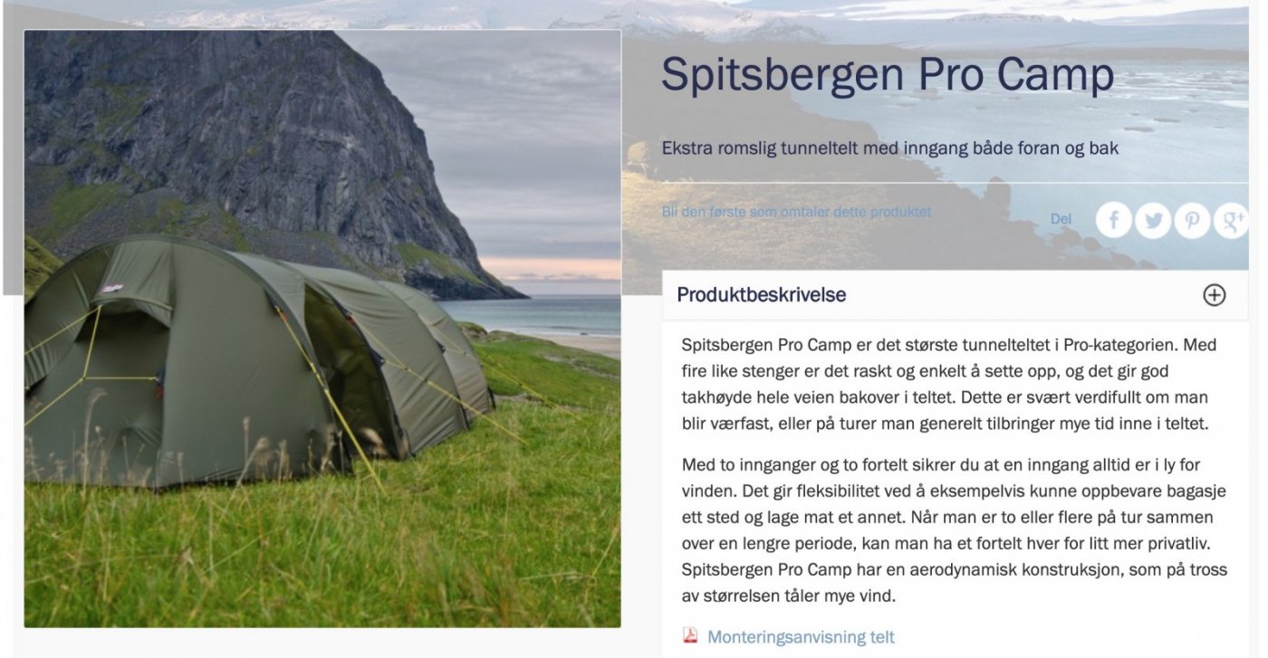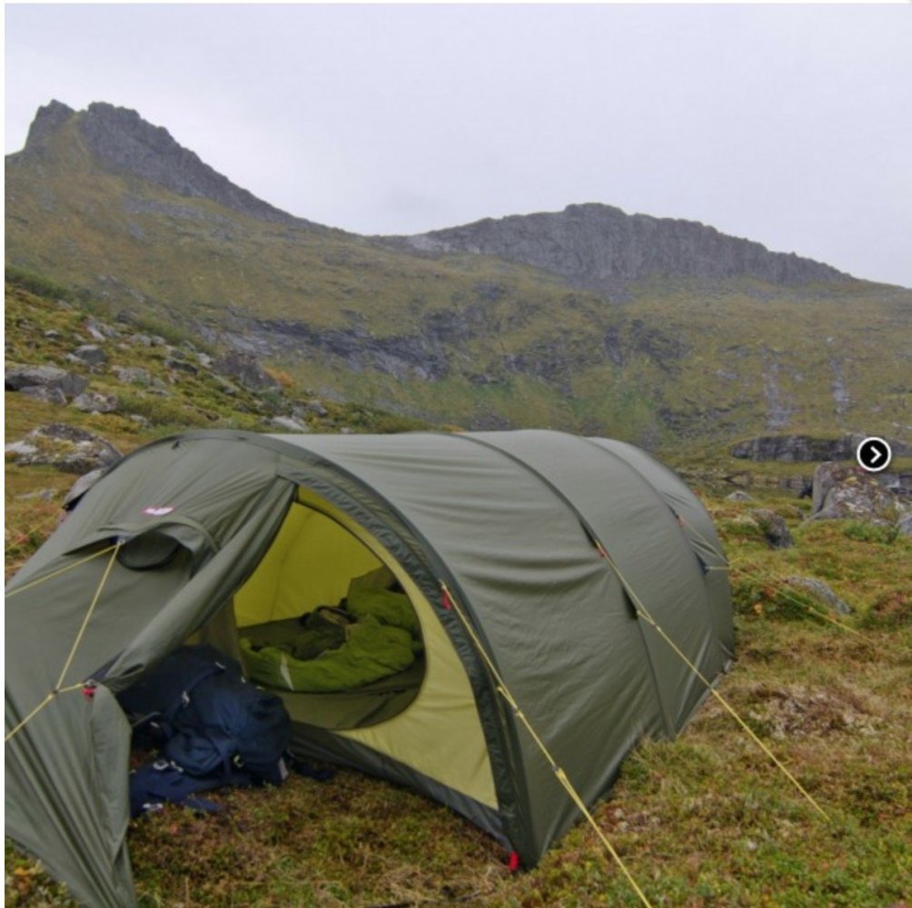 TL;DR. Jeg har kjøpt nytt telt. Her er noen bilder og tanker om teltet jeg tror flere vil sette pris på (skroll ned). Om ikke annet håper jeg bildene kan være til informasjon for dem som vurderer dette teltet selv. Jeg har lenge vært på utkikk etter et telt som kan passe for alle turene hvor mitt SL-telt ikke egner seg. Mine kriterier har vært et telt som kan brukes året rundt, med god plass i ytter- og innertelt og en kvalitet/styrke som kan tåle det meste av vær og vind. Teltet kommer i hovedsak til å brukes av meg, kjæresten og vår hund. Helst to innganger og et innertelt med jevnt god høyde, med vertikale vegger i liggeretningen. Vekt har (med andre ord) ikke vært hovedprioritet. Keron-teltene til Hilleberg har i utgangspunktet vært teltet jeg har erfaring med fra tidligere og har ønsket meg, men dette koster også betydelig mer enn hva jeg har hatt lommebok og hjerte til å avse til et telt. Helsport-teltene er ofte litt lavere priset, og det har virket som det kun er mindre detaljer som skiller disse fra teltene til konkurrenten. Telt fra begge produsenter har vært aktuelle i påvente av et godt tilbud/for stor lommebok. For noen uker siden kom jeg omsider over et tilbud jeg har ventet på: I Helsport sin outlet dukket det opp et Helsport Spitsbergen Camp Pro (3p). Teltet burde på papiret kunne være en god konkurrent til flere av Hilleberg sine 3p tunnelltelt, Keron inkludert, så til prisen jeg fikk det for ble valget lett. Før jeg fant frem Bank-IDen lette jeg etter informasjon om teltet utenom den infoen Helsport ga. Jeg fant få brukererfaringer om teltet, men flere om en tidligere variant (Svea). Denne tråden er ment som en gjennomgang av mine førsteinntrykk av teltet paret med bilder av teltet. Det kan også leses bildeserie av teltets detaljer for dem som eventuelt vurderer et slikt telt selv. Tråden er ikke ment objektiv, og bør leses i lys av bakgrunnen over. Dette er tråden jeg skulle ønske jeg kunne lest før jeg selv kjøpte teltet. Jeg har kun en natt i teltet til nå, så en lengre anmeldelse av teltet får komme om et års tid. NB: Teksten kommer før bildene. -- Telt endrer seg med åra, også dem under samme navn. For klarhet er dette et Spitsbergen Camp Pro med art.nr. 163-120, og merket med 2018/0901. Jeg regner med at teltet er 2018-versjon, hvis ikke en 2019-versjon produsert i 2018. Jeg finner ingen informasjon på at det har vært en endring i dette teltet fra 2018 til 2019. Jeg ble veldig overrasket over hvor kompakt teltet var nedpakket. Kanskje dette er vanlig, og at det er svære 4-mannstelt jeg har i tankene når jeg synes dette var lite. Her er det lagt opp mot et Bamse Extreme liggeunderlag for sammenligning. Teltet får plass ned i storsekken min (Gregory Baltoro 95 Pro) på tvers uten noe særlig problemer. Pakkingen er kun for å illustrere hvor mye plass som er igjen -- sekken er strammet helt inn på toppen, så det er mye å gå på. Jeg har også fått teltet ned på tvers i en eldre versjon av Osprey sin Kestrel 68, dog med litt mer lirking. Teltet går greit gjennom åpningen i bunn av sekken for rask tilgjengelighet på slutten av dagen. Av erfaring liker jeg å pakke teltet delt, og helt til slutt, så jeg får nok ikke mye bruk for akkurat dette selv. Teltposen i seg selv er romslig, men kjekke komprimeringsreimer. Det kunne med fordel vært mulig å stramme disse litt strammere, men jeg tar heller en romslig pose enn en alt for liten en (kremt, Nigor Spix). Slik ser innholdet ut etter jeg har pakket det ut og inn igjen. Teltet kommer fra fabrikk med ytterteltet og innerteltet koblet fra hverandre (standard). Det er en egen pose til teltstengene og pluggene. Det er ett ekstra stangledd, et skjøte-ledd sammen med stengene. Mitt telt kom med én ekstra plugg i tillegg til de som trengs for alle teltets festepunkter. Pluggene som kommer med dette teltet er Helsport sine i mellomsjiktet på 19 cm og 10,8 gram per stk. De er 4 cm lengre og veier litt mer enn Superlight/Trek-pluggene. Jeg kommer nok til å kjøpe et sett med X-trem-pluggene som er en cm lengre og veier over det dobbelte, da disse virker litt lettbøyelige. Stengene er DAC Featherlite NSL-stenger med 35cm segmenter. I posen med plugger finnes rep-kit til teltduken. Oppsett: Teltet oppleves på mange måter likt som alle andre tunnelltelt jeg har prøvd. Ikke noe spesielt mye vanskeligere eller lettere enn f.eks. Hilleberg Keron, Nigor Spix, Helsport Fjellheimen osv. Fest i de to ytterste festene på kortsidene, tre i stengene, stengene i koppene, stram til, løft opp og strekk ut fra motsatt side, fest alle fester. Uten noen særlige etterjusteringer ser det slik ut. Det hele tok ca 13 minutt med rolig tempo alene (med høysnue). Det eneste jeg måtte justere var stangkanalene som endte opp på feil side av skjøten -- det kan være en idé å følge med på det før teltet strammes helt opp ved stangkoppene. Duken går helt til bakken slik den skal på et helårstelt, men i ytterteltene ble det en liten glipe de to gangene jeg har satt opp teltet. Kan hende jeg kunne justert noe for å unngå det. Da jeg satt opp teltet, ble jeg overrasket over at bardunene var festet til teltet med bare ett feste langs sidene av teltet, og fra ventileringsluka på kortsidene. Til dags dato viser både Helsport sine nettsider et bilde av et helt likt telt, men med mange flere fester. På bildene på nettsiden er det doble fester for hver bardun, pluss at festene fra ventilene i kortenden er festet med to ekstra fester. Har lagt ved enda et bilde under, sammen med en faksimile fra Helsport.no i skrivende stund. Også de andre bildene på Helsport.no viser slike fester. Jeg har kun funnet bilder av teltet med bardunfester som mitt telt har i katalogen til Helsport. Jeg vet ikke om det vil ha betydning for bruk og holdbarhet, men synes det er ganske skuffende å måtte møte så store endringer fra annonse til ferdig vare. Teltet ser unektelig litt spinklere ut, selv om d
